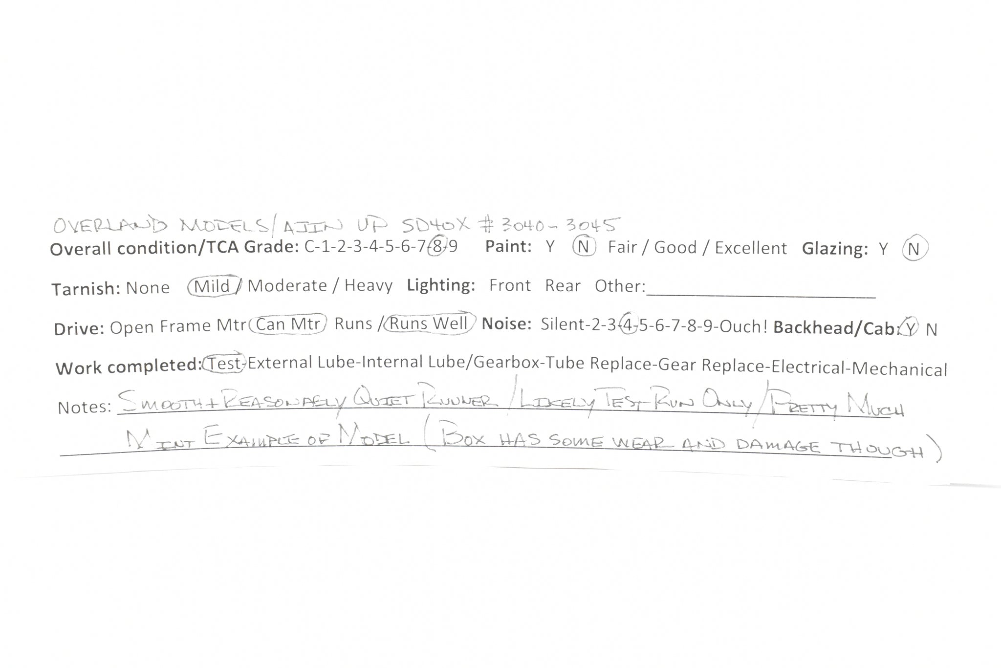 1988 run Overland Models, Inc. Imported model built by Ajin Precision Mfg. in Korea. Original box shows some shelf wear and damage. Spare parts included. The SD40X was an experimental testbed for EMD and the new 645 series prime mover, the 16-645E3, built on a SD35 frame. This particular SD40 has the flared radiators like the SD45. It's an excellent example of Ajin build quality! NOTE: This is a later run tower drive model. A smooth and reasonably quiet runner, this is a harder to find model, with the flared radiators.