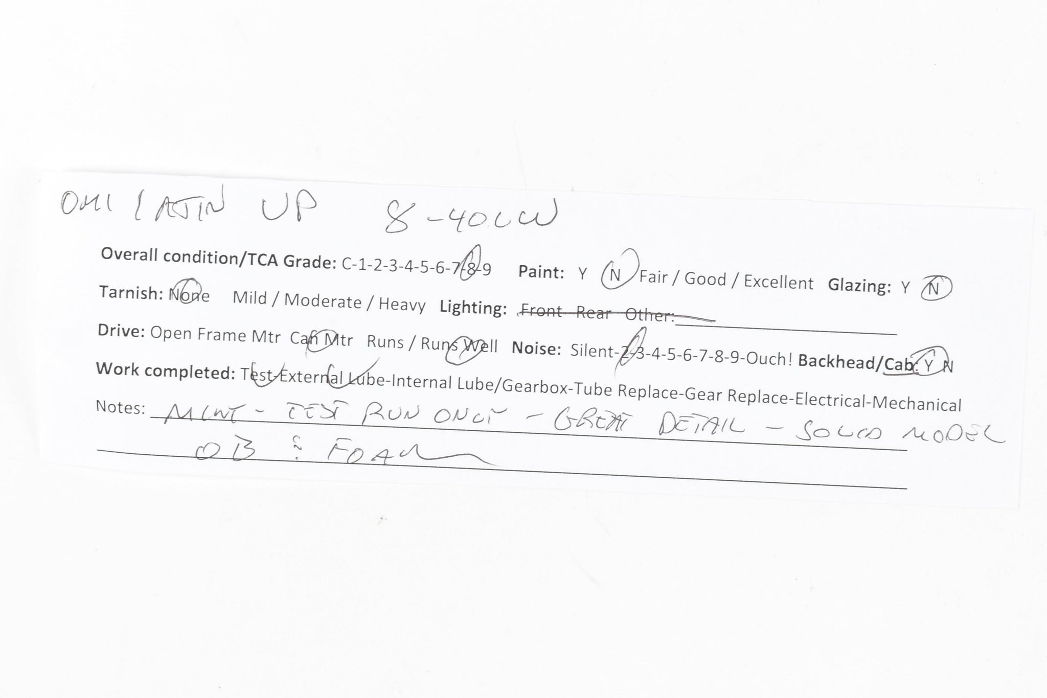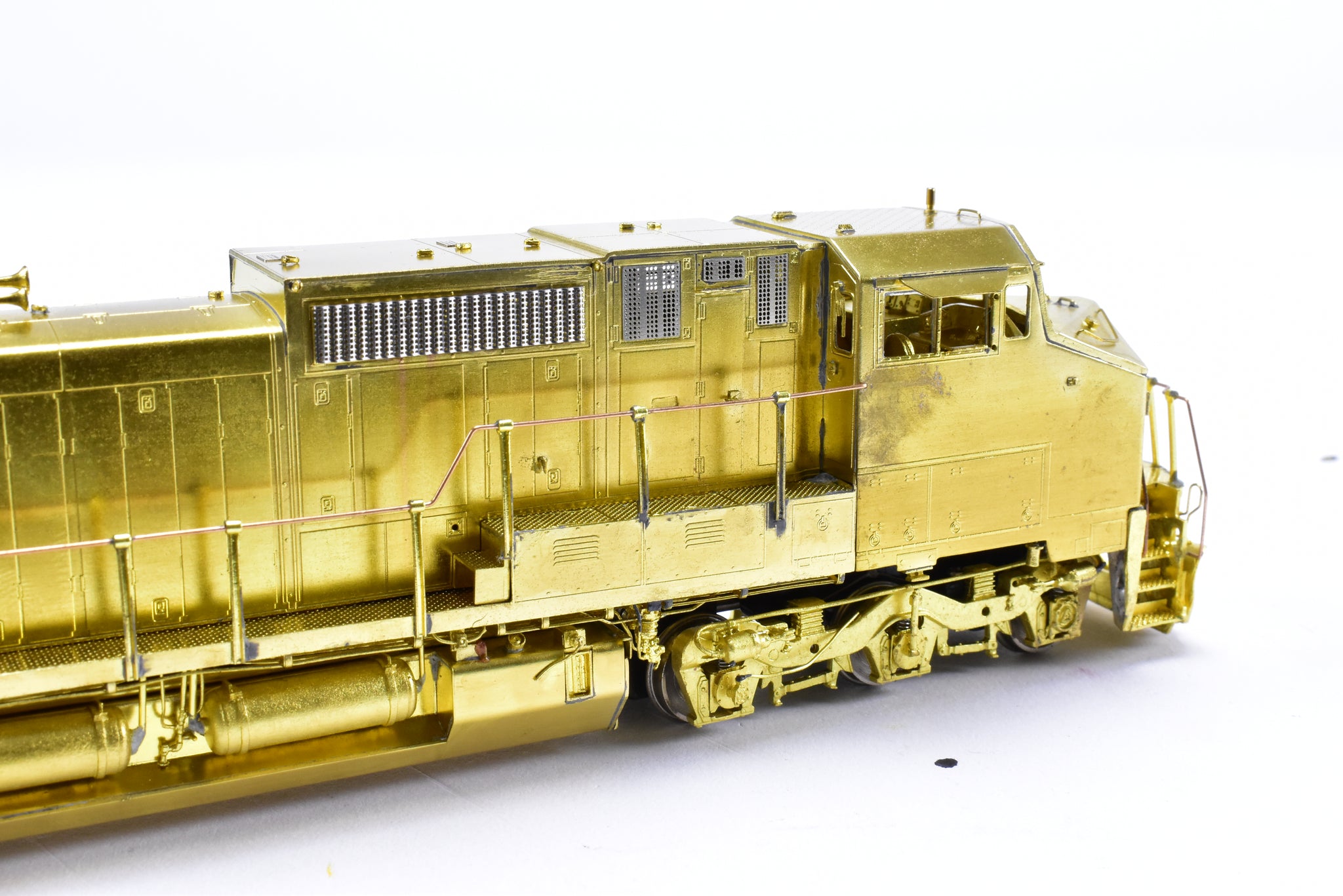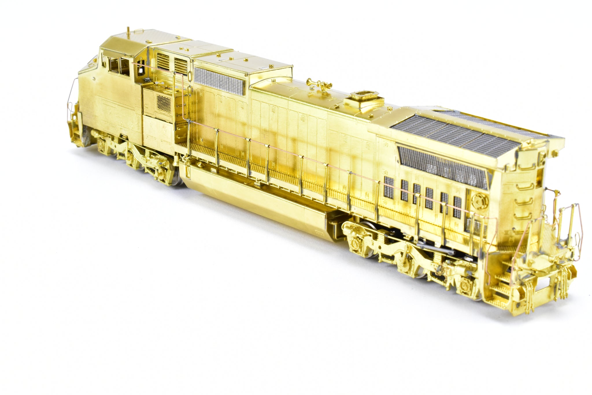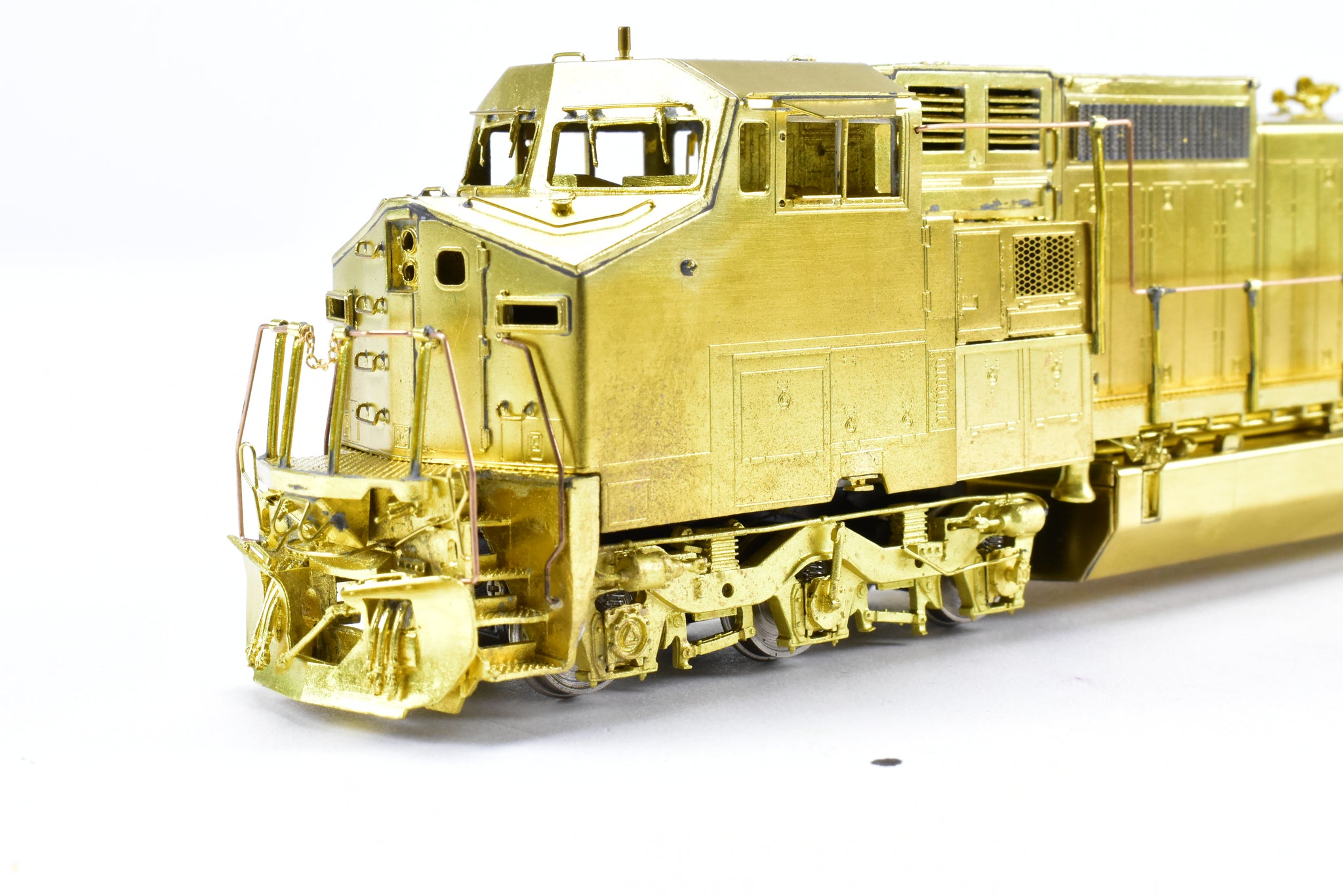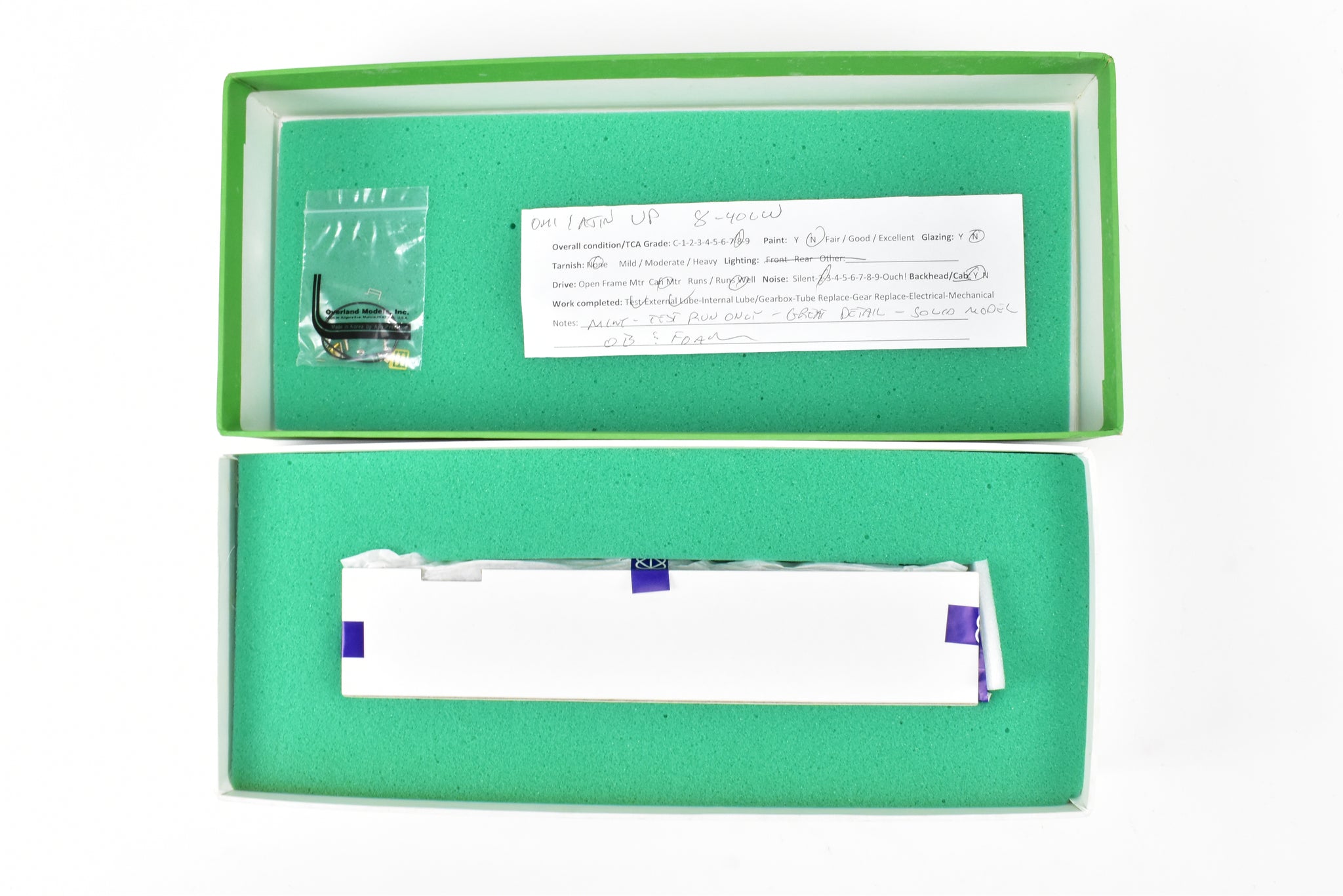 1990 OMI - Overland Models, Inc built by Ajin Precision in Korea. Box shows some shelf wear with minor moisture spots on lid. Spare parts included. Represents Union Pacific's Dash 8-40CW locomotive Nos . 9356 - 9405. A solid, nice looking, smooth running example of this model. Sprung trucks a nice feature.