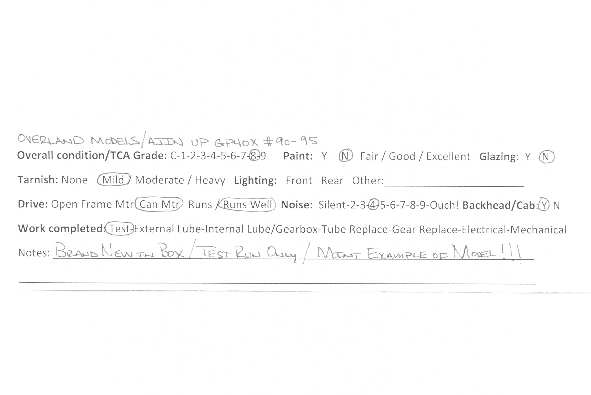 1989 run OMI - Overland Models, Inc imported model built by Ajin Precision Mfg. in Korea. Box shows almost no shelf wear. Spare parts included. Represents Union Pacific Nos. 90 through 95. These GP40X's were a precursor to the 50 series (GP50 and SD50) testing new technologies, such as the HT-B trucks, which improved traction. A like new, smooth running, reasonably quiet version of this model. Later run tower drive version of the model.