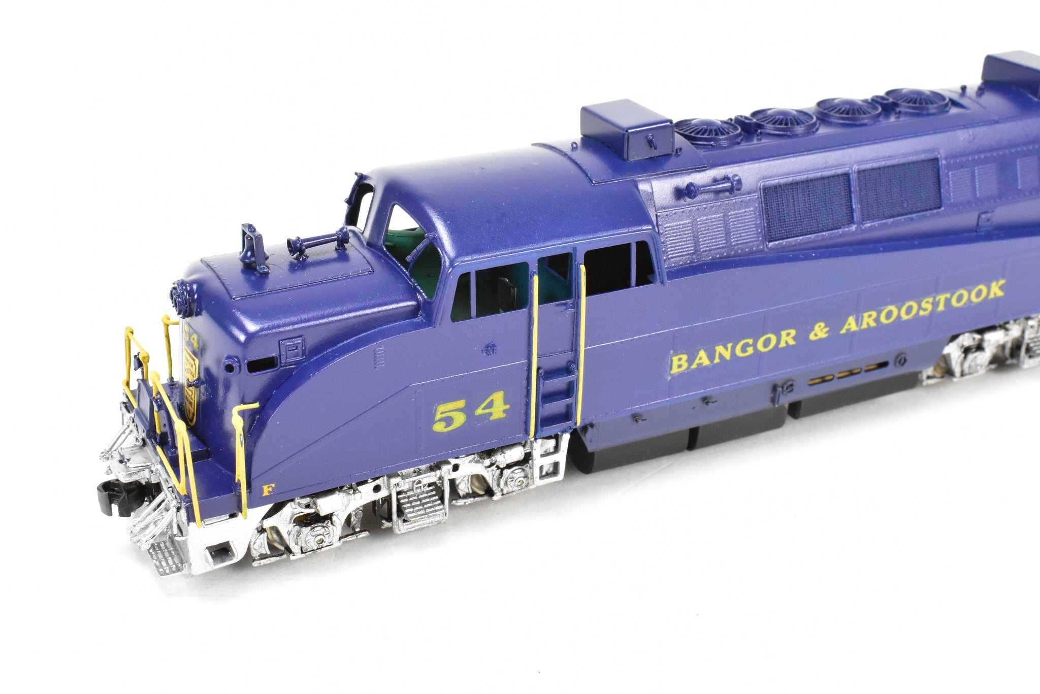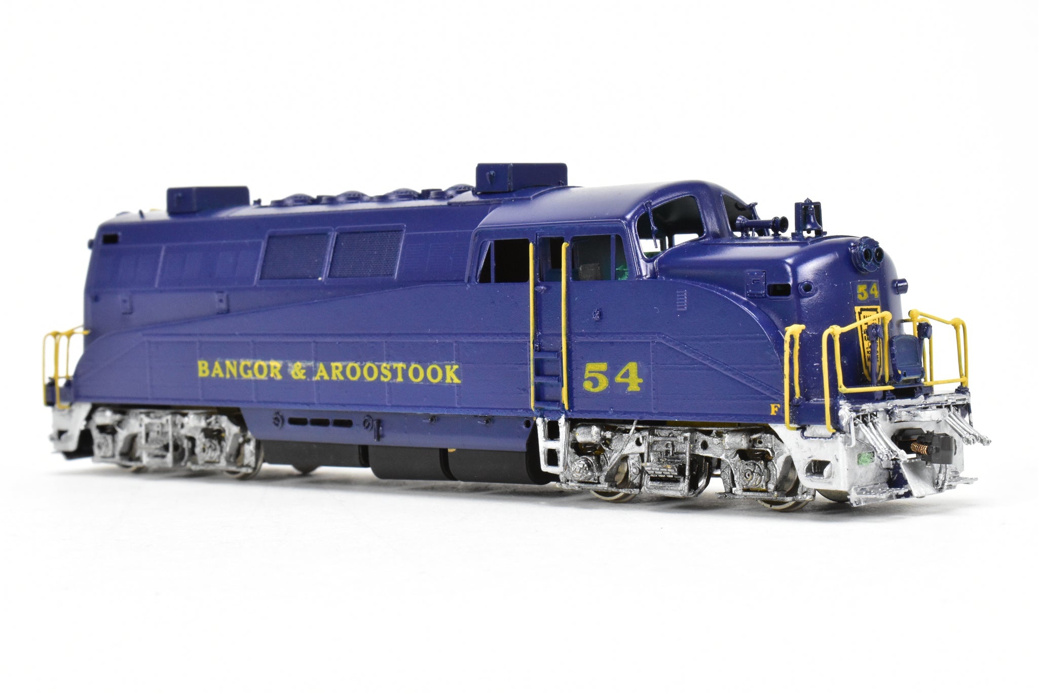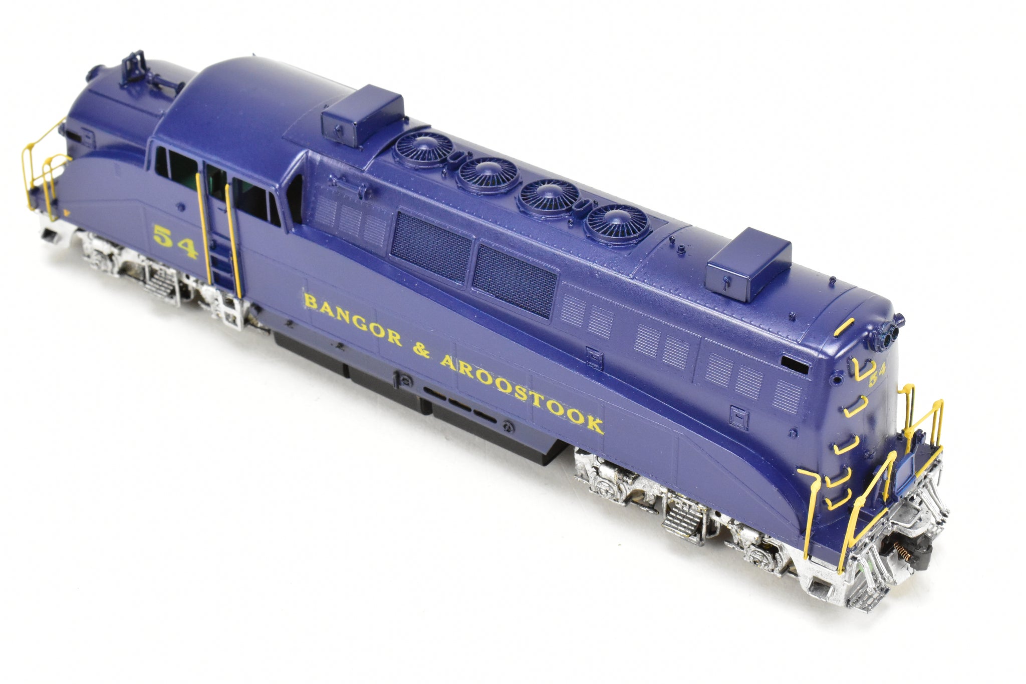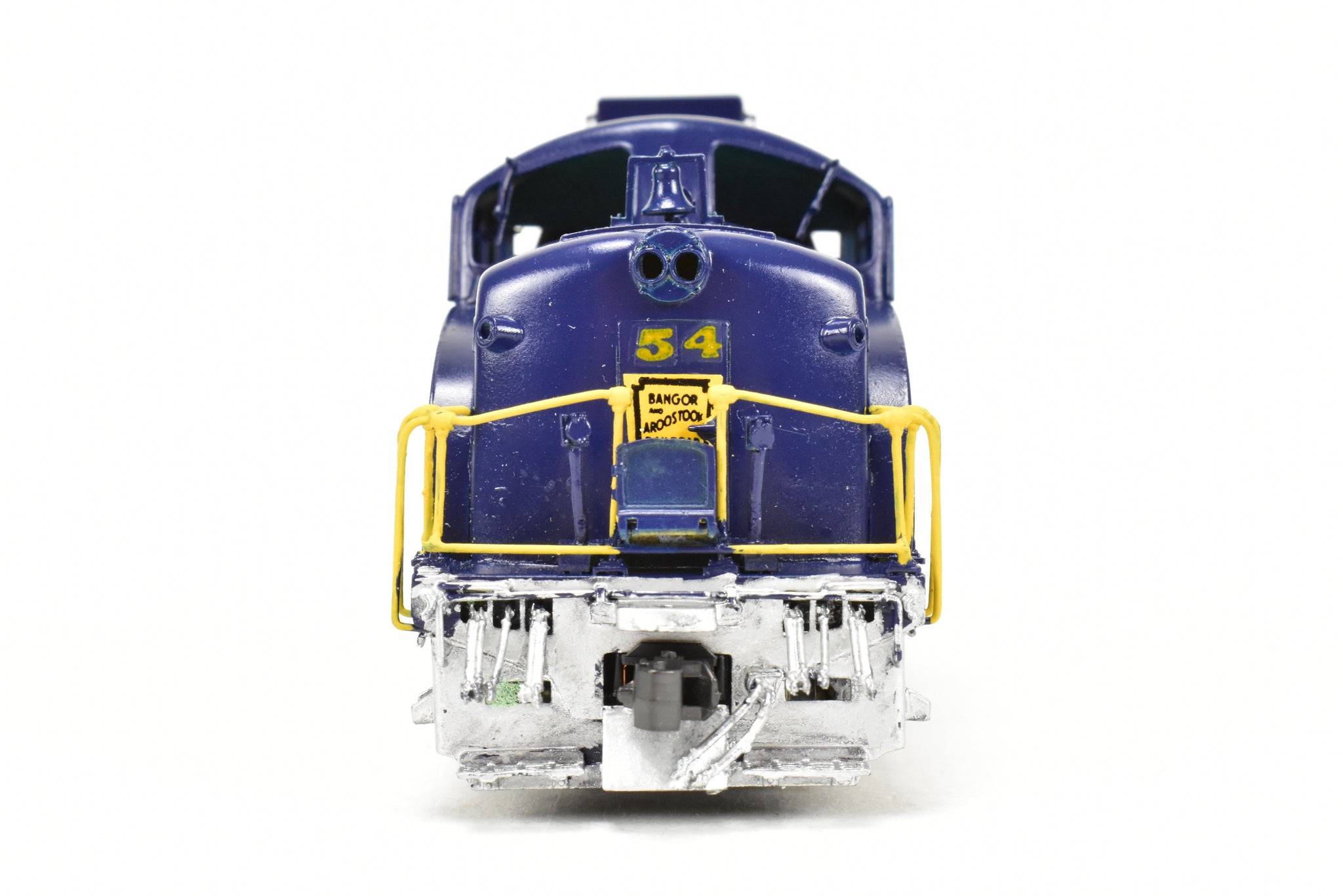 Overland Models, Inc. imported model built by Ajin in Korea. Box shows minimal wear. No spare parts packs included. Note: Runs with a occasional hesitation. Model represents a Bangor and Aroostook BL-2, with solid blue BAR paint and numbered 54. No glazing installed. Paint work is fair, with film on the decals (see photos). Model is set up with dual winterization hatches.