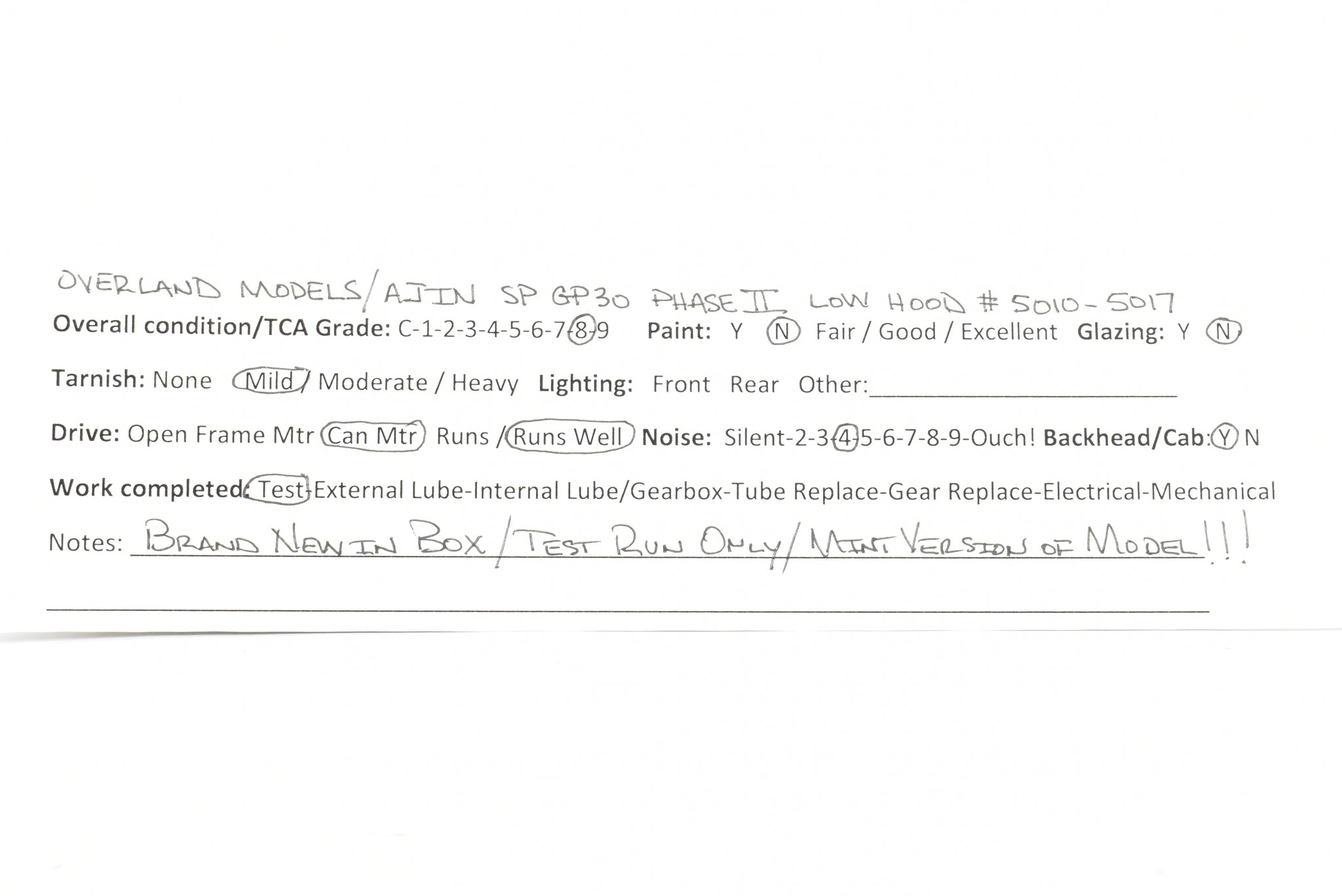 1987 run Overland Models, Inc. imported model built by Ajin Precision Mfg. in Korea. Box shows virtually no shelf wear. Spare parts included. Represents Road Numbers 5010 through 5017. Nice running, reasonably quiet, tank drive model. This model was pretty much new in the box, likely test run only. Harder to find, as only 25 models of this version were imported.