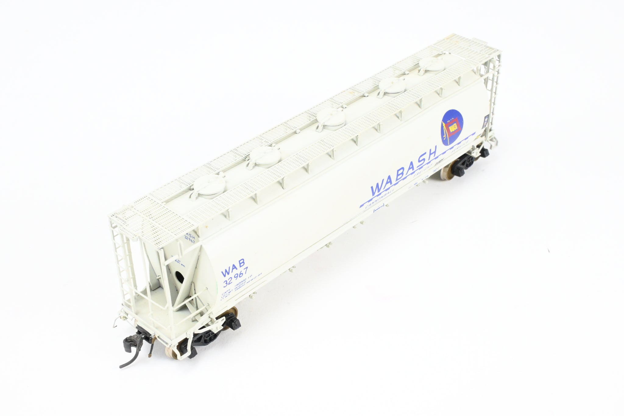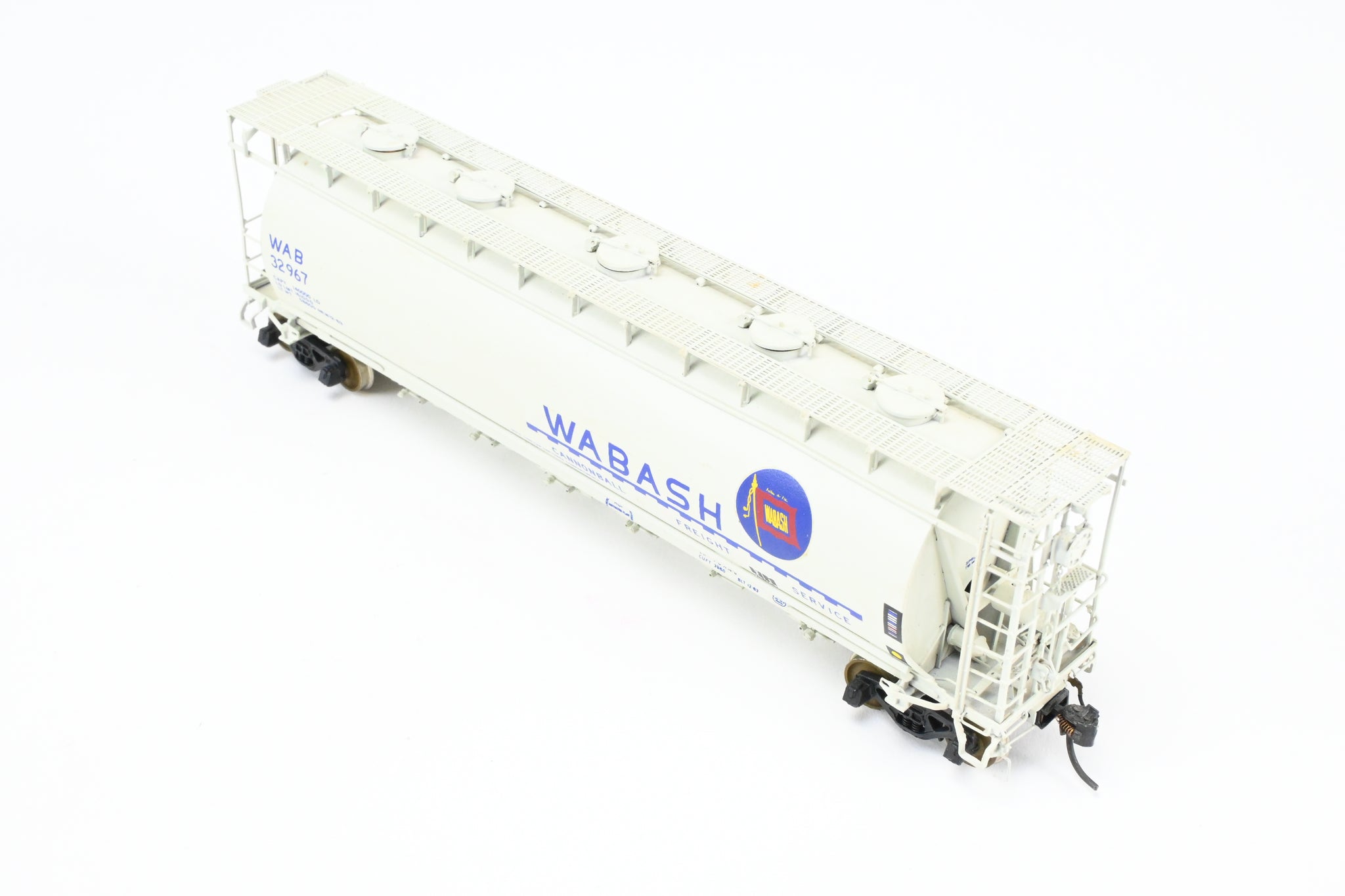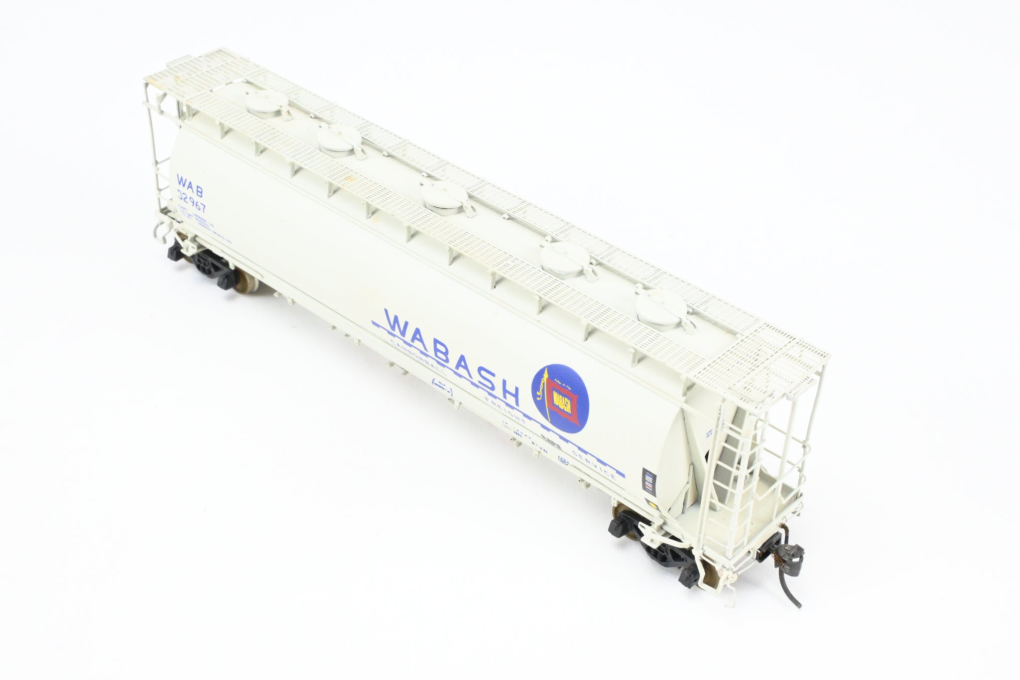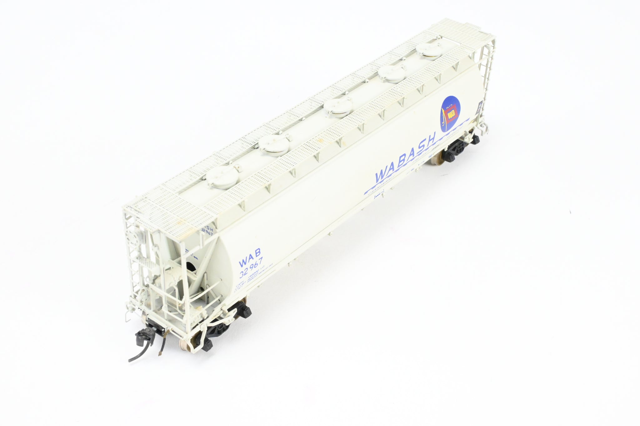 1986 run Overland Models, Inc. model built by Ajin in Korea. Box shows minimal shelf wear. No spare parts included. Nicely custom painted in white with Wabash blue lettering. Numbered #32967. Represents a Wabash HC-60 cylindrical covered hopper.