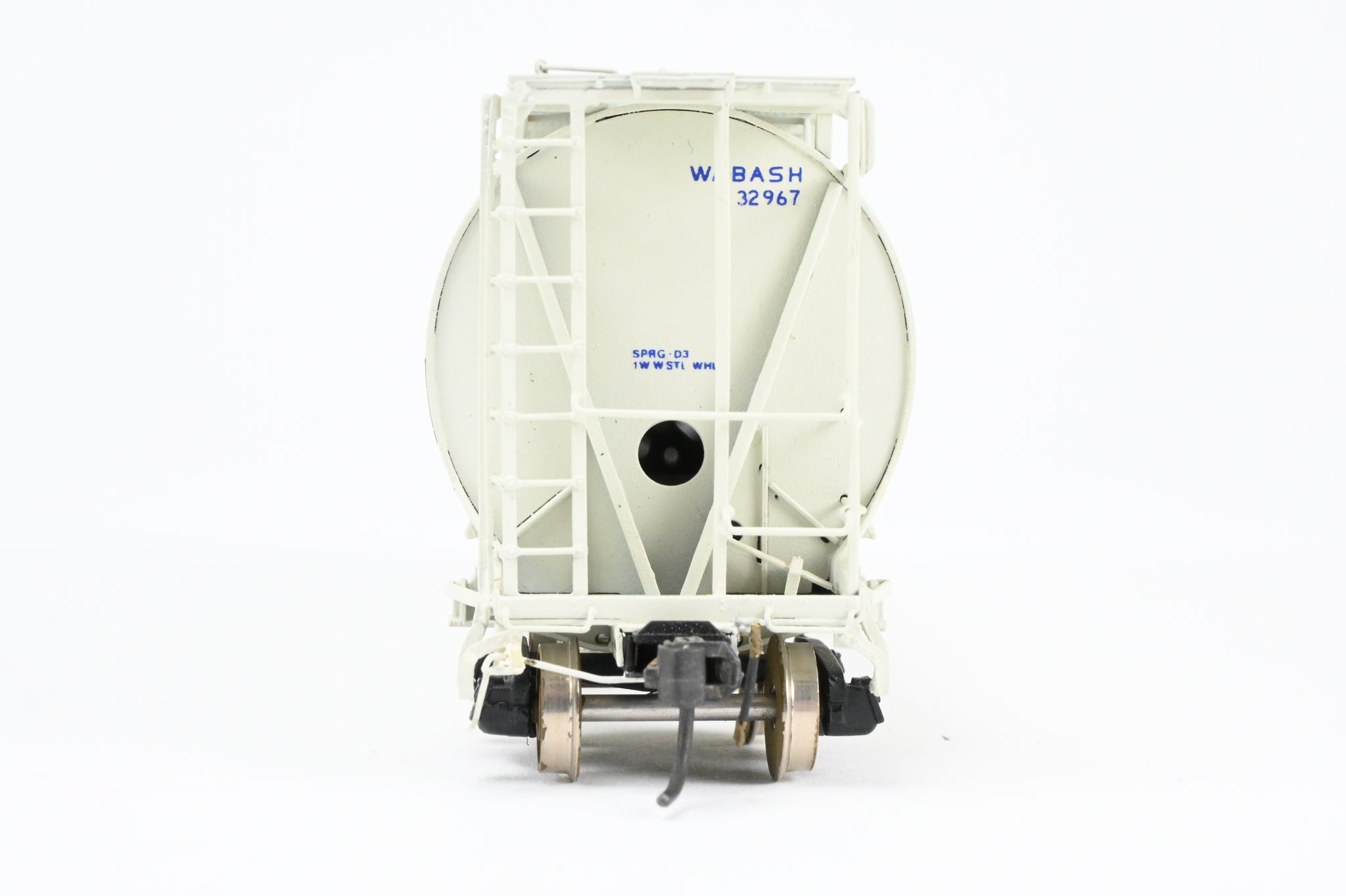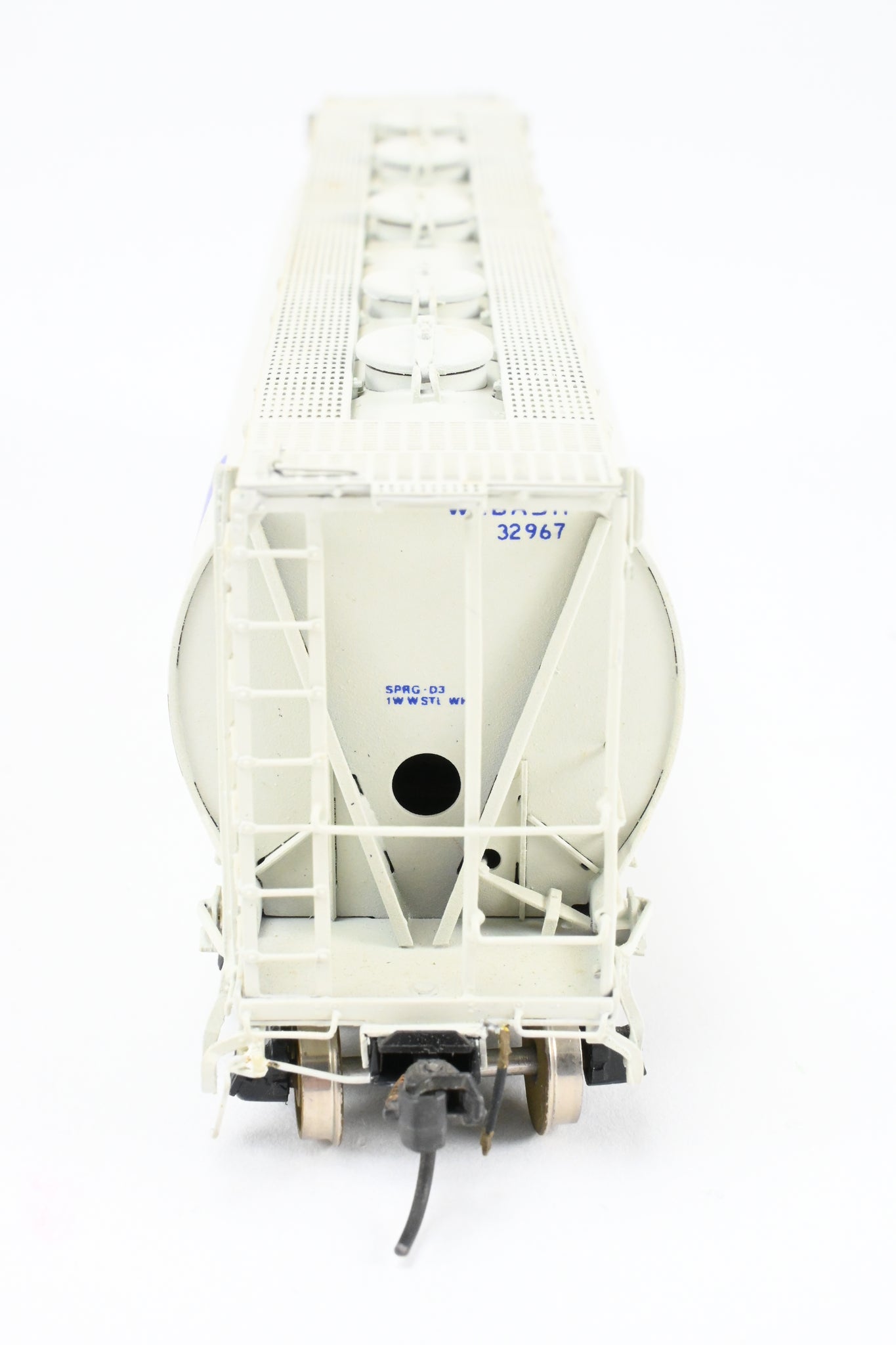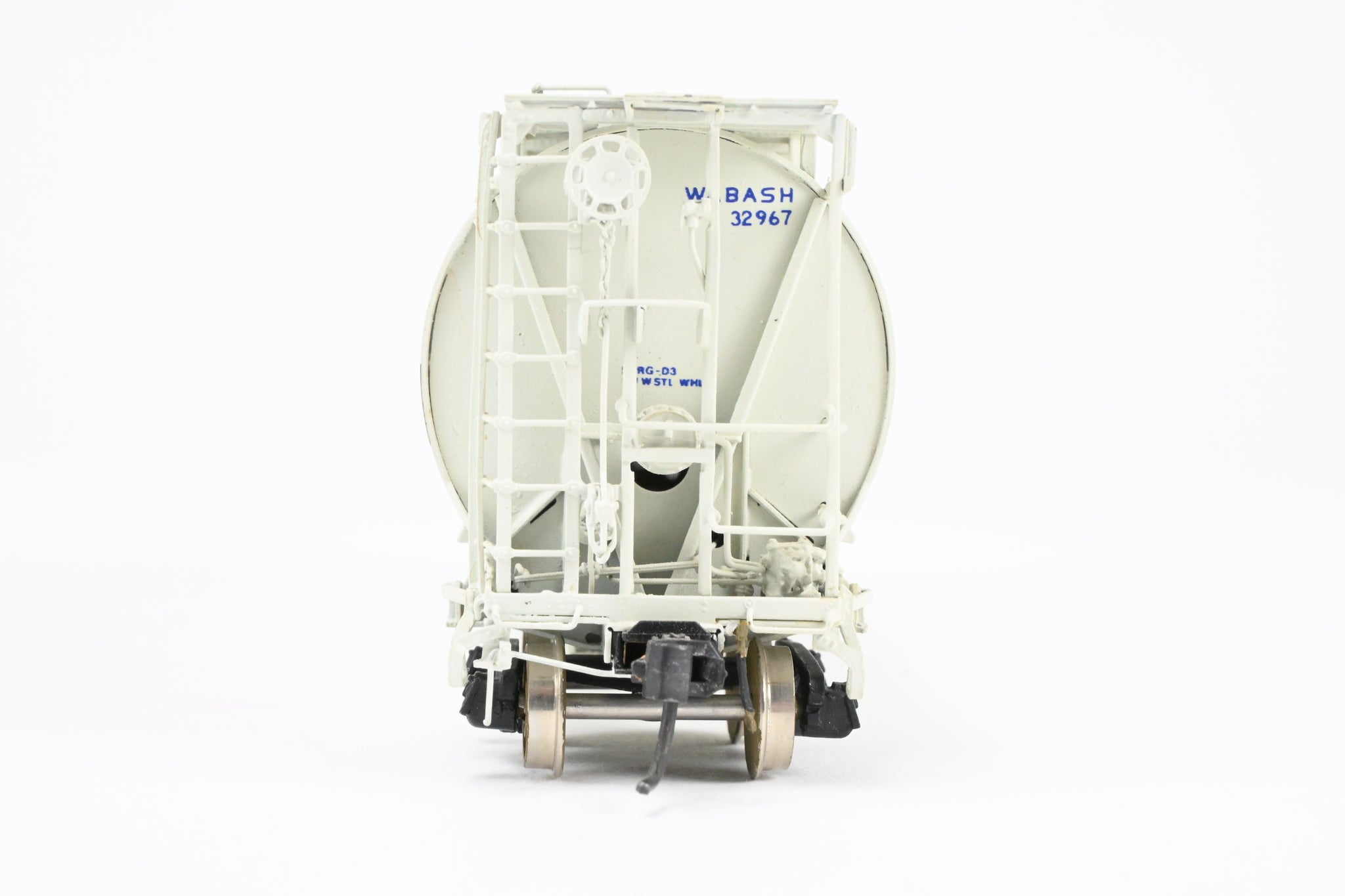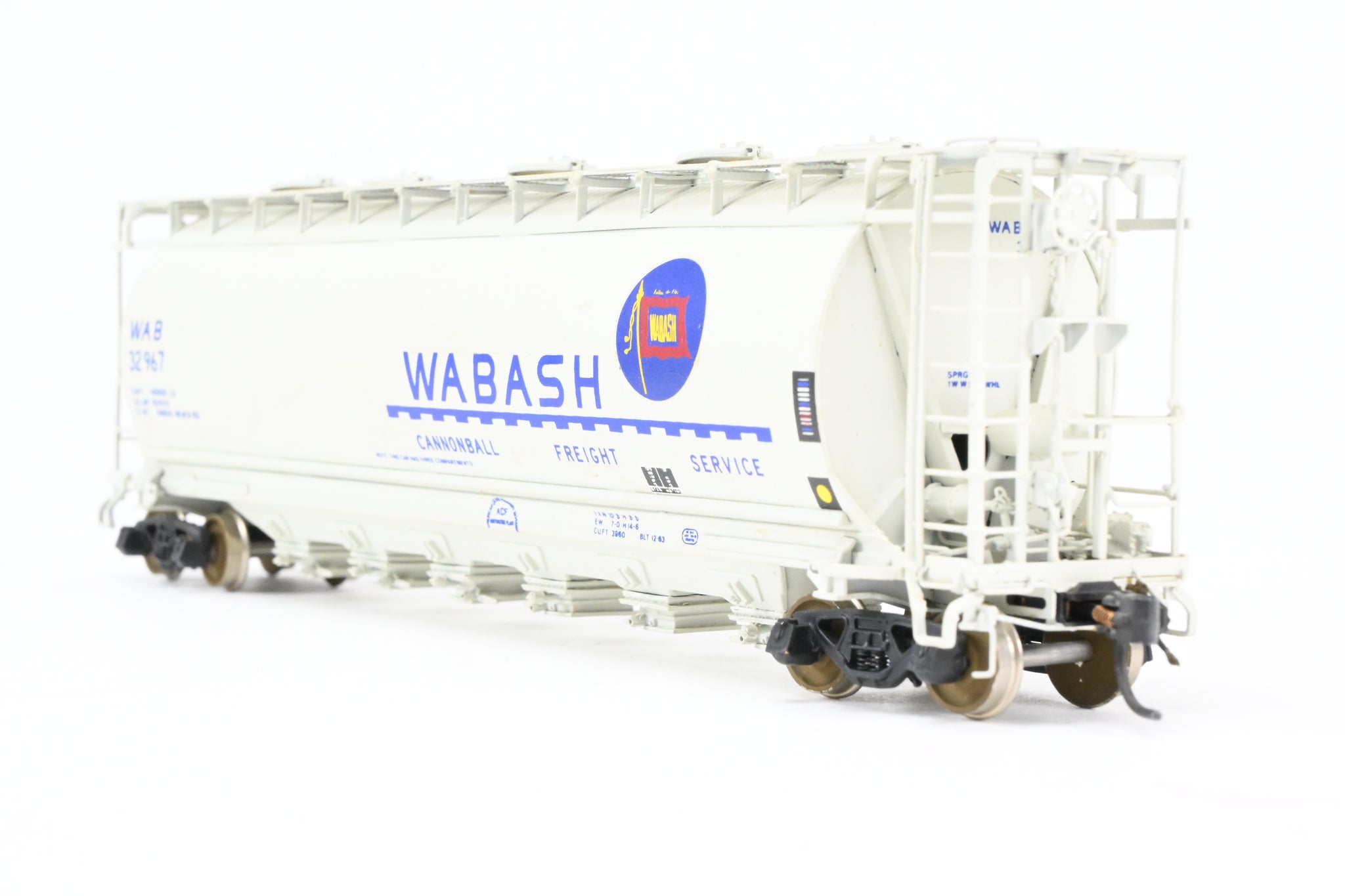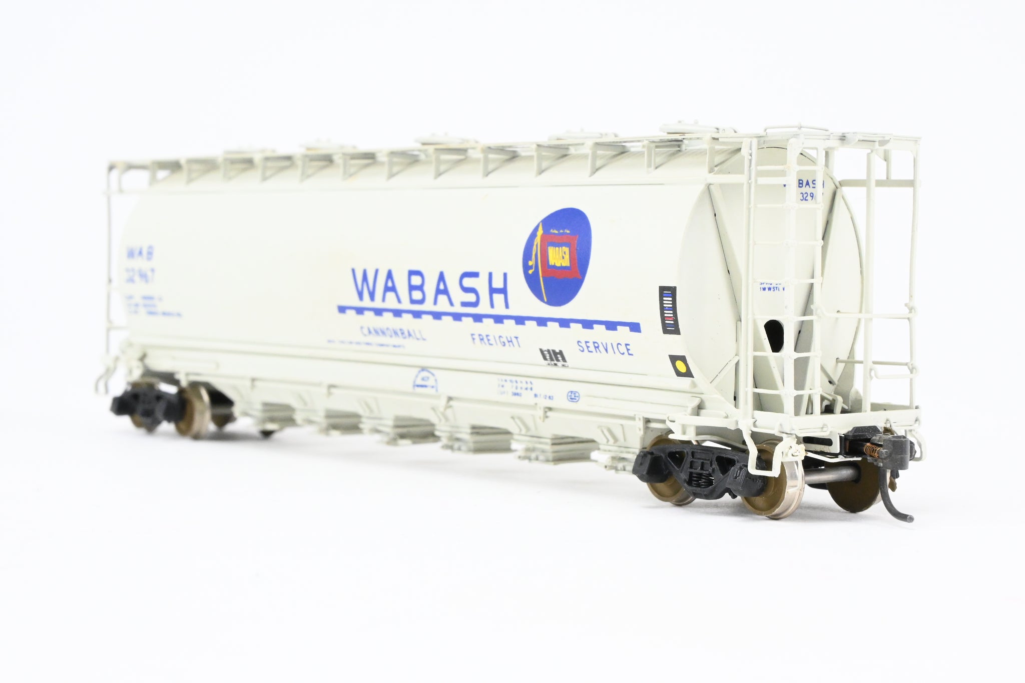 1986 run Overland Models, Inc. model built by Ajin in Korea. Box shows minimal shelf wear. No spare parts included. Nicely custom painted in white with Wabash blue lettering. Numbered #32967. Represents a Wabash HC-60 cylindrical covered hopper.