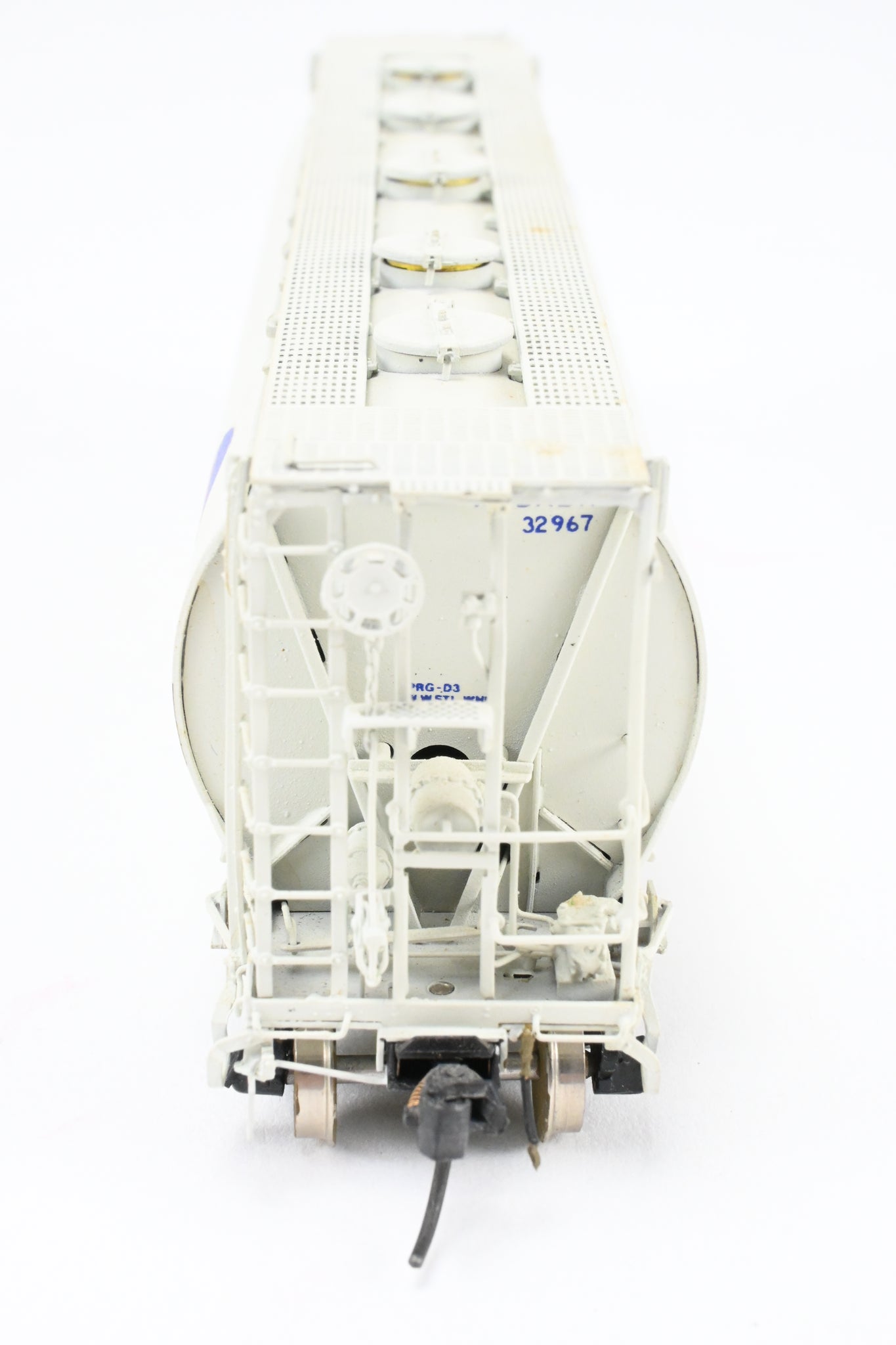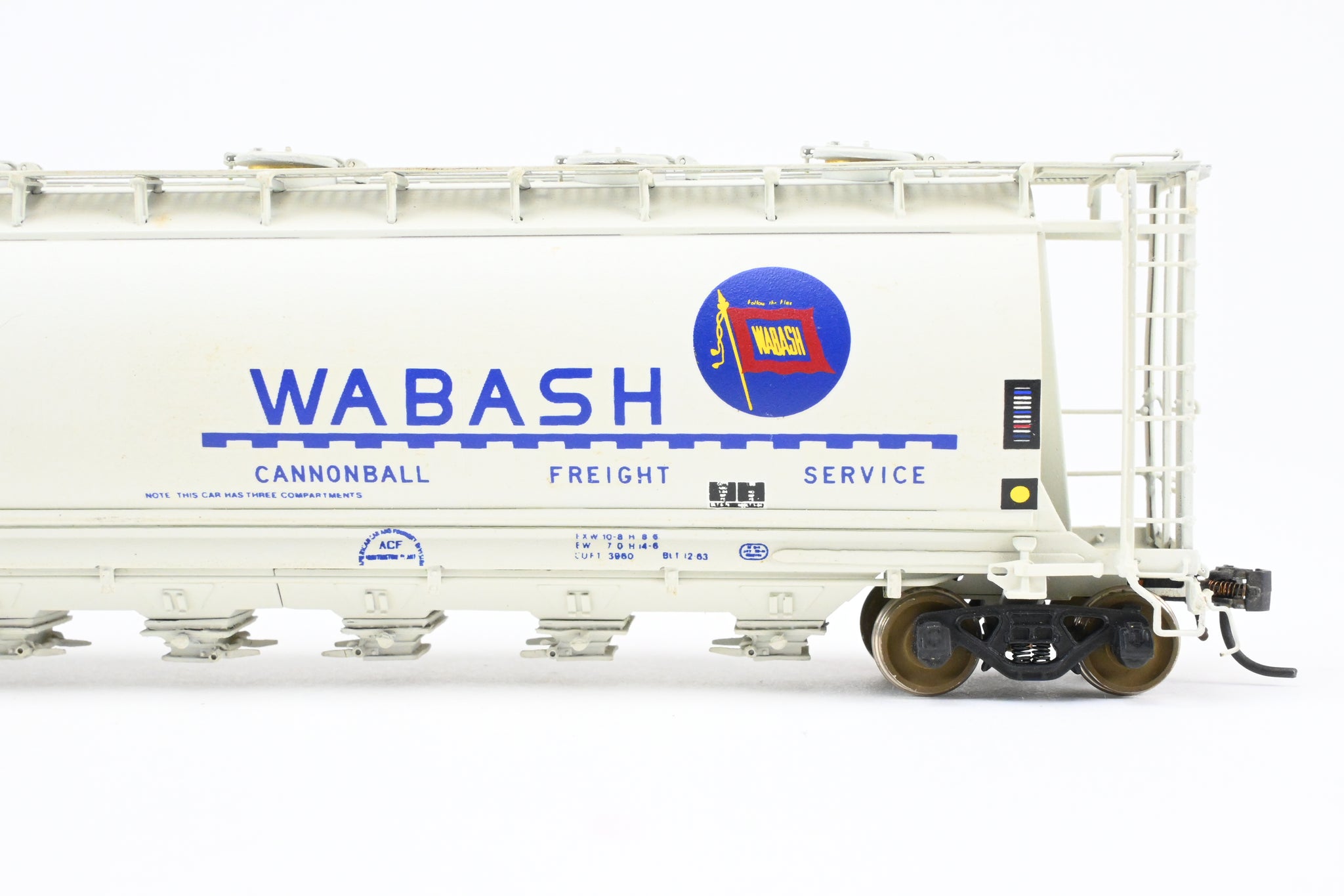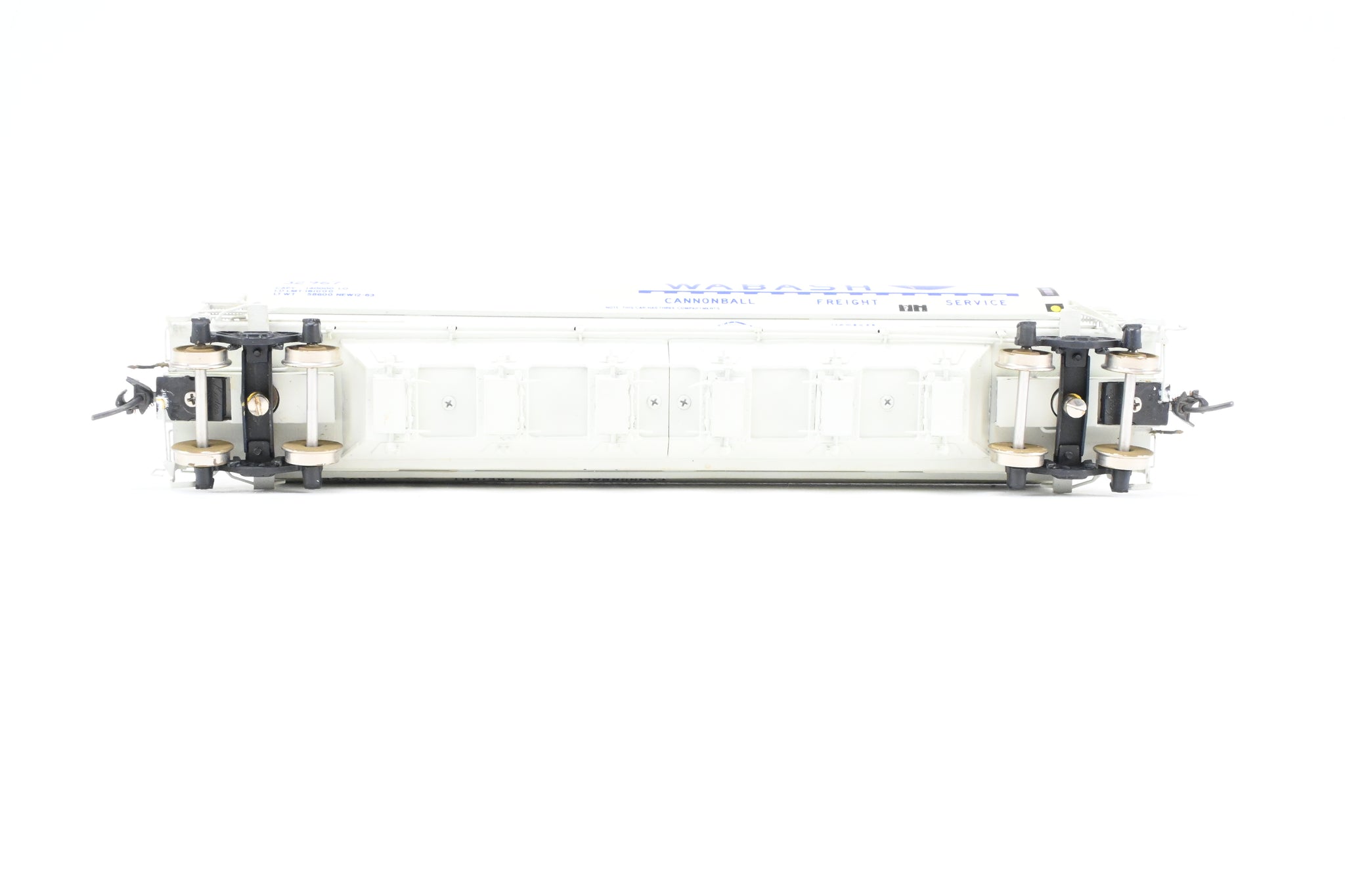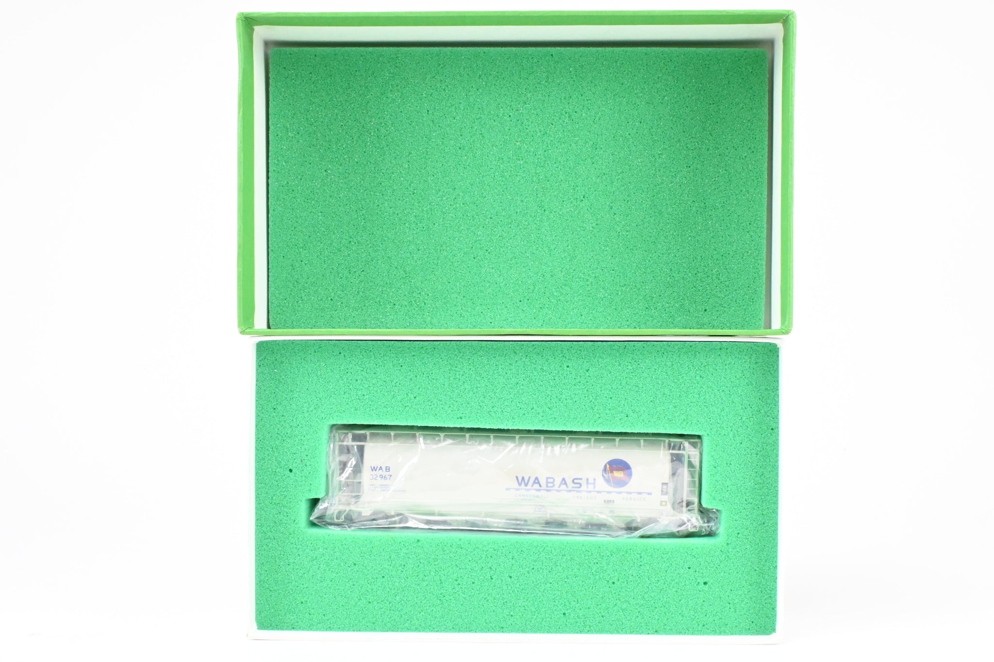 1986 run Overland Models, Inc. model built by Ajin in Korea. Box shows minimal shelf wear. No spare parts included. Nicely custom painted in white with Wabash blue lettering. Numbered #32967. Represents a Wabash HC-60 cylindrical covered hopper.