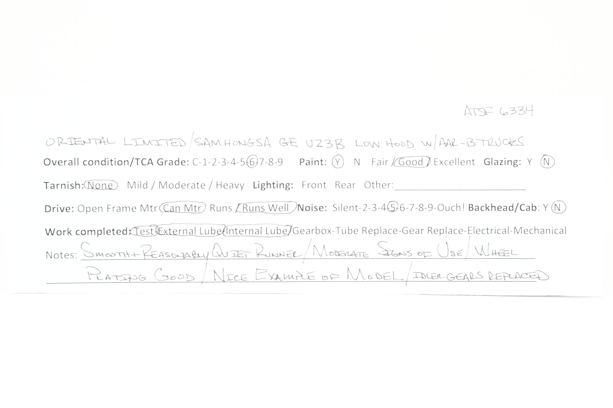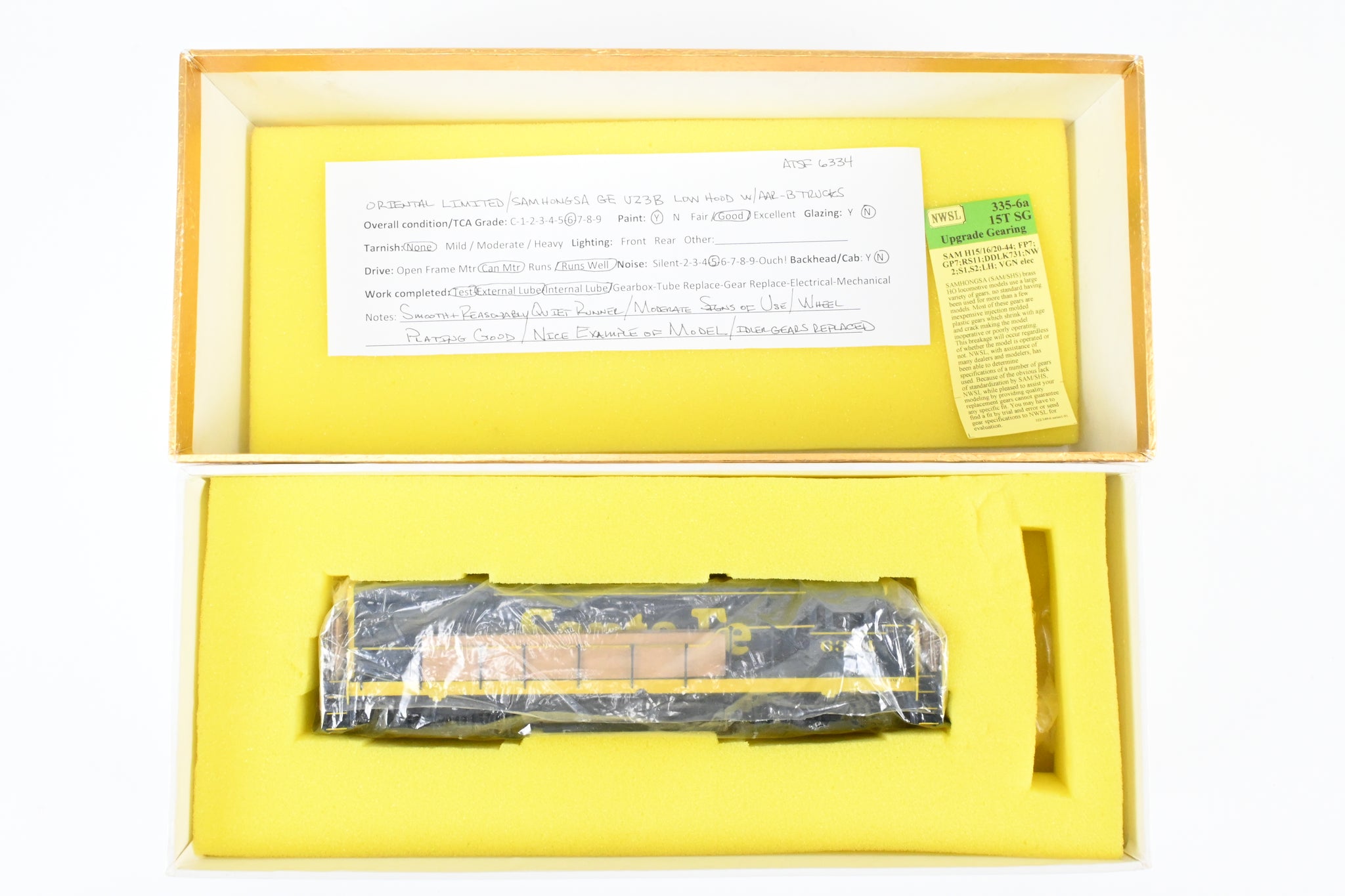 Oriental Limited model built by Samhongsa in Korea. Box shows minimal shelf wear. No spare parts included. Typical mid 1980's Samhongsa diesel. Nicely built, solid, smooth running model. Model represents an early U-23B with AAR-B Trucks. Factory painted in Blue/Yellow scheme. Model has been tested and lubed.
