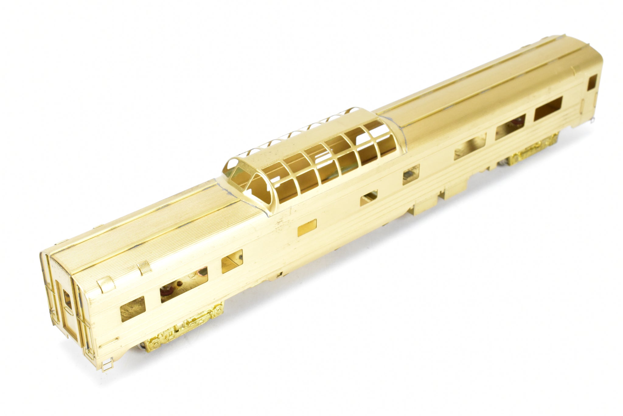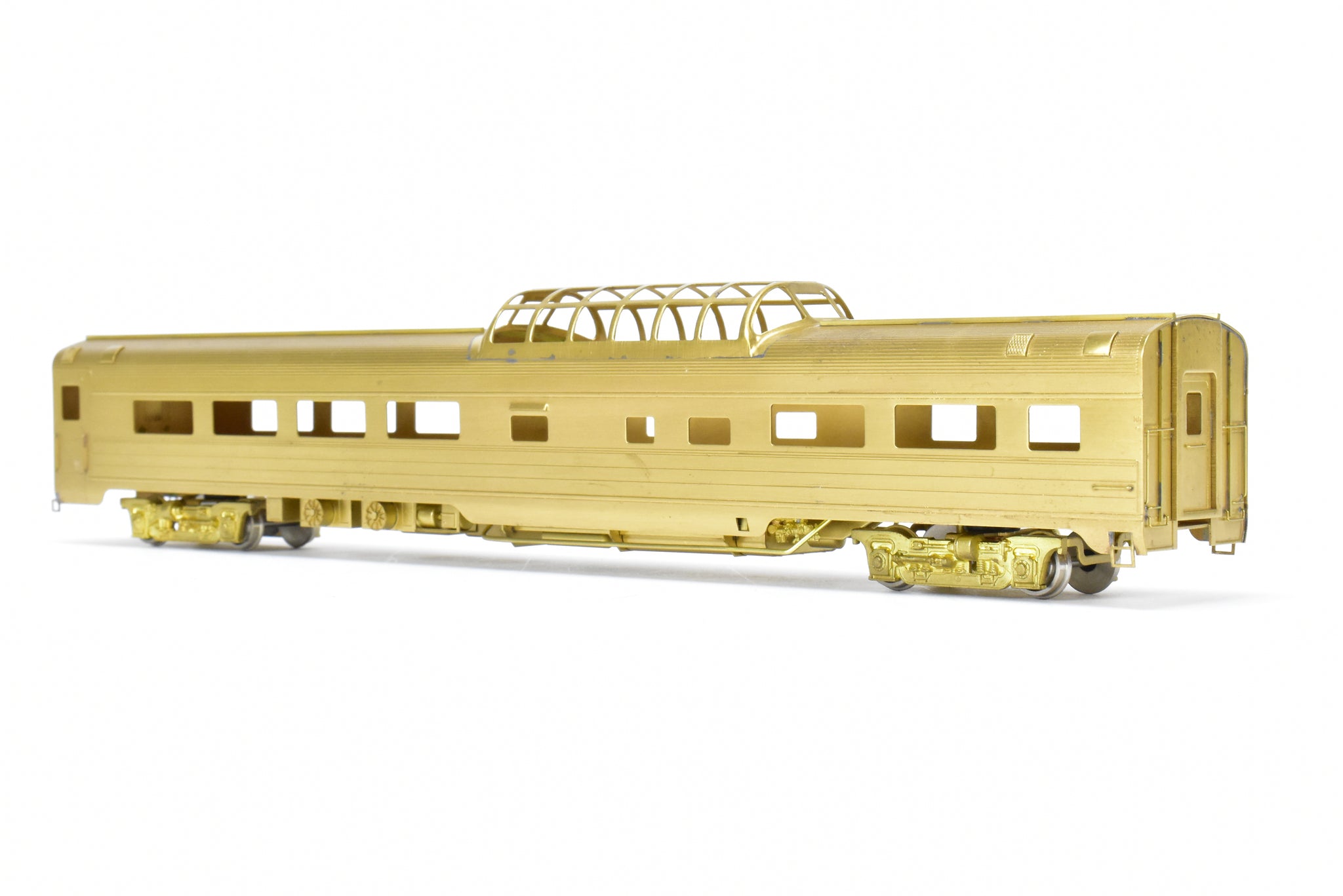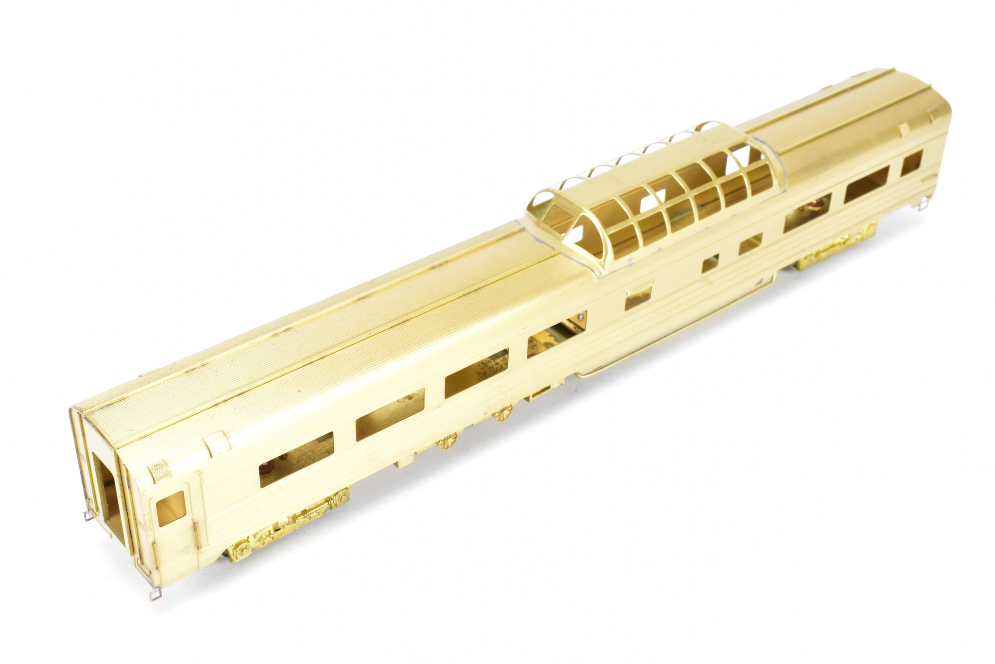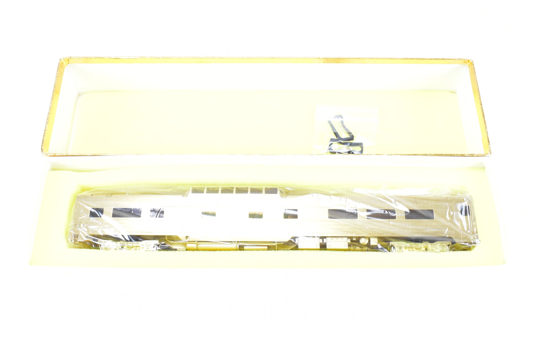 1983 Oriental LTD. imported model built by KMT in Japan. Box shows minimal shelf wear. Coupler screws and diaphragms included. These Budd Job 9646-141 cars were built and delivered in June 1954. NP ordered eight dome coaches, CB&Q ordered two (No. 557-558), and SP&S ordered one (No. 559). These cars were built to equip the Lowey designed North Coast Limited in 1954. All 11 of these cars went to Amtrak in May 1971.