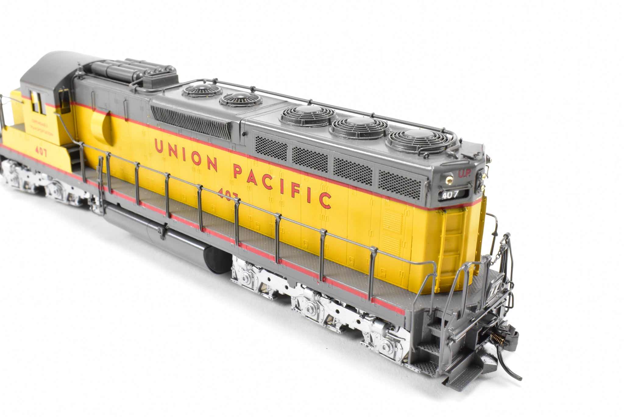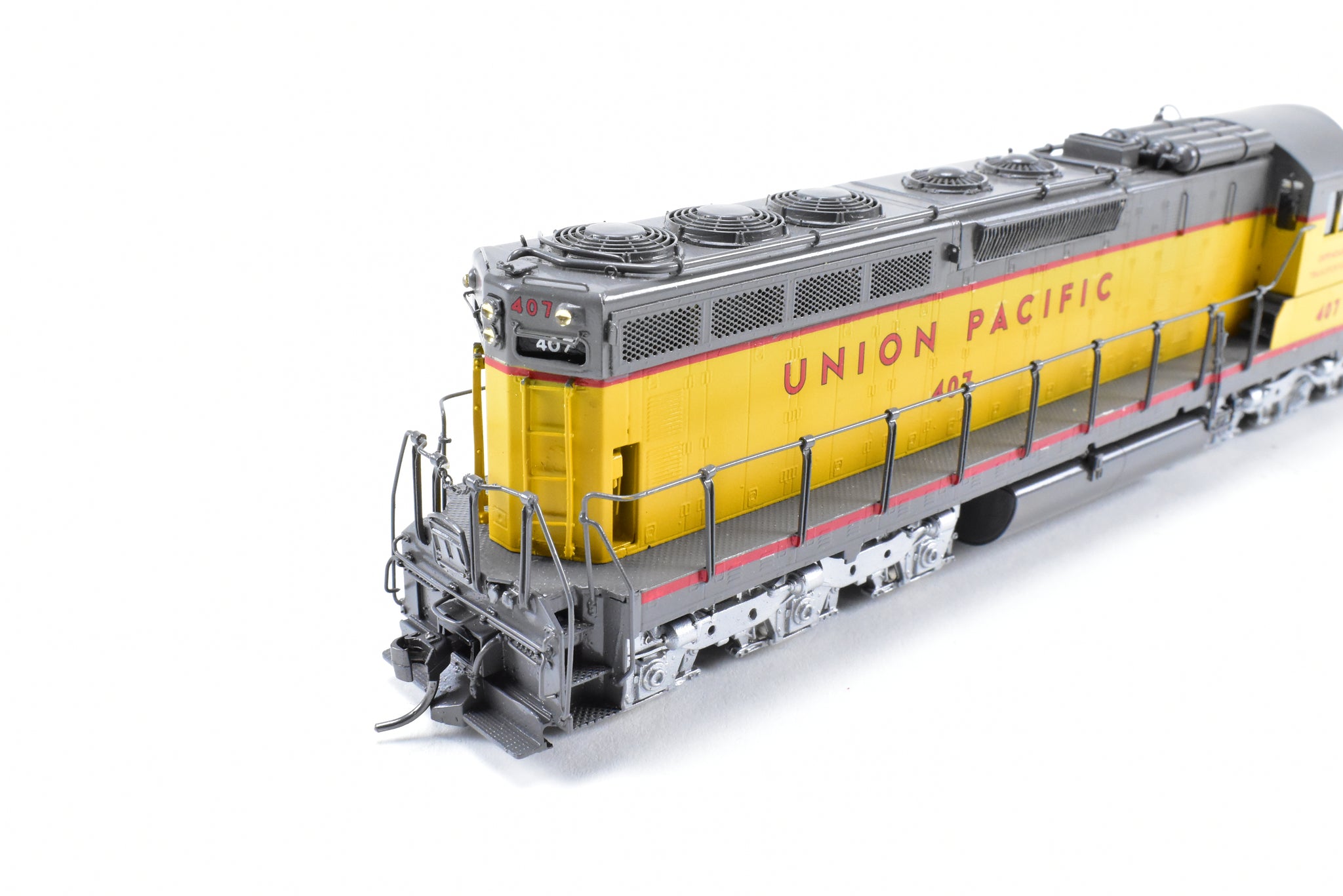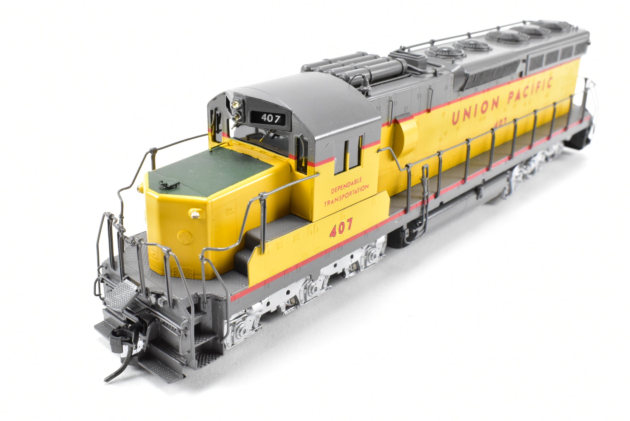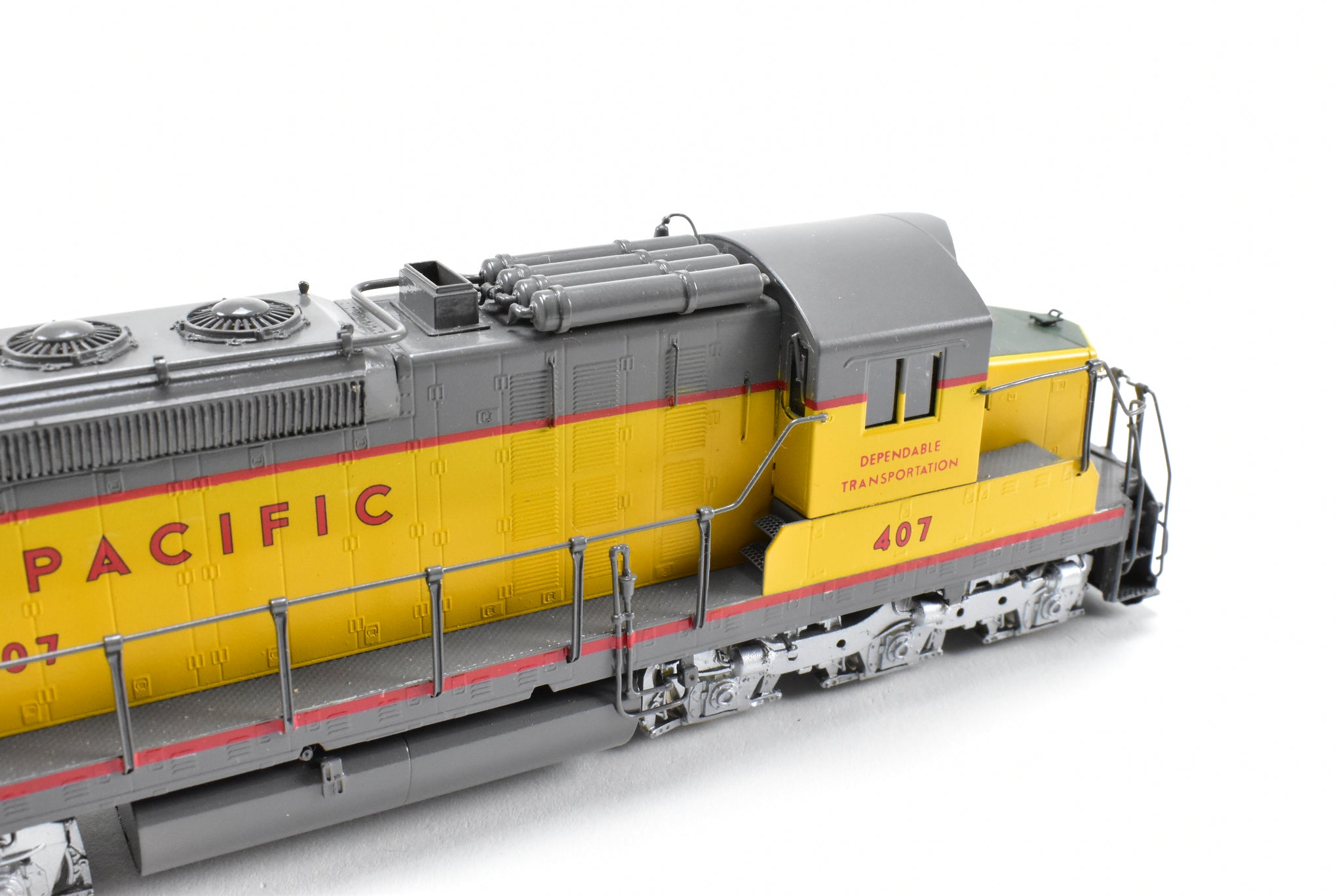 1984 run Oriental Limited model built by Samhongsa in Korea. Box shows some shelf wear. Spare parts included. Low hood version custom painted for Union Pacific road number 407. MV Lenses, window glazing, and number board decals are installed. A smooth running, quiet model that shows little use.