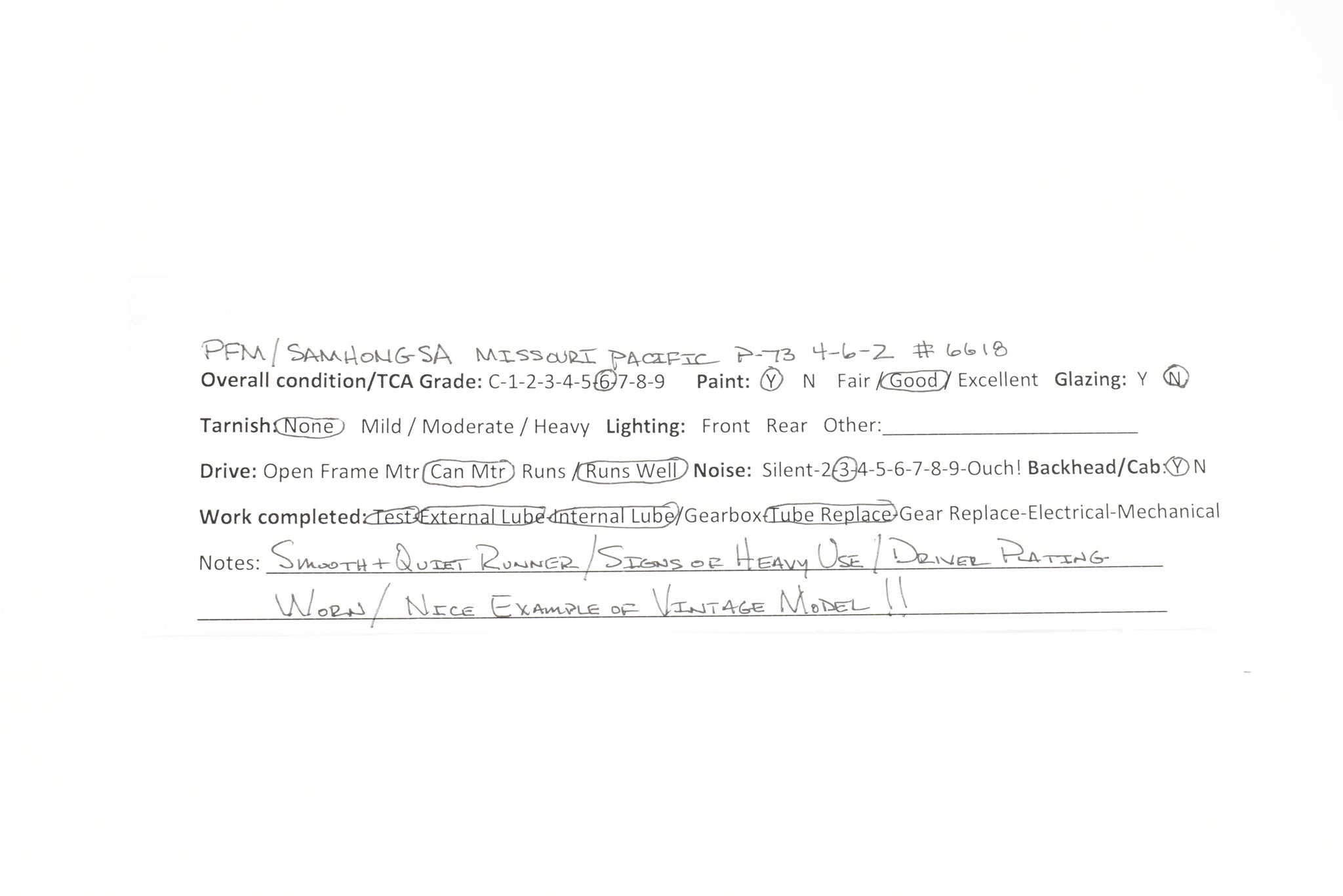 1976 run PFM imported model built by Samhongsa in Korea. Box shows light shelf wear. No spare parts. Recently serviced with new drive tube added, gearbox cleaned out, and new lubrication applied. Sound ready with the tender factory drilled for speaker installation. Oil-fired locomotive with a Worthington feedwater heater.