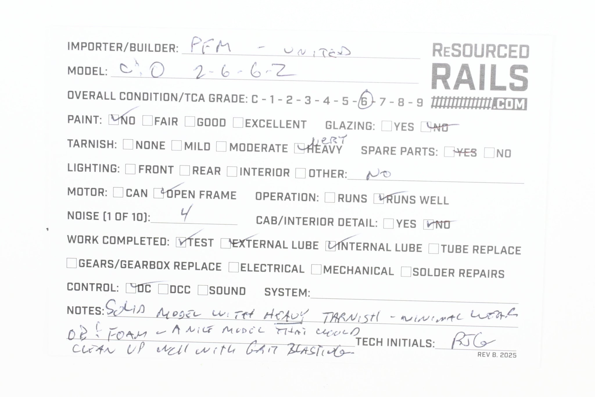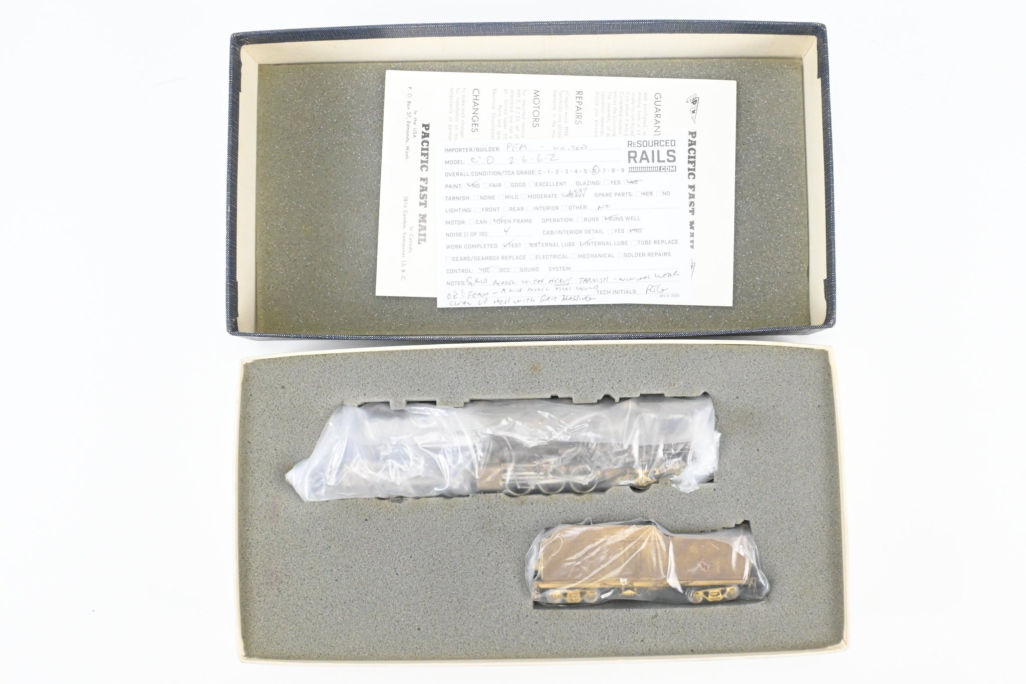 Early 1960's run Pacific Fast Mail imported model built by Atlas Industries in Japan. Box shows minimal wear. No spare parts. Represents the same class of locomotives as C&O 1309 currently in service at the Western Maryland Scenic Railroad. This was one of the last engines built by Baldwin in 1948. Nice detail with a robust drive train that will clean up with grit blasting.