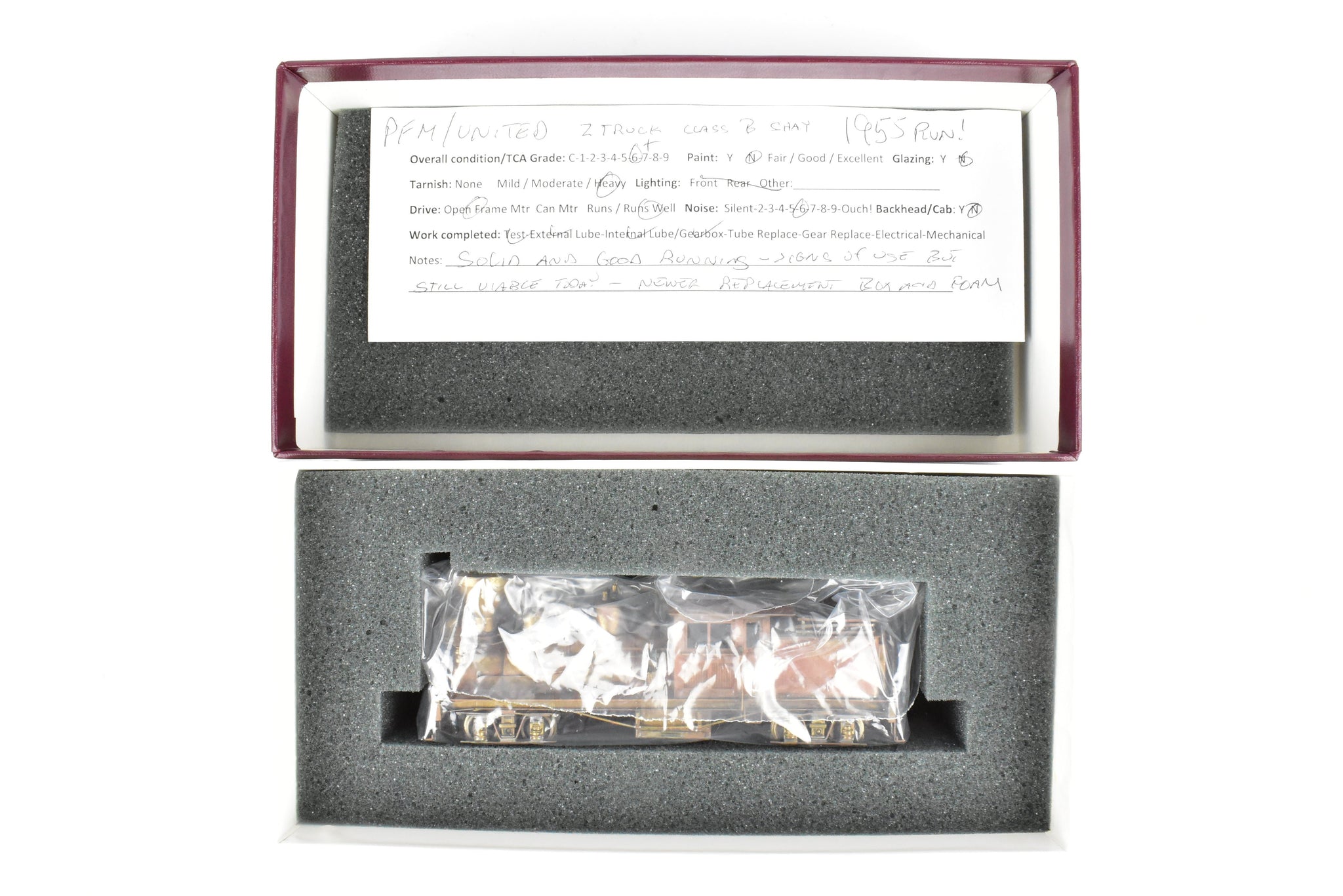1955 run PFM - United imported model built by Atlas Industries in Japan. Real early run! REBOXX replacement box and foam shows minimal shelf wear. Model shows moderate signs of use, but still a viable runner today. Note: Model has very limited electrical pickup and the motor is beginning to fail. This is indicating it's age and not an uncommon failure in Open Frame Motors. In addition, Previous owners have repaired some solder work - see photos.