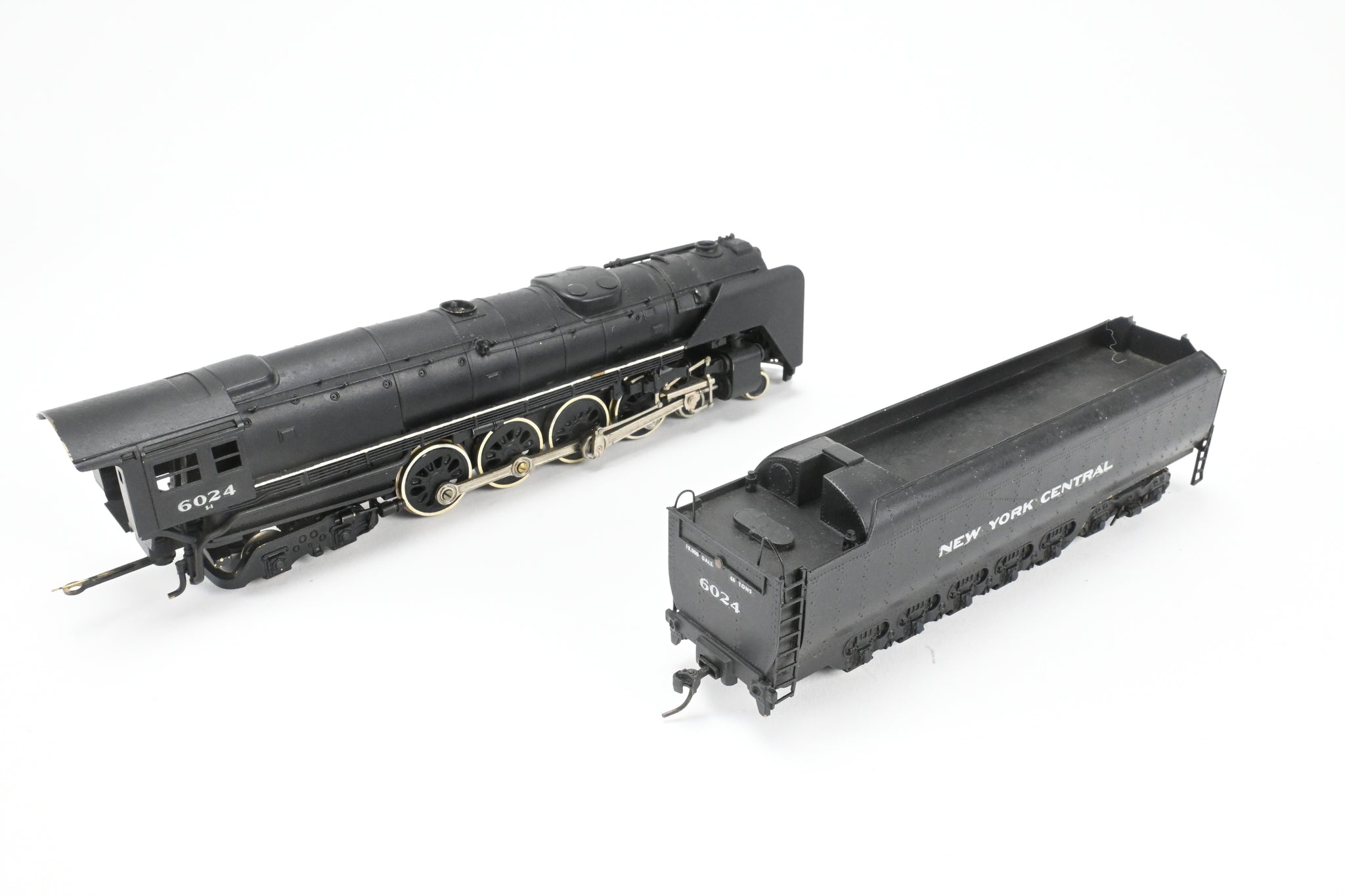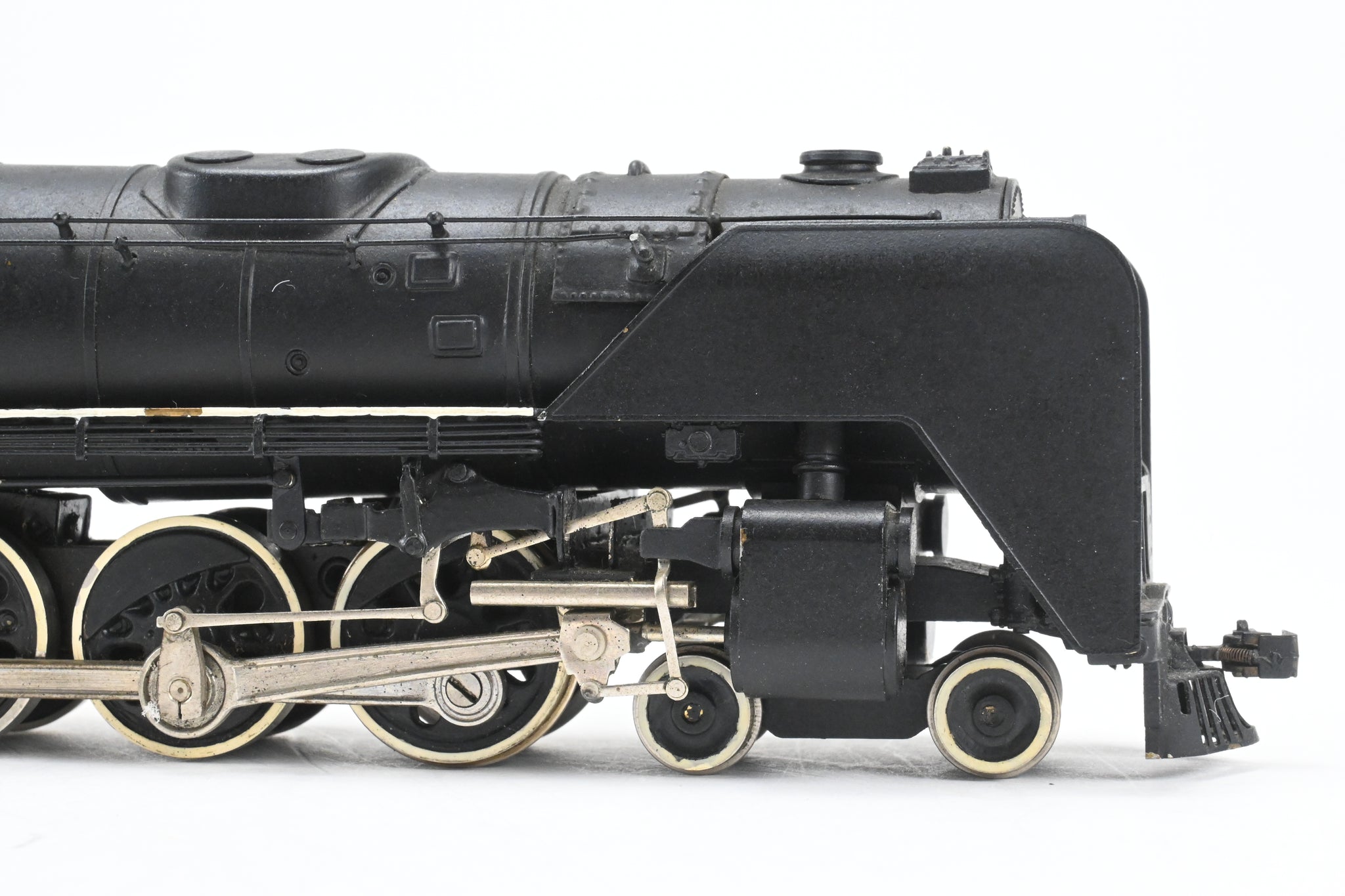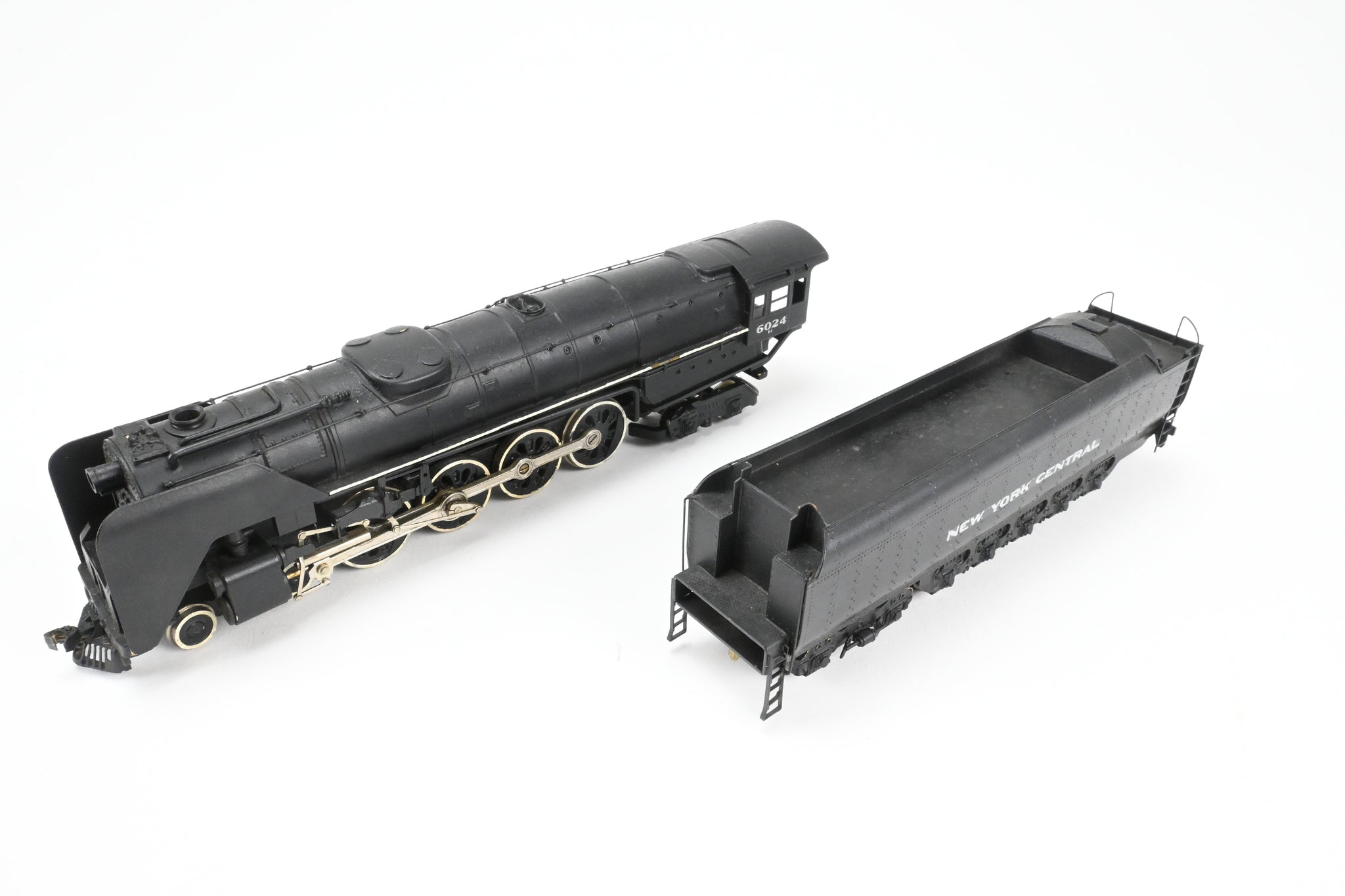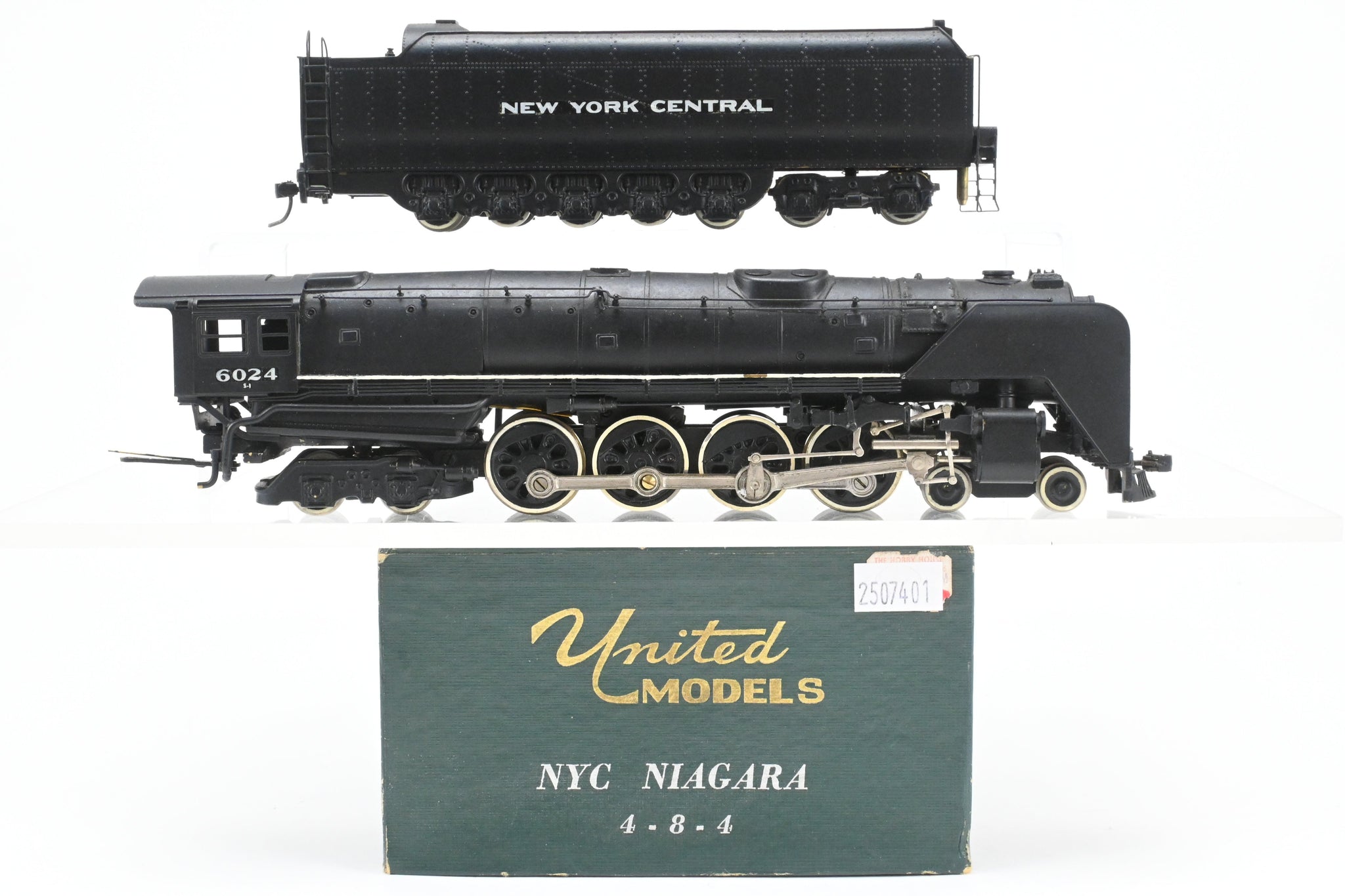 1959 run Pacific Fast Mail model built by United in Japan. Original box shows minimal shelf wear. Model has a fair paint job with wear and is numbered #6024 - see photos. This model shows signs of heavy use, but it is a smooth and quiet running engine. A decent example of a vintage Japanese brass model.