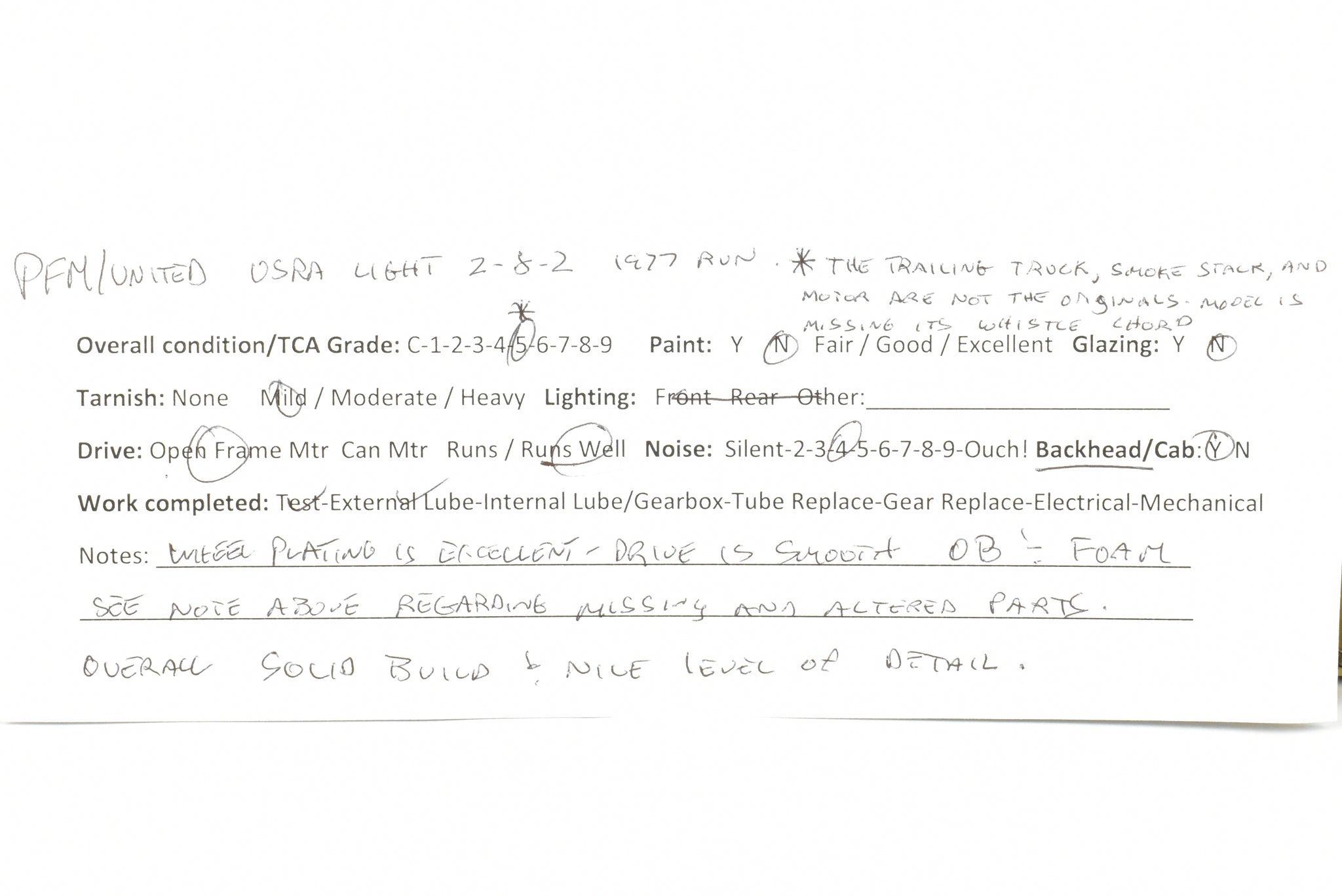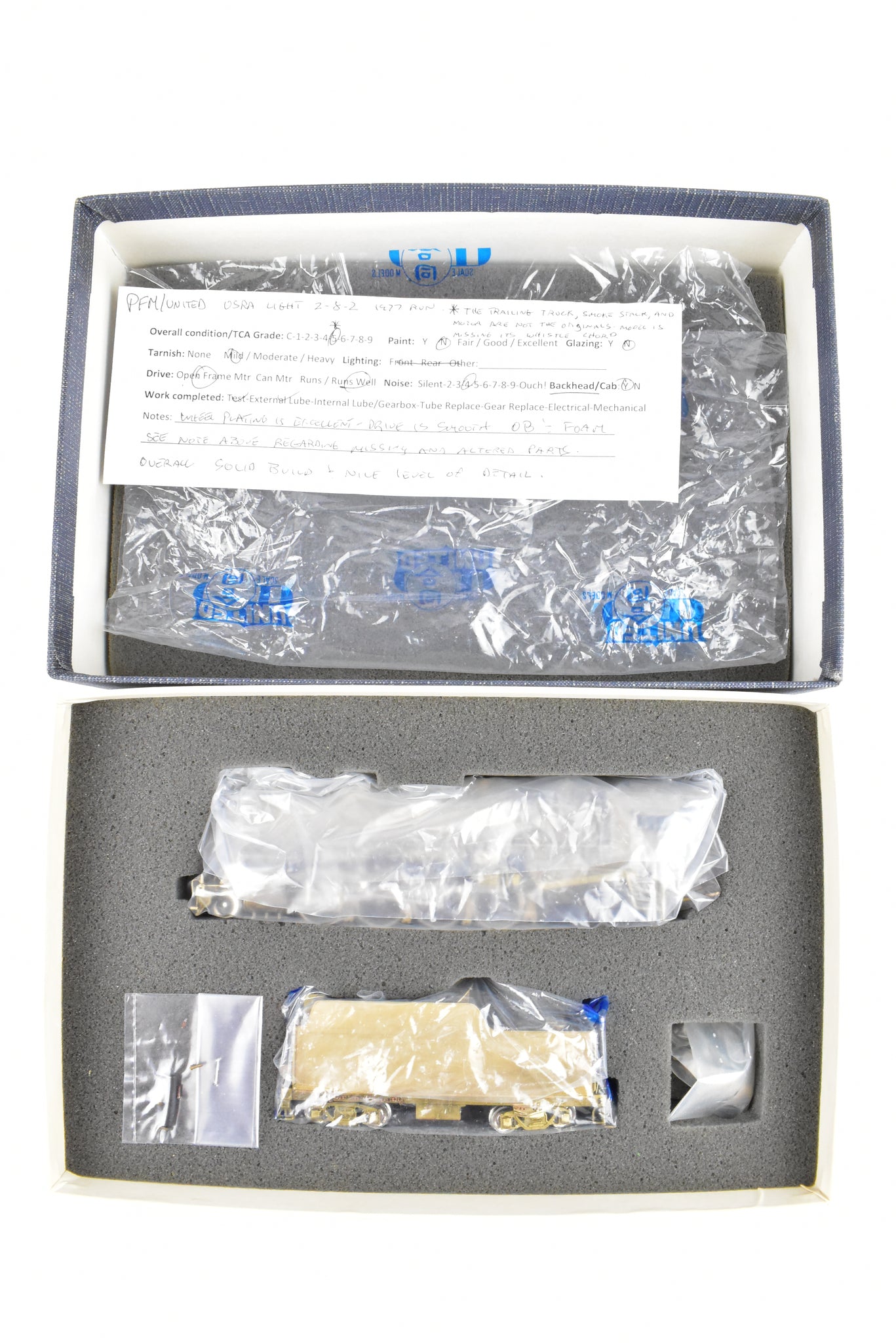1977 'Hi-Grade' Run Pacific Fast Mail imported model built by Atlas Industries in Japan. Box shows minimal shelf wear. Improved over previous runs. Spare parts included. This locomotive was owned by virtually every railroad. These engines were used as delivered and heavily modified and were still in use by the 50's when they were replaced with diesels. This model represents a Baldwin built Light 2-8-2. Recently serviced - Old grease cleaned out of gearbox and replaced. New drive tube installed. While a fairly simple locomotive, its a later run model from Japan that demonstrated the ultimate of the Japanese craft. Note: Stack, original trailing truck, and can motor have been removed and replaced with another stack, an earlier run trailing truck, and an open frame motor. Being sold AS-IS for that reason.