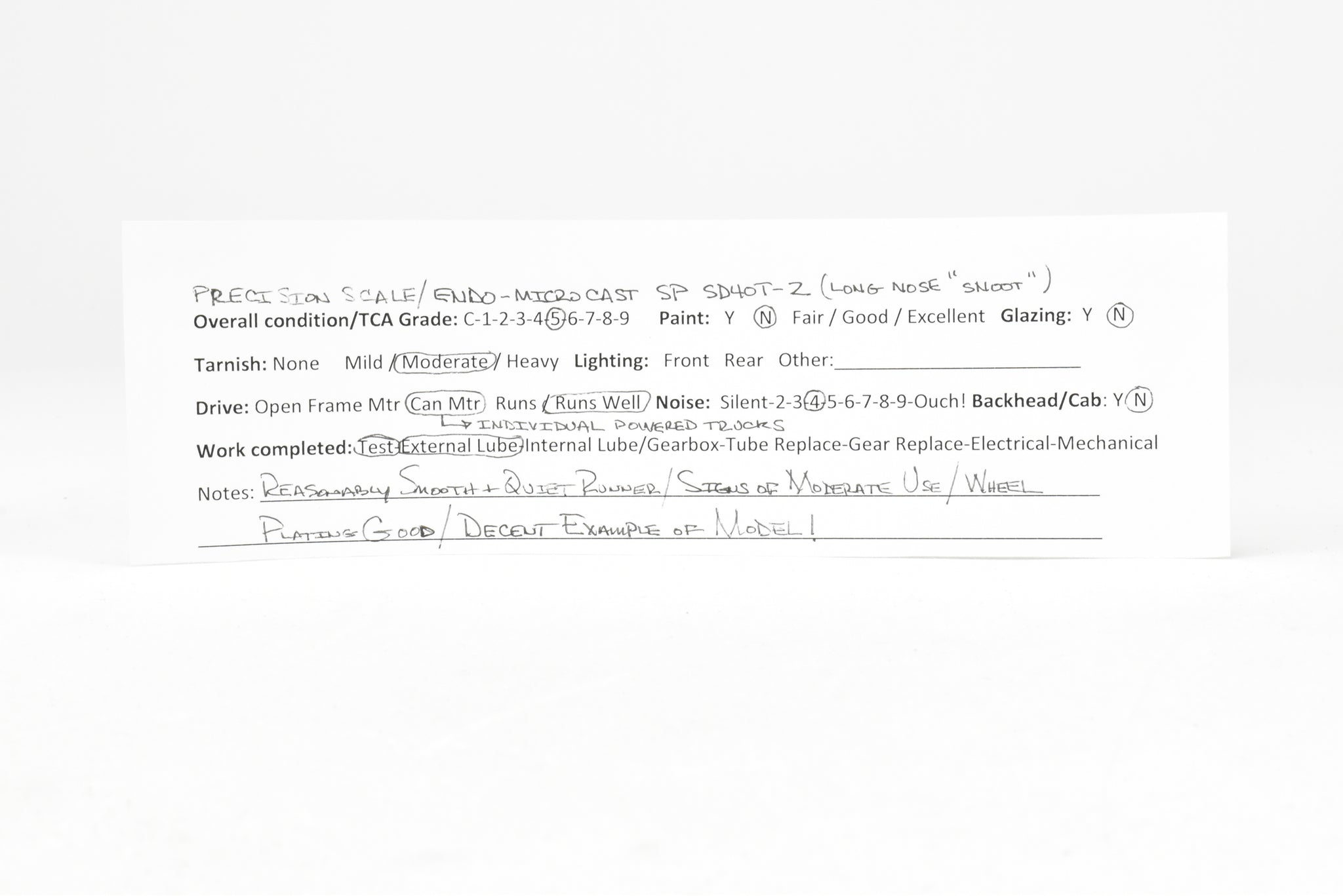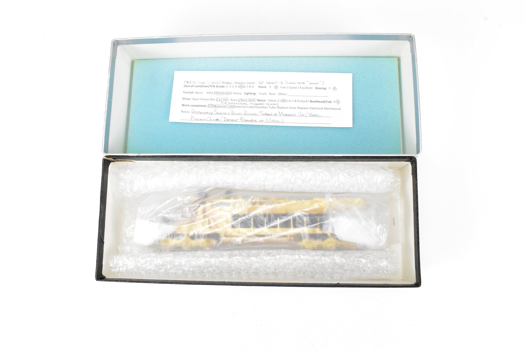 1984 run Precision Scale Co. imported model built by Endo Co./Micro Cast in Korea. Box shows minimum shelf wear. Foam replaced with bubblewrap. Does not include spare parts. Featured powered trucks with motors built into each. A smooth and reasonably quiet runner.