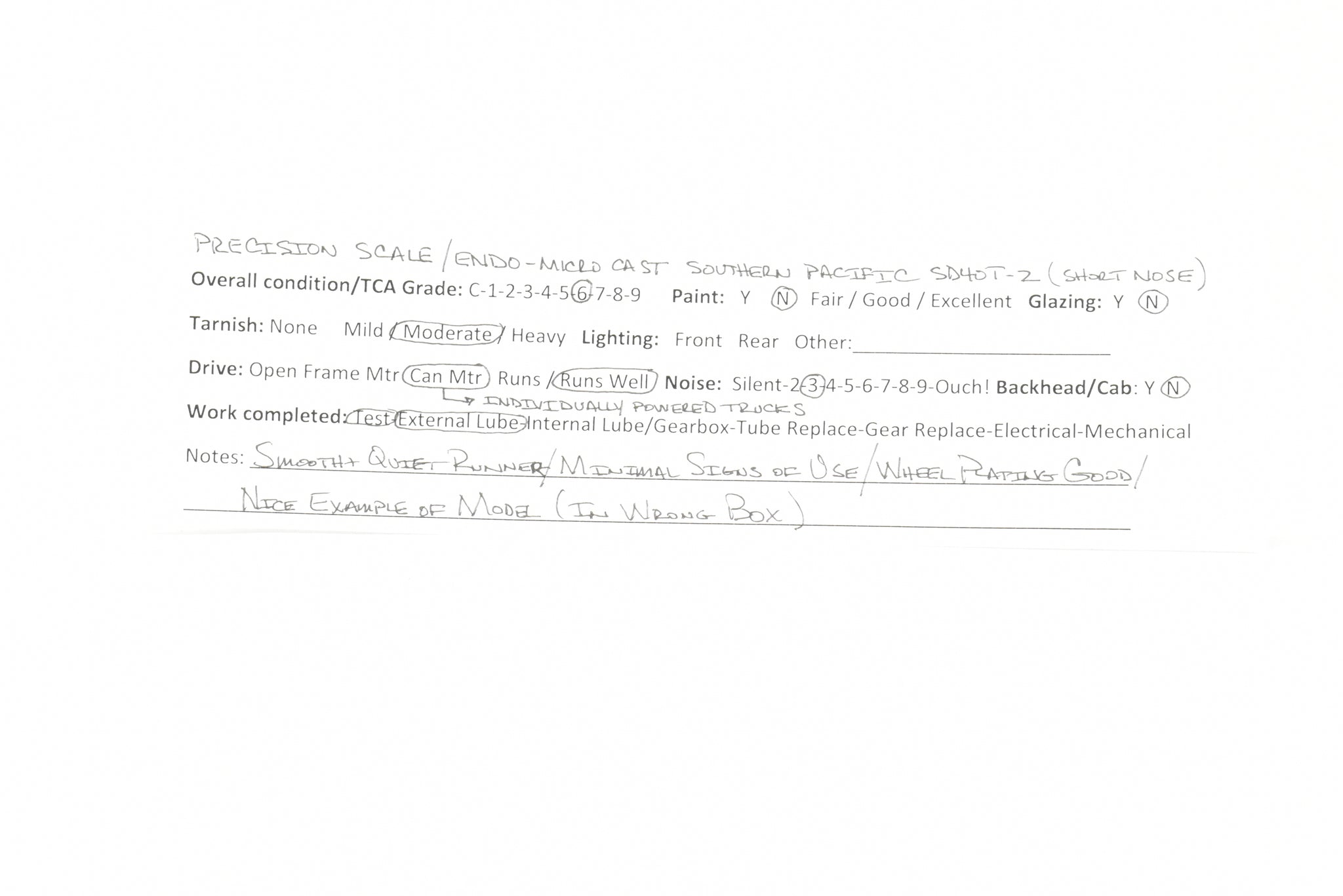 1983 run Precision Scale Co. imported model built by Endo Co./Micro Cast in Japan. Incorrect Box shows some shelf wear. Center Foam section replaced with bubblewrap. No spare parts included. Features powered trucks with motors built into each. A smooth and reasonably quiet model that shows little signs of use.