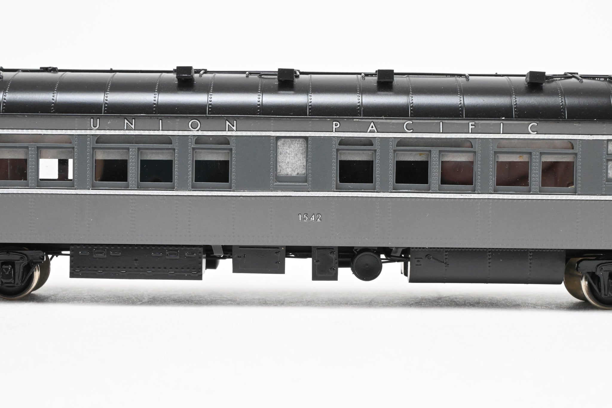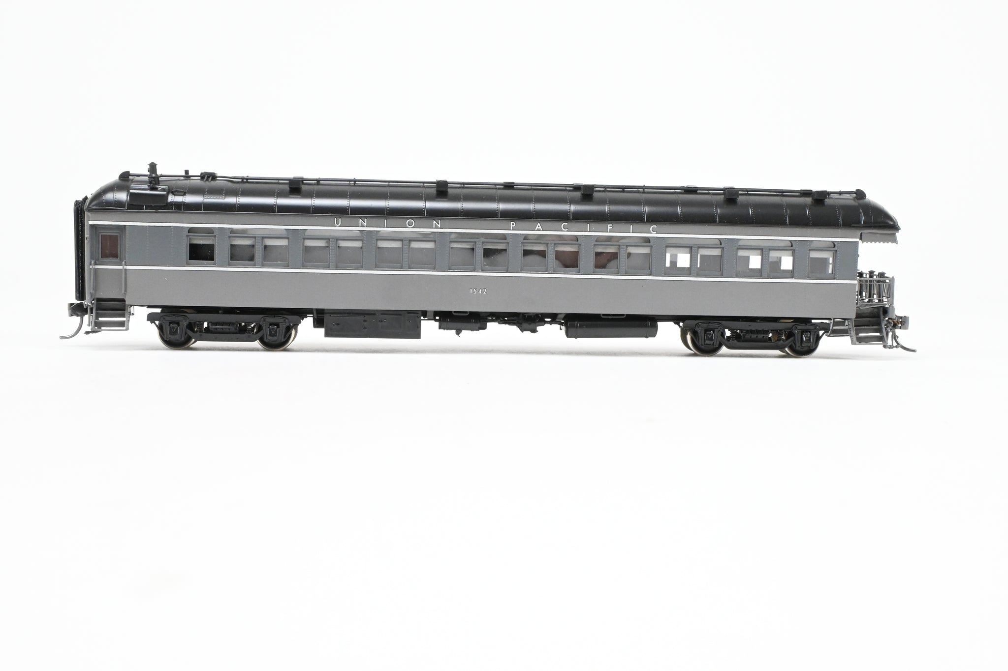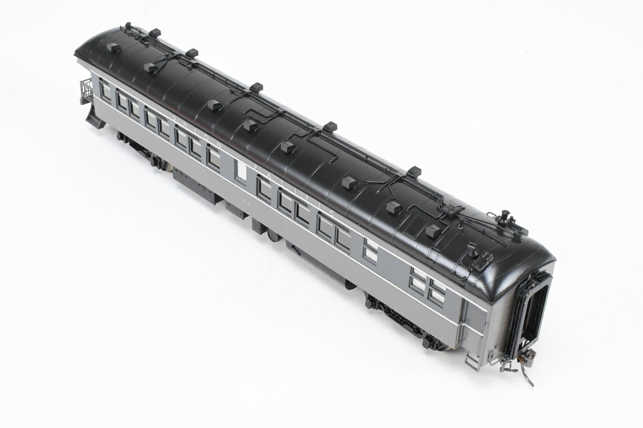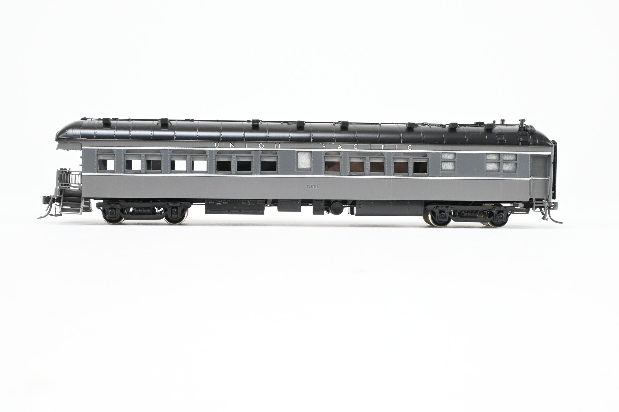 1989 Precision Scale Co. imported model built by Hyodong in Korea. Box shows moderate shelf wear. Model is beautifully pro-painted in UP's Two-Tone Gray scheme numbered 1542. Full glazing throughout and diaphragm on vestibule end installed. Although this is a SP car, it is a Harriman Standard car, it can be used in Union Pacific service.