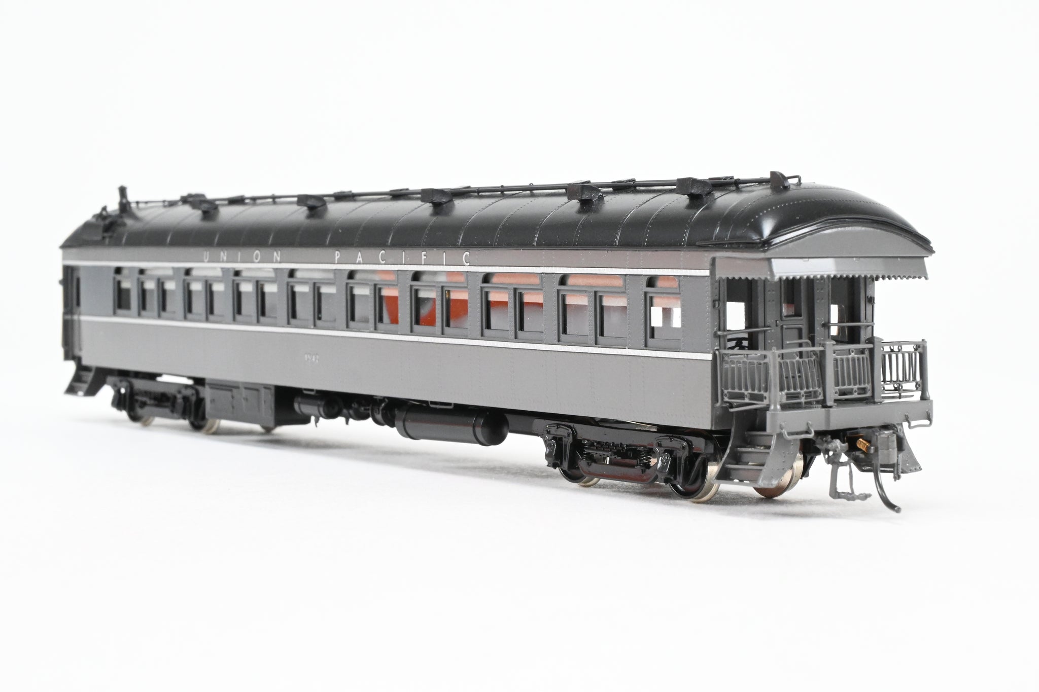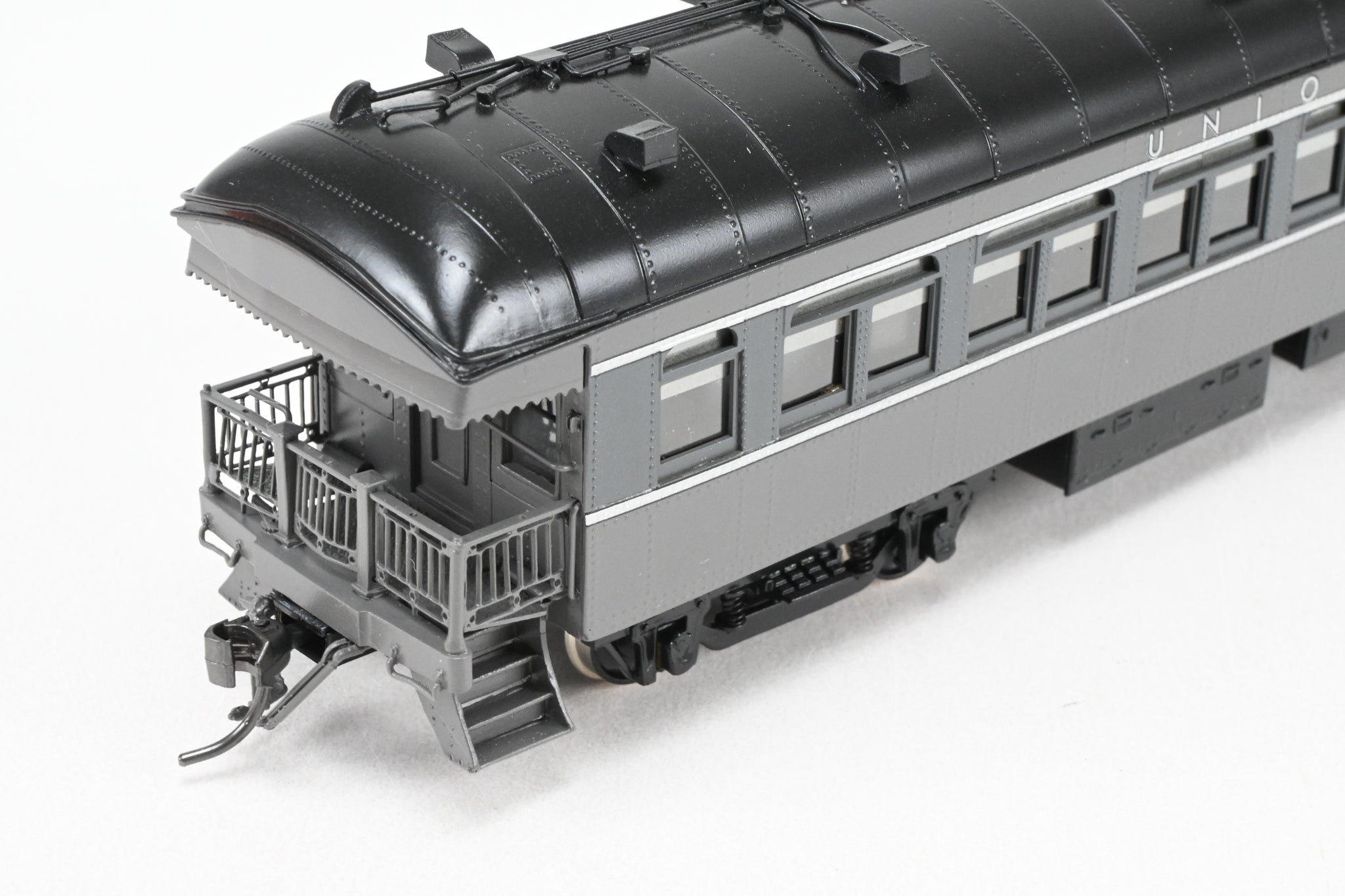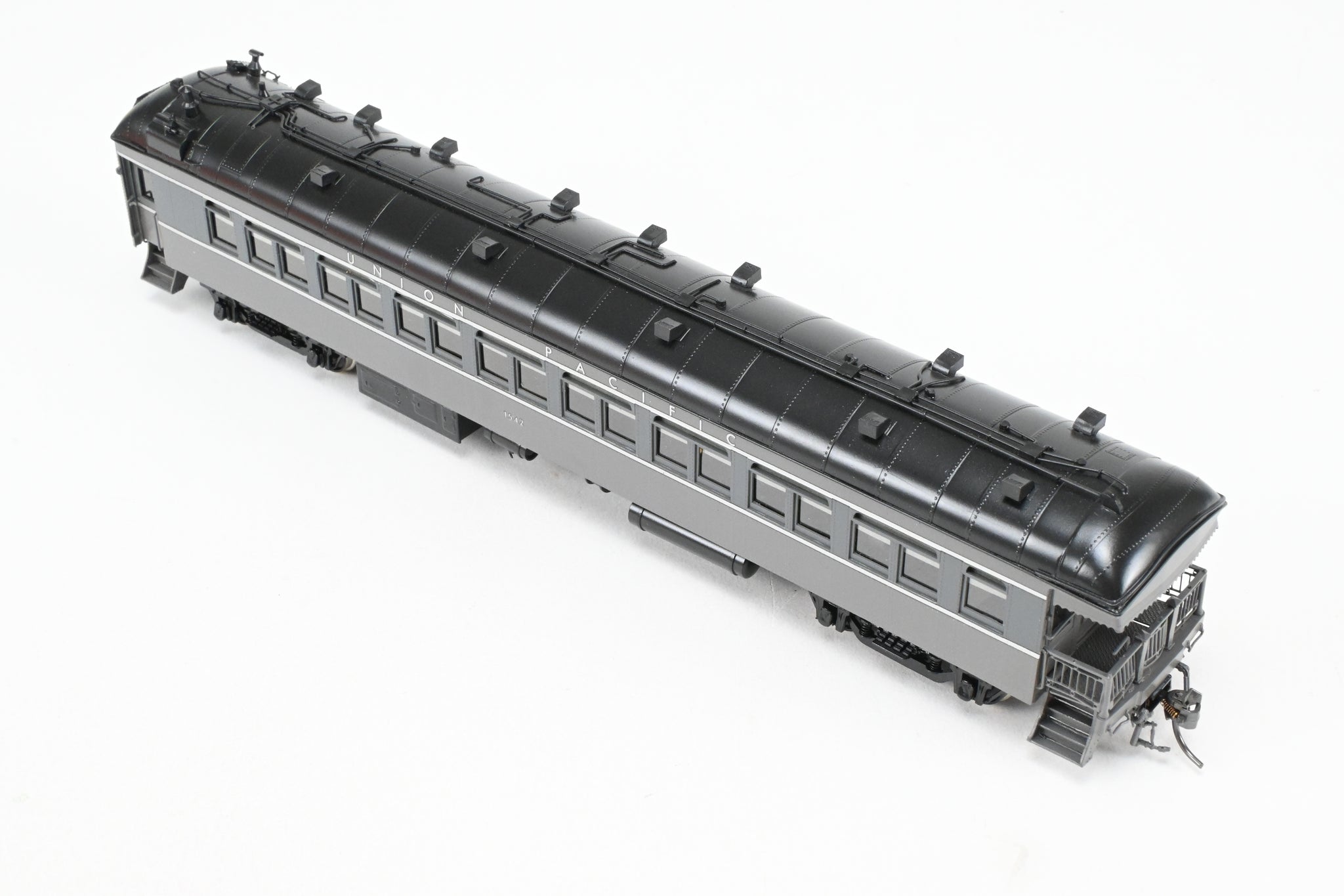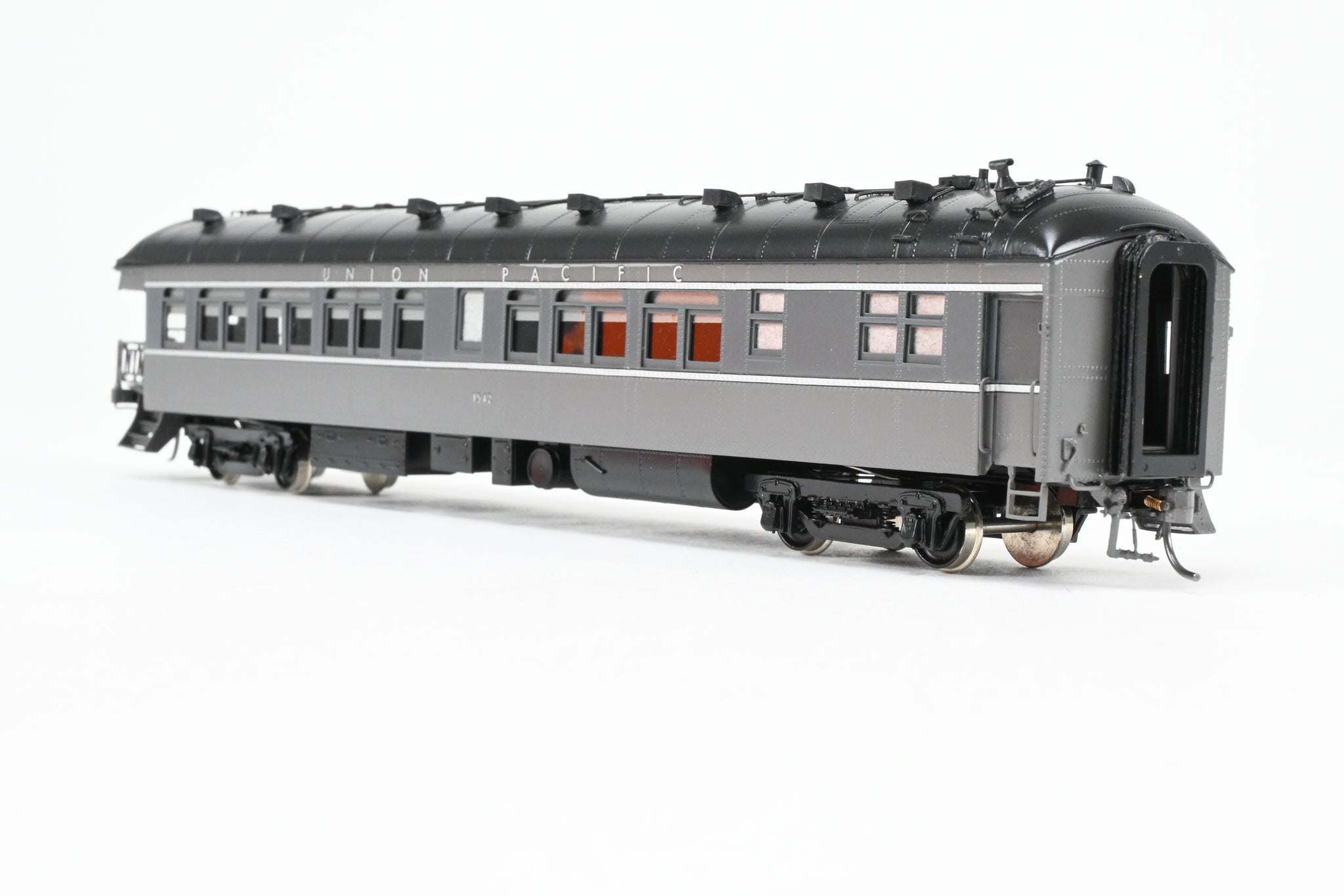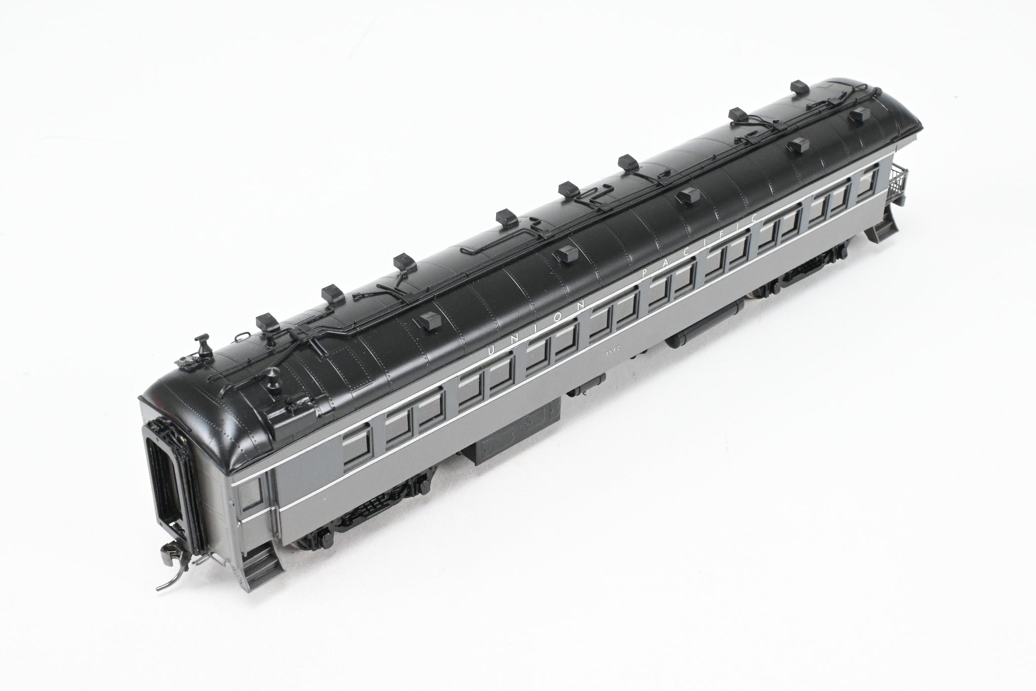 1989 Precision Scale Co. imported model built by Hyodong in Korea. Box shows moderate shelf wear. Model is beautifully pro-painted in UP's Two-Tone Gray scheme numbered 1542. Full glazing throughout and diaphragm on vestibule end installed. Although this is a SP car, it is a Harriman Standard car, it can be used in Union Pacific service.