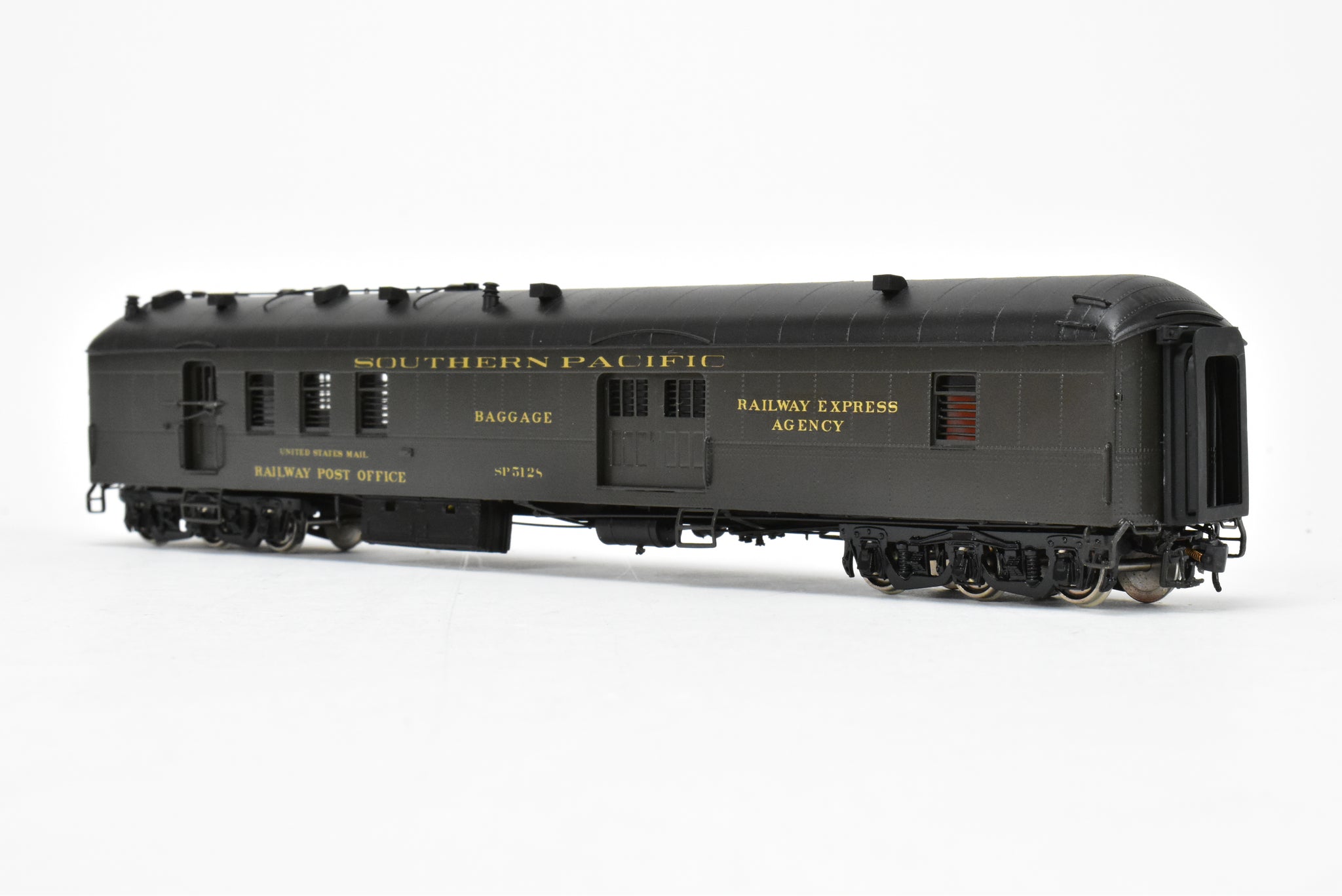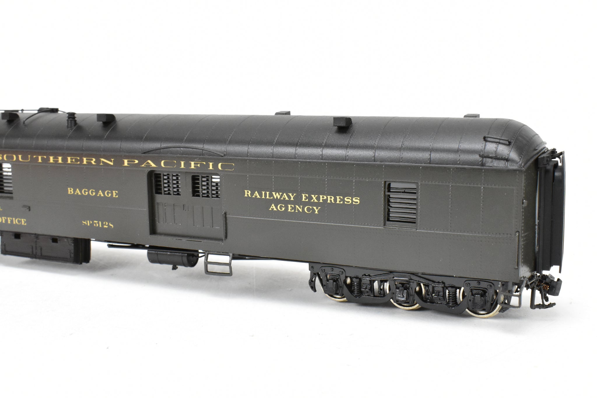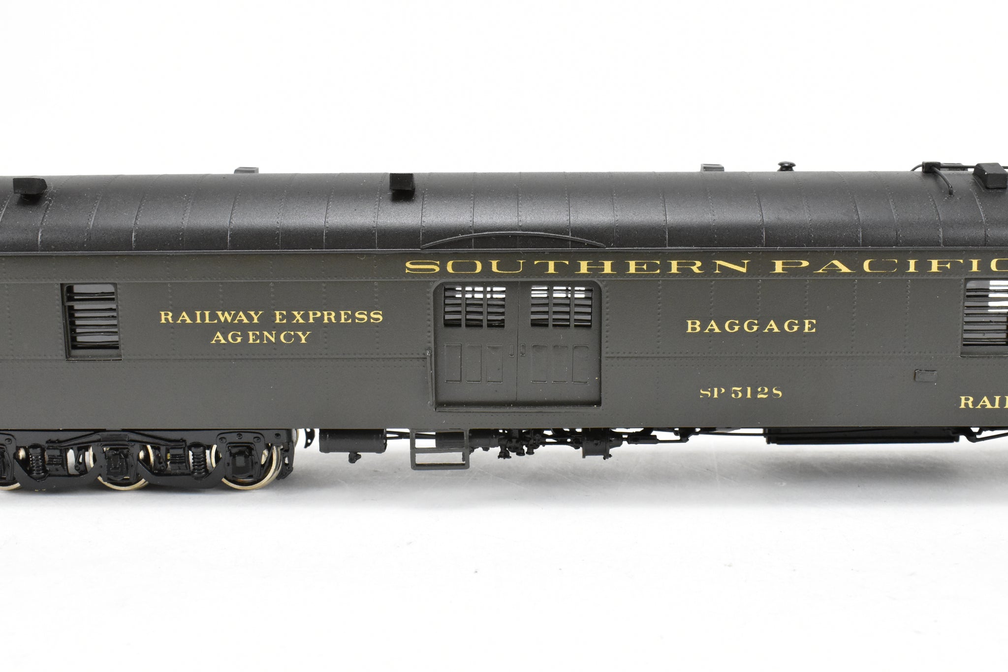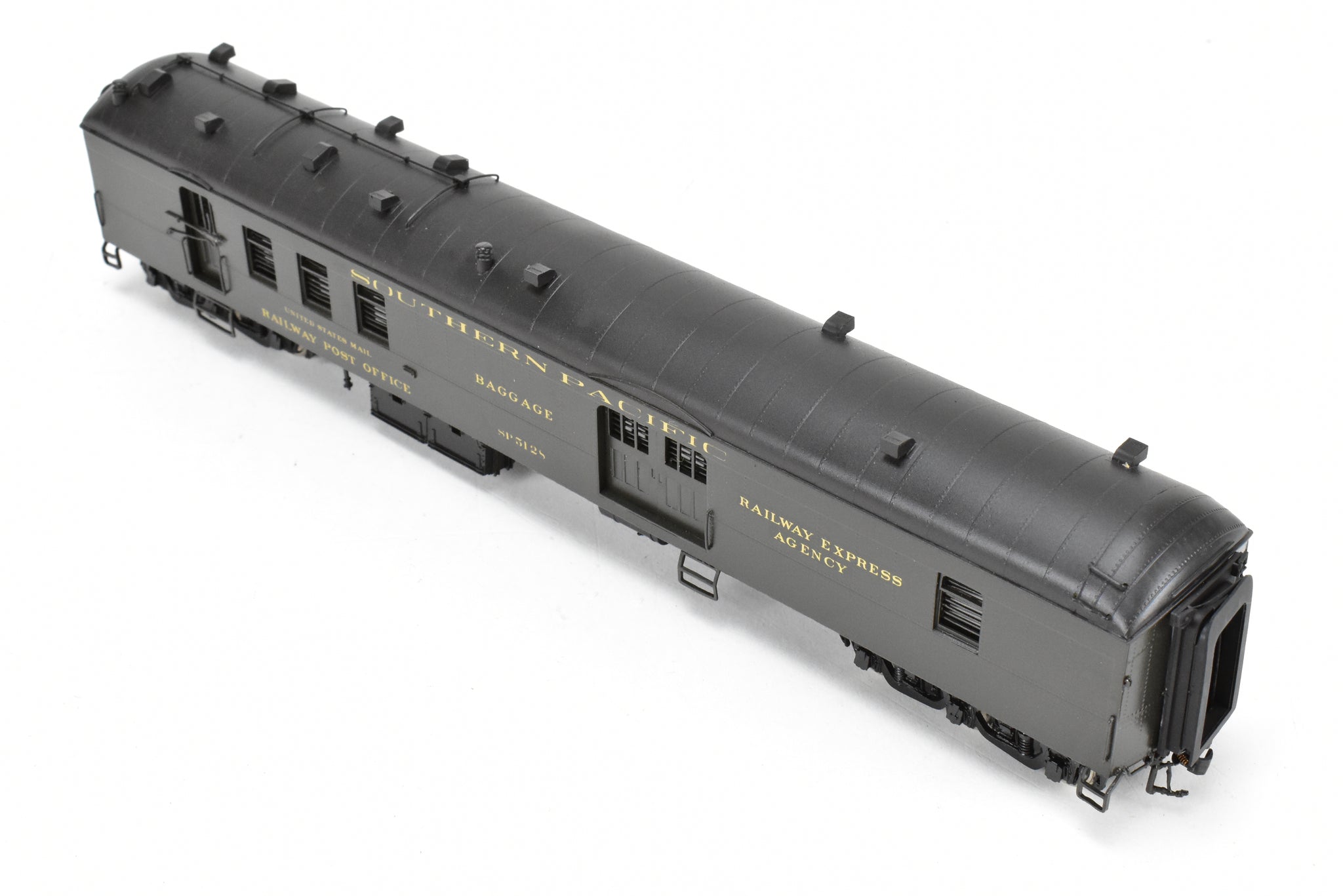 1992 Precision Scale Co. imported model built by Jin Heung in Korea. Box shows mild shelf wear NOTE: Wrong Box - Box shows the same car, but Factory painted in Two Tone Gray. No spare parts. Working baggage compartment doors. Factory painted in SP's olive Green/Black. - SP no. 5128. These were used on SP's mail trains, the Overland Limited, The Pacific Limited. An Excellent model.