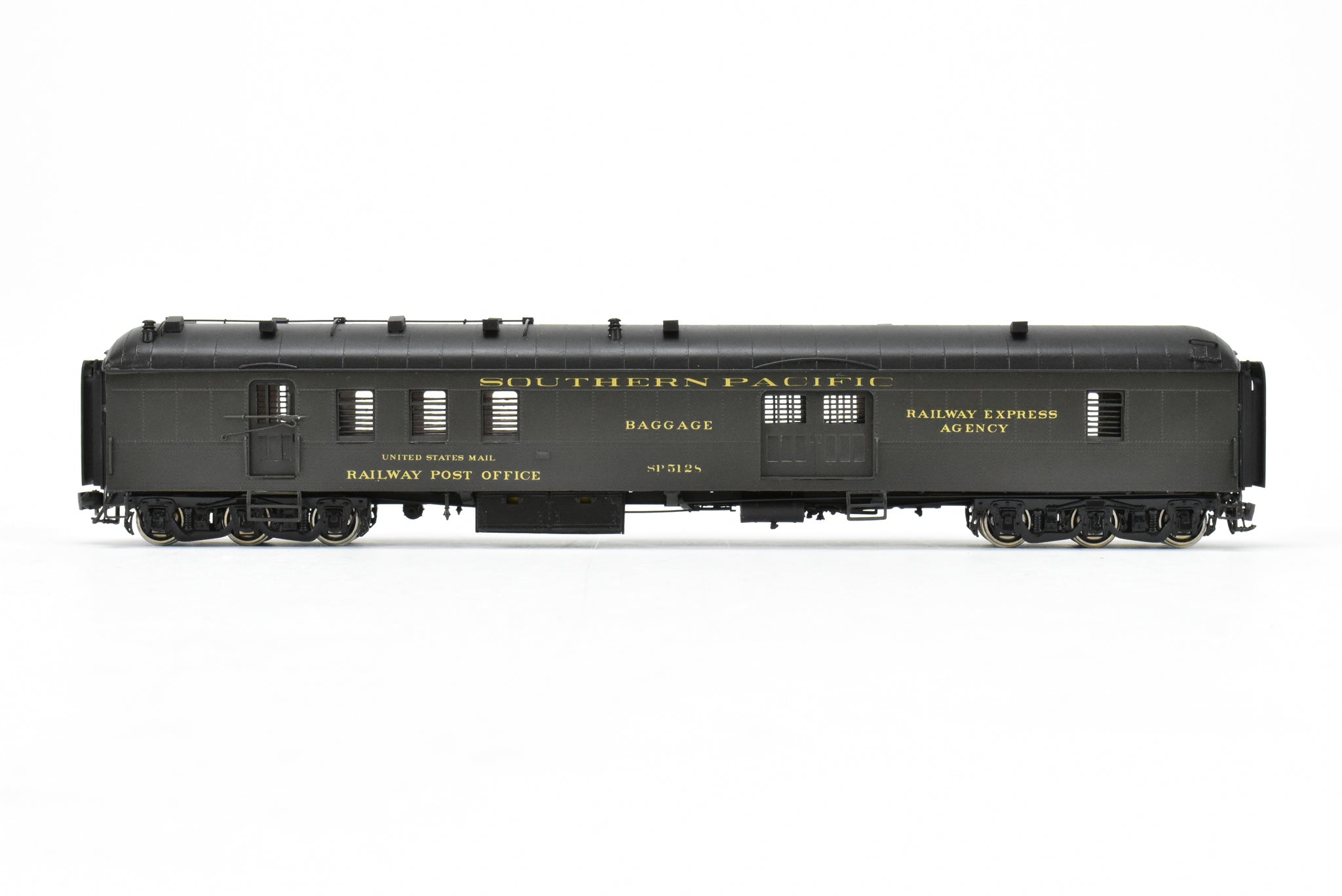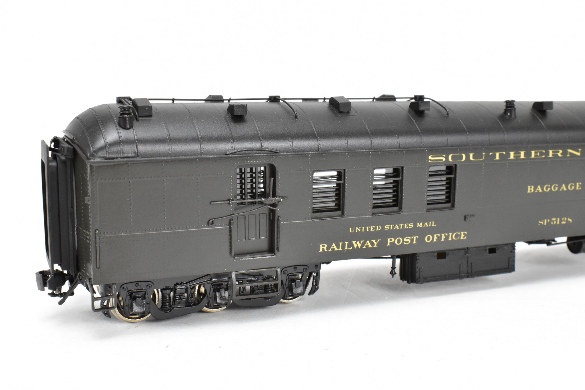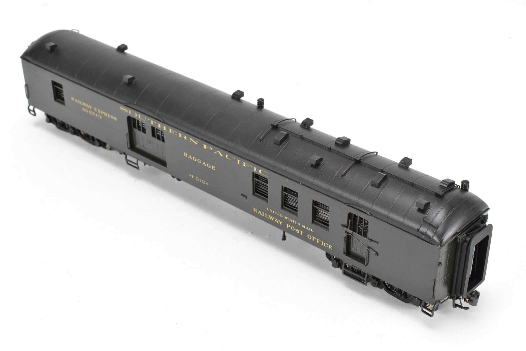 1992 Precision Scale Co. imported model built by Jin Heung in Korea. Box shows mild shelf wear NOTE: Wrong Box - Box shows the same car, but Factory painted in Two Tone Gray. No spare parts. Working baggage compartment doors. Factory painted in SP's olive Green/Black. - SP no. 5128. These were used on SP's mail trains, the Overland Limited, The Pacific Limited. An Excellent model.