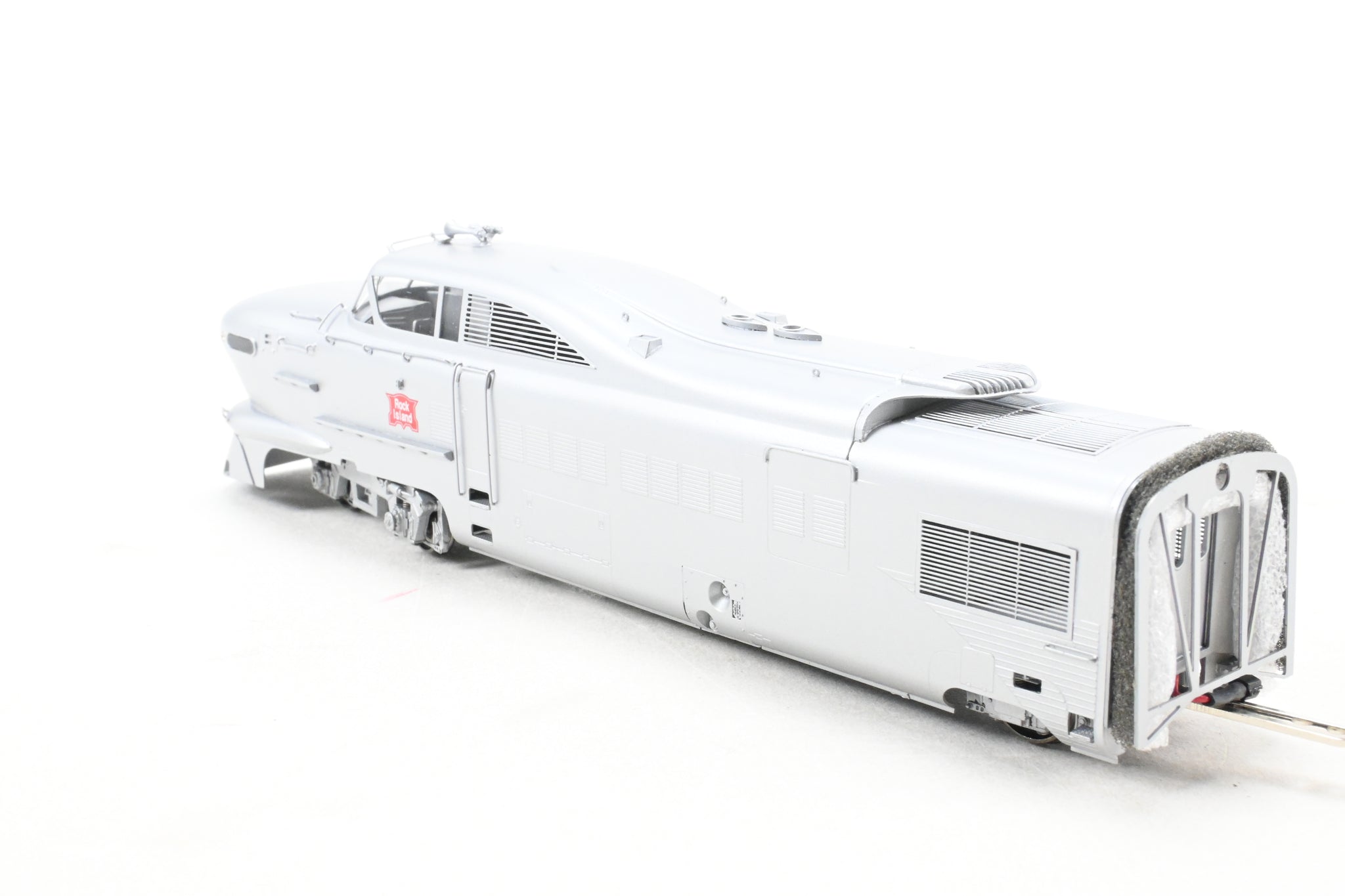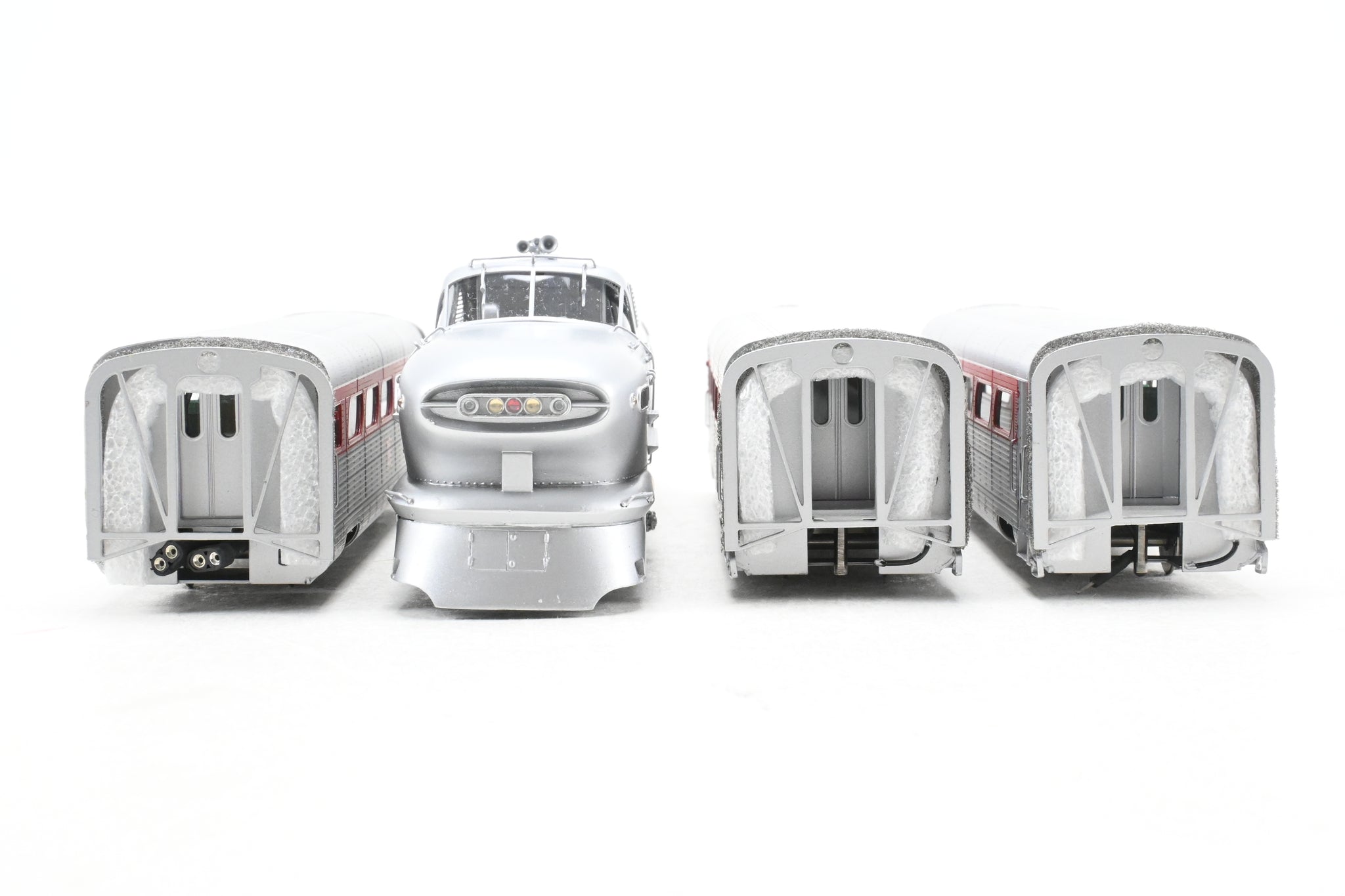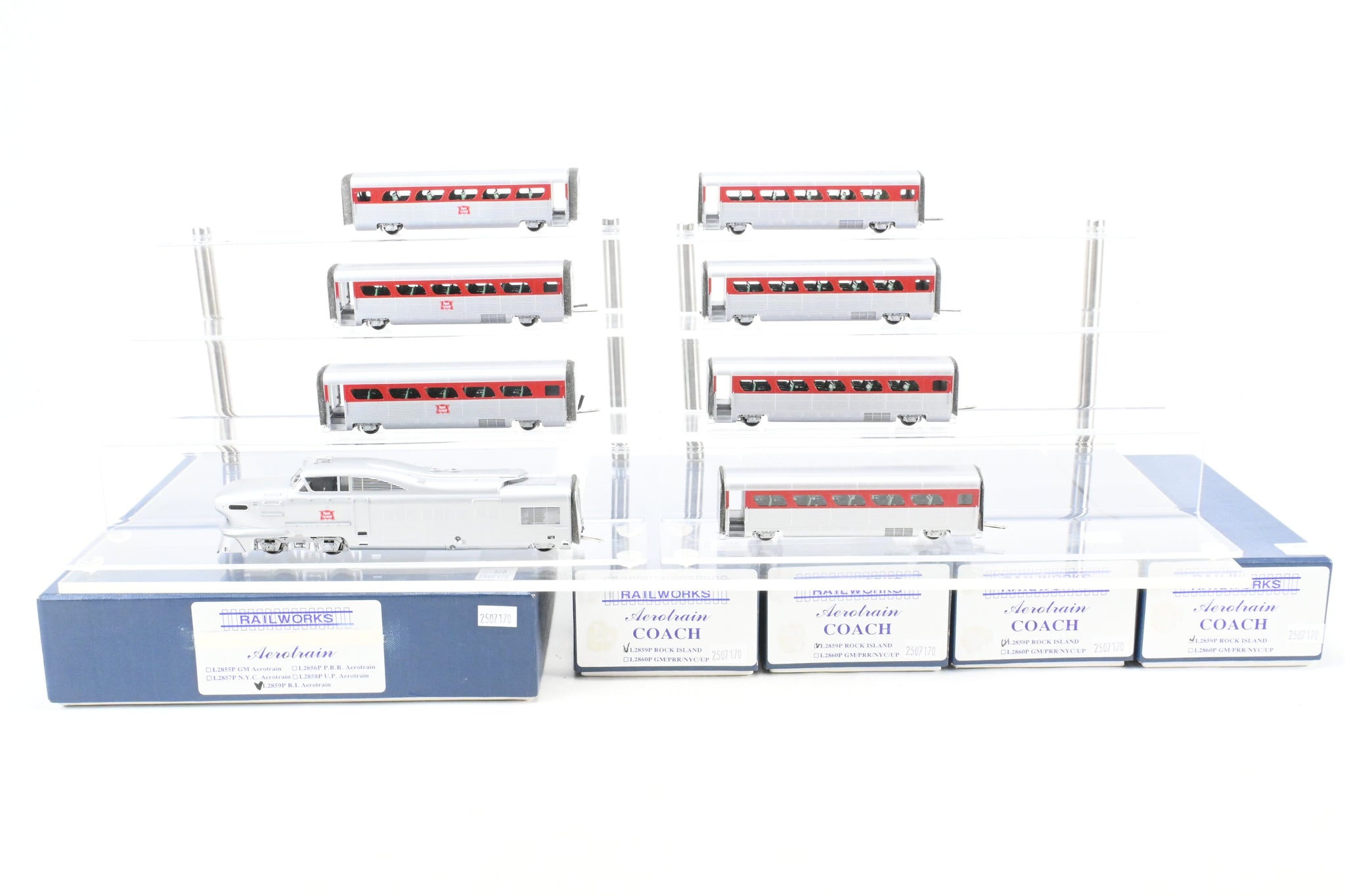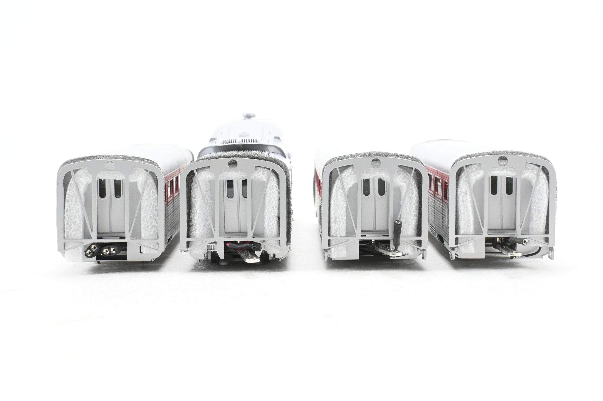 2001 run Railworks imported models built by Boo-Rim in Korea. Boxes shows almost no shelf wear. Spare parts included in all boxes. Set L2859P consists of the LWT-12 power unit and three Aerotrain coaches. There is in addition of four Aerotrain coaches to make a full seven car consist. All coaches have foam full width diaphragms installed. NOTE: There is the observation tail section in the box so that a modeler can convert one of the coaches to an observation - see photos. All models are beautifully factory painted and lettered and have full glazing installed. Model has been test ran and lubed. This set is the Rock Island's "Jet Rocket". This set was used in Chicago commuter service in the 50's and 60's. The prototype LWT-12 set survives at the National Transportation Museum in Kirkwood (St. Louis) Missouri. Note: Lighting in three coaches in boxes set is inoperative.