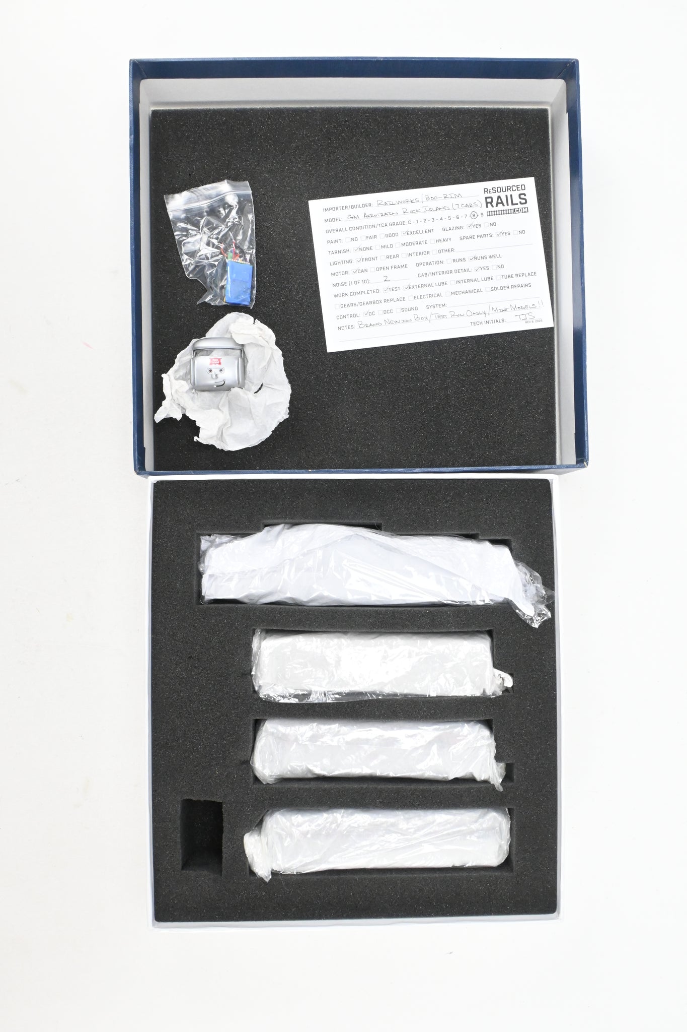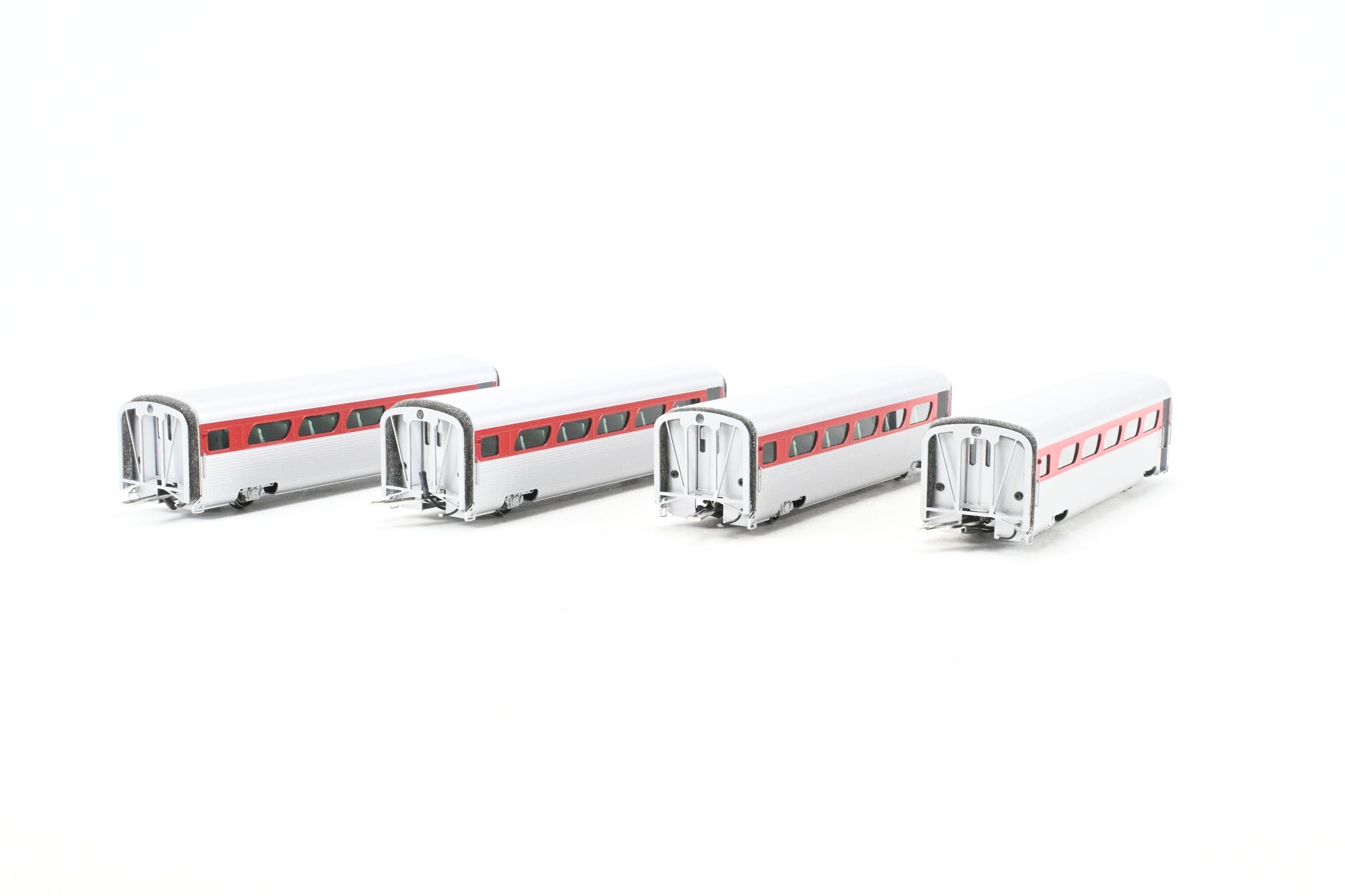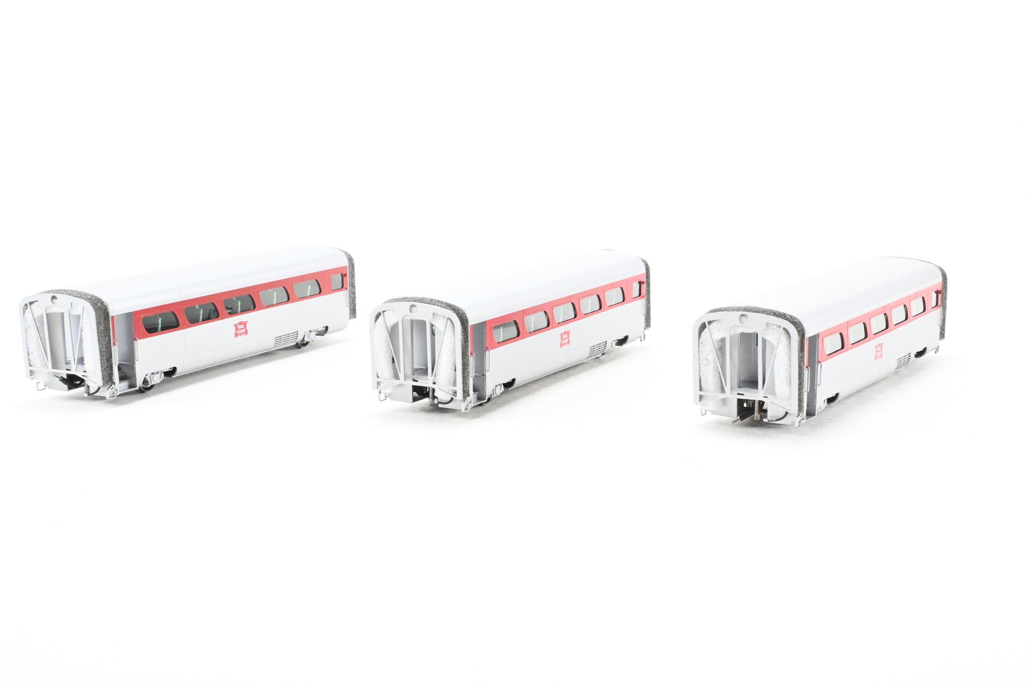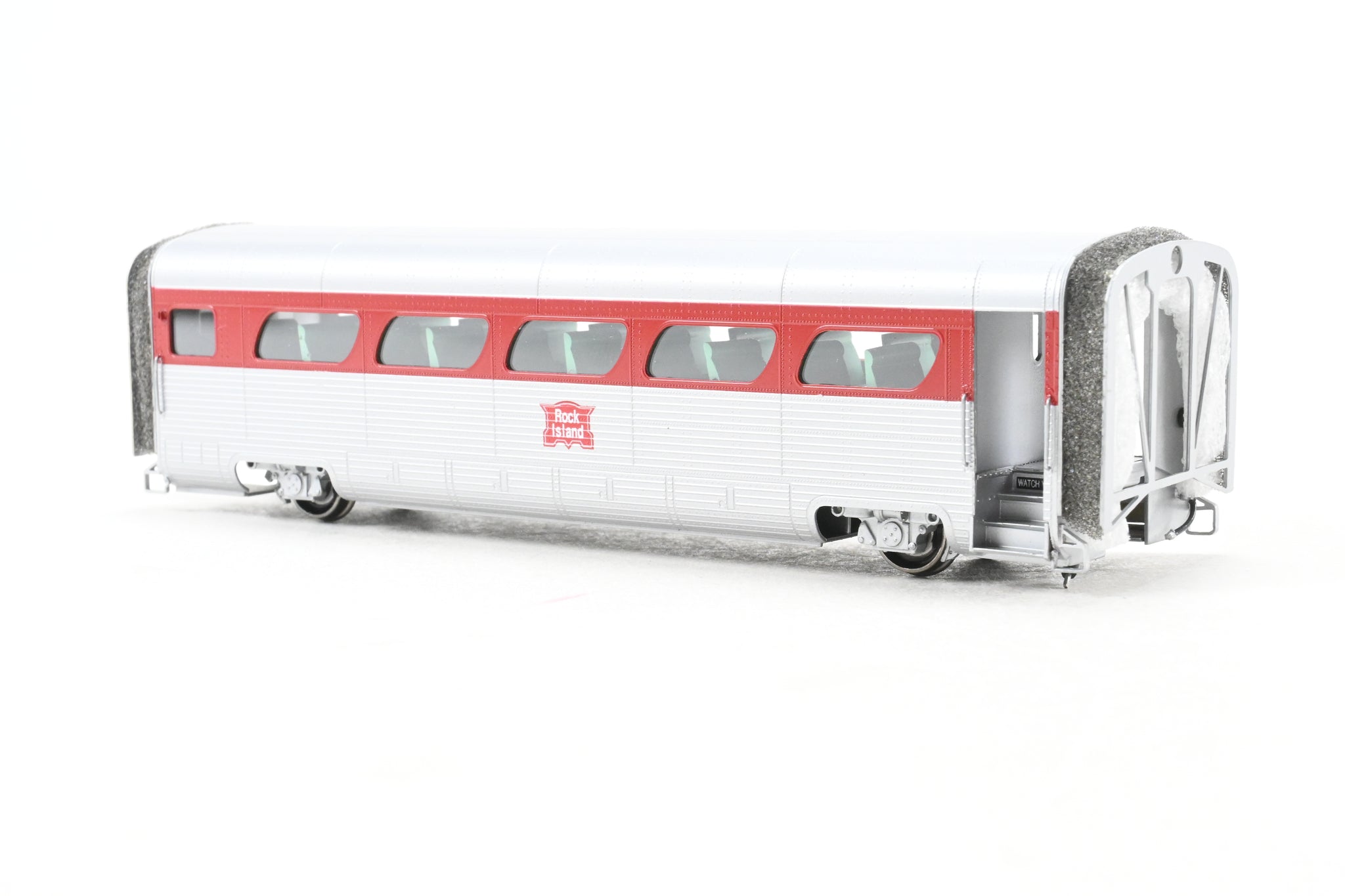 2001 run Railworks imported models built by Boo-Rim in Korea. Boxes shows almost no shelf wear. Spare parts included in all boxes. Set L2859P consists of the LWT-12 power unit and three Aerotrain coaches. There is in addition of four Aerotrain coaches to make a full seven car consist. All coaches have foam full width diaphragms installed. NOTE: There is the observation tail section in the box so that a modeler can convert one of the coaches to an observation - see photos. All models are beautifully factory painted and lettered and have full glazing installed. Model has been test ran and lubed. This set is the Rock Island's "Jet Rocket". This set was used in Chicago commuter service in the 50's and 60's. The prototype LWT-12 set survives at the National Transportation Museum in Kirkwood (St. Louis) Missouri. Note: Lighting in three coaches in boxes set is inoperative.
