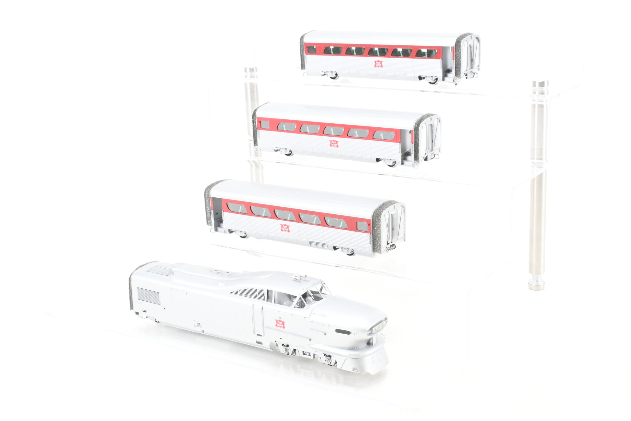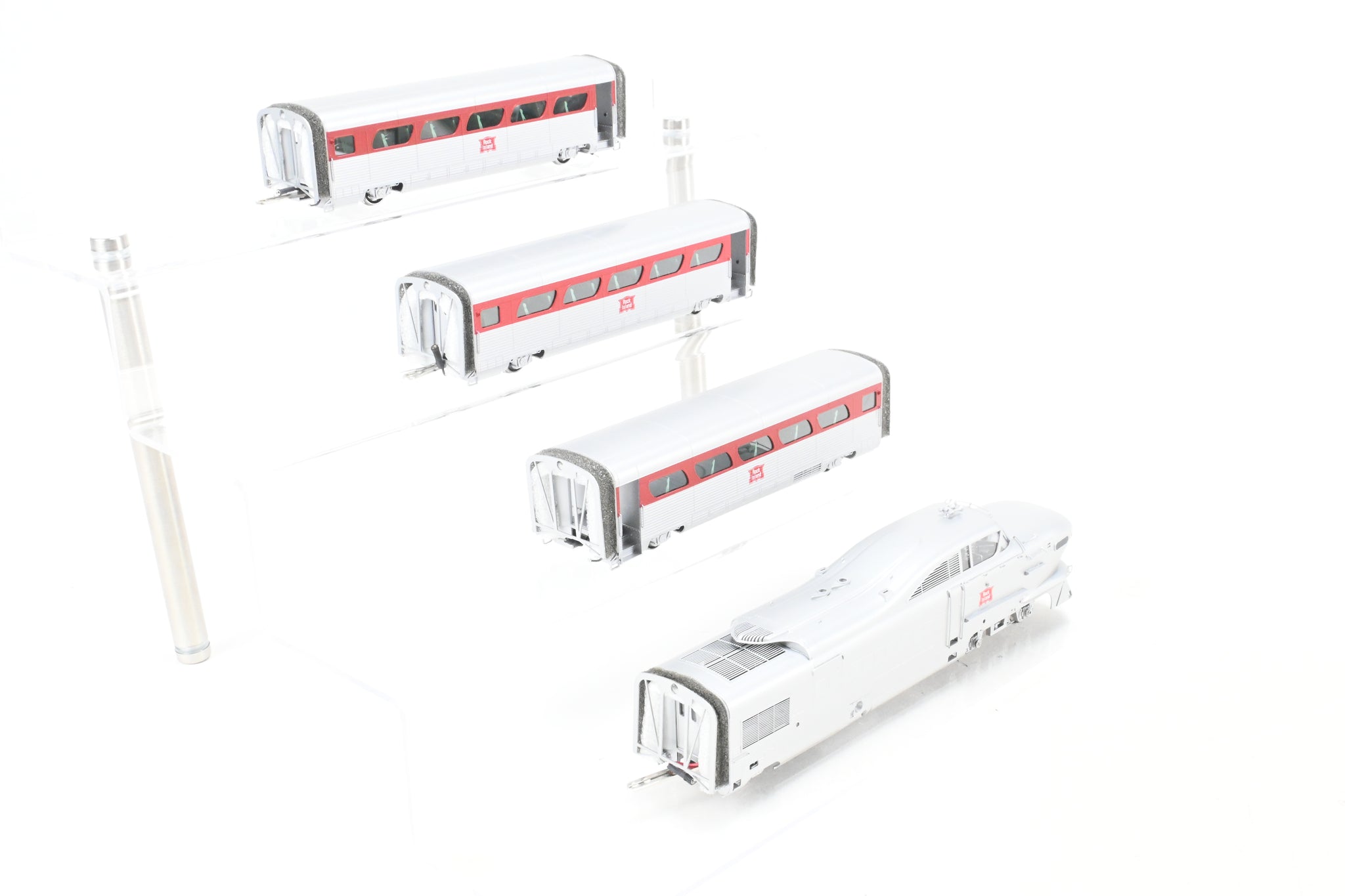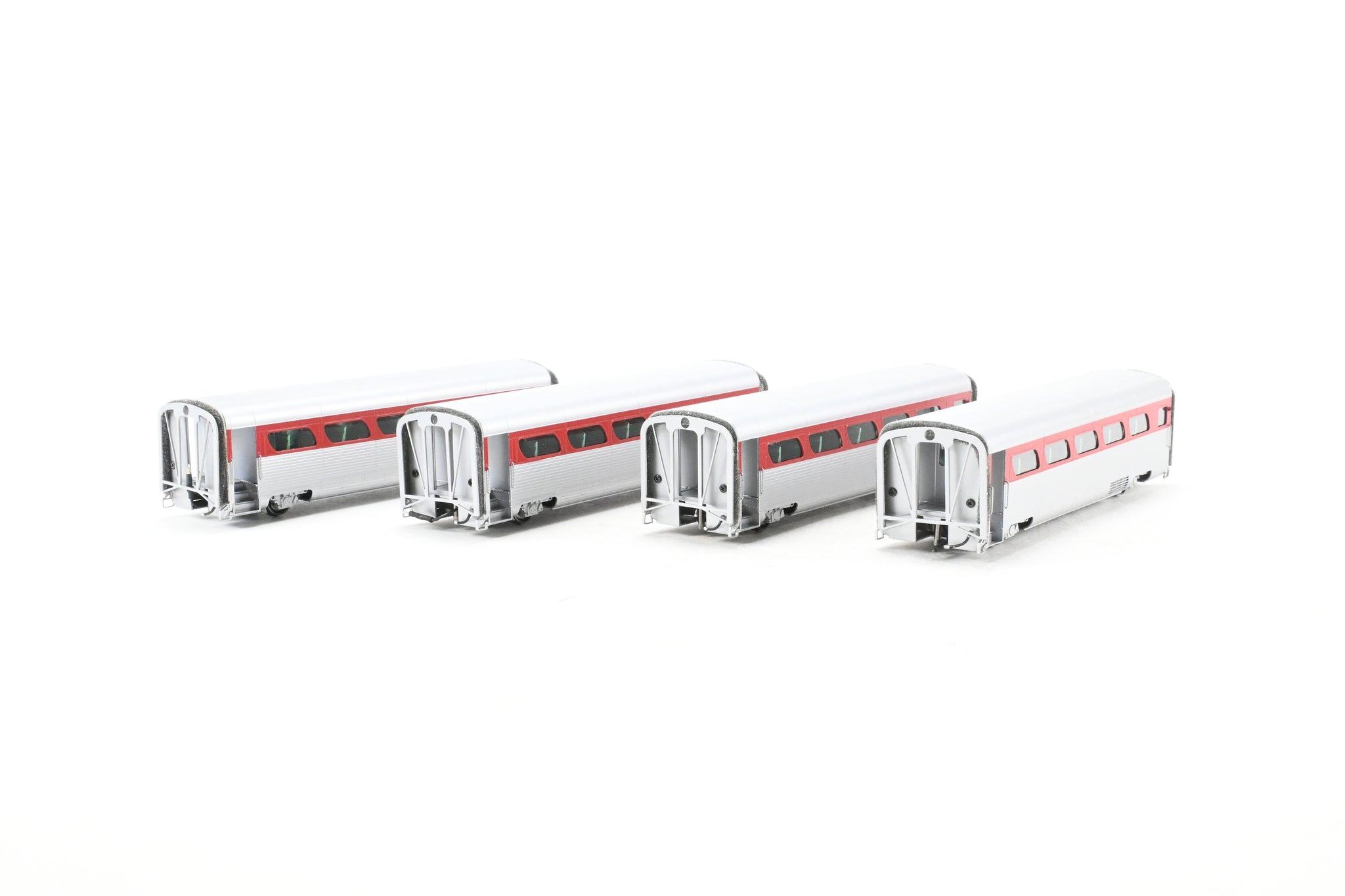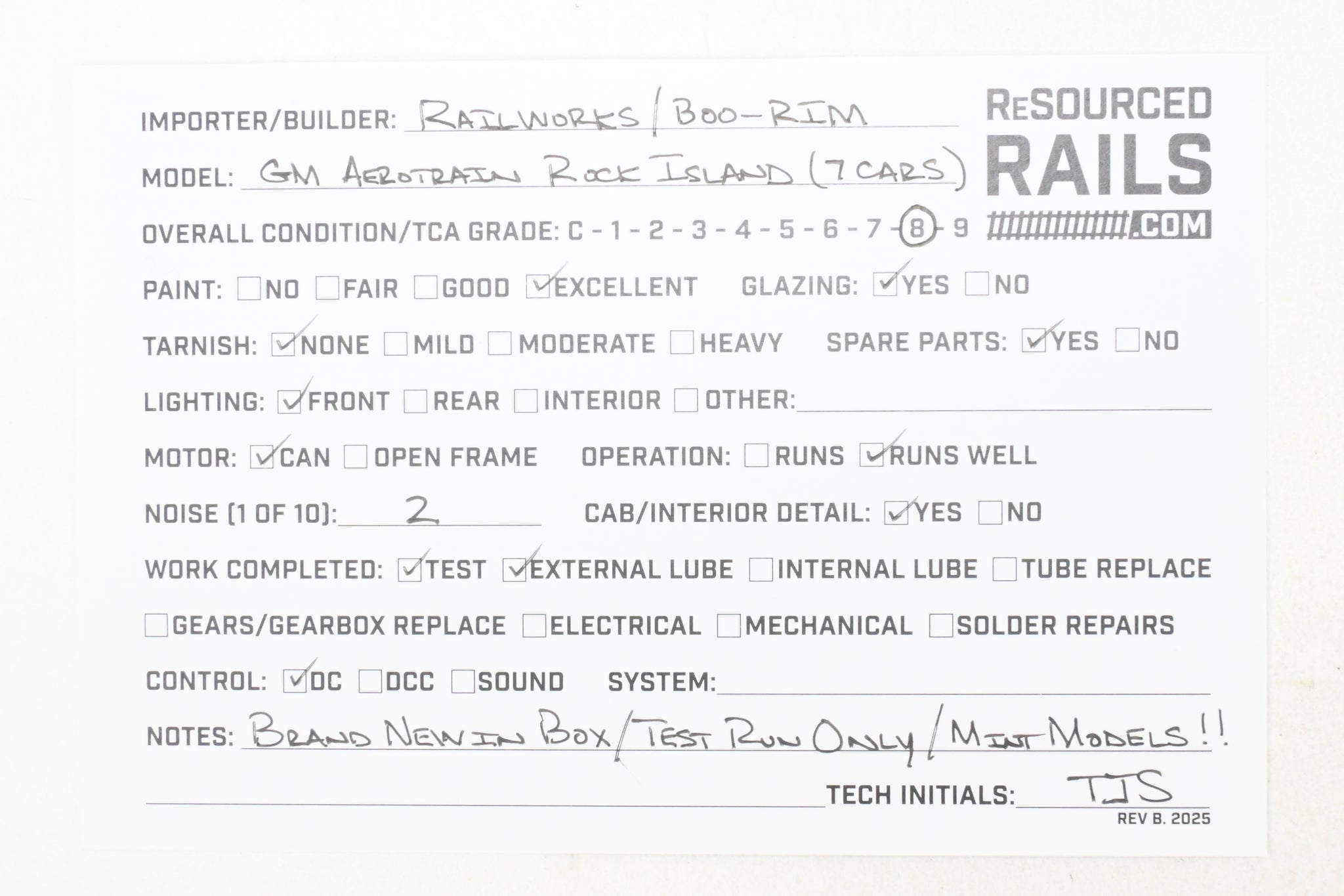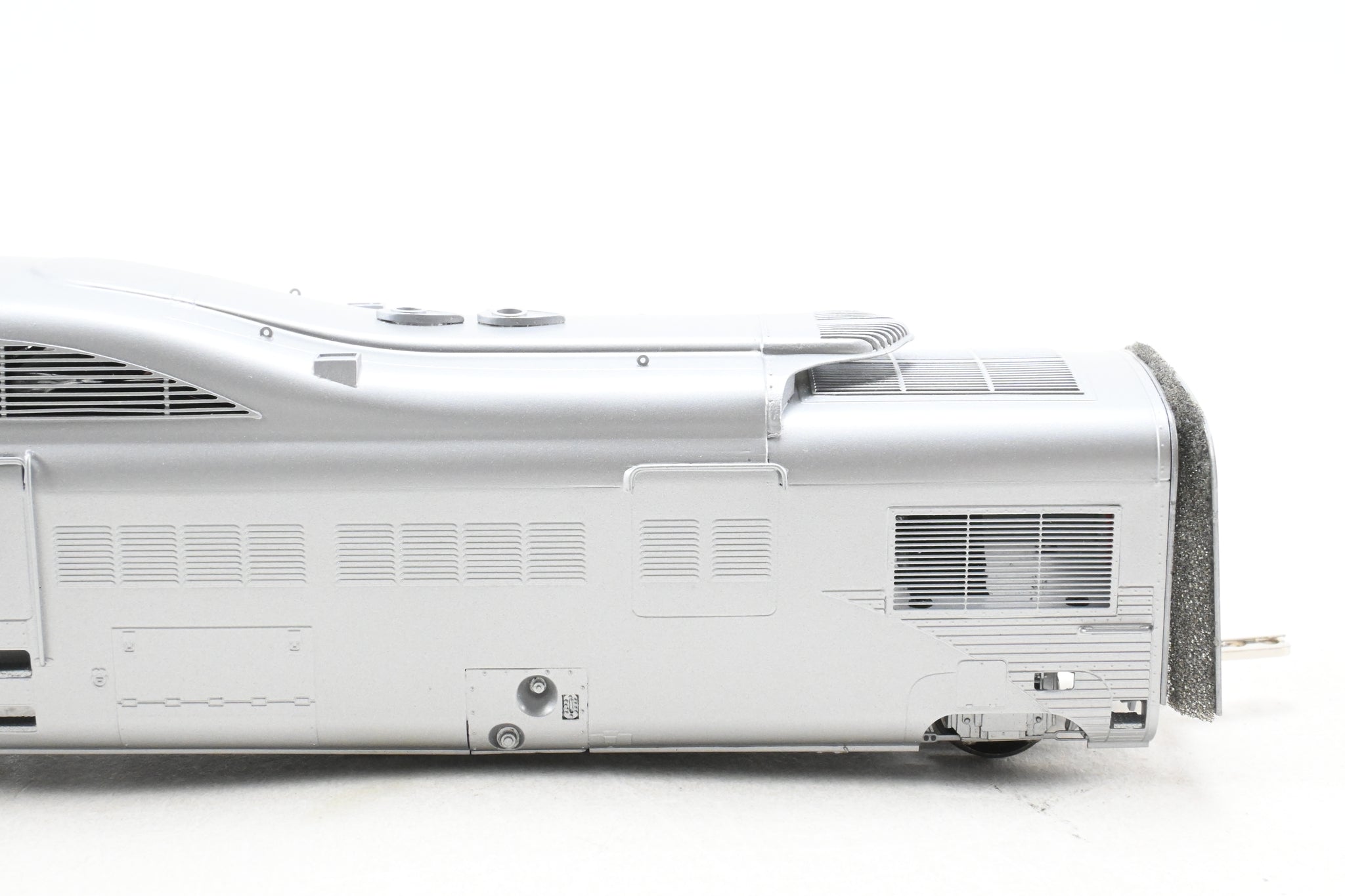 2001 run Railworks imported models built by Boo-Rim in Korea. Boxes shows almost no shelf wear. Spare parts included in all boxes. Set L2859P consists of the LWT-12 power unit and three Aerotrain coaches. There is in addition of four Aerotrain coaches to make a full seven car consist. All coaches have foam full width diaphragms installed. NOTE: There is the observation tail section in the box so that a modeler can convert one of the coaches to an observation - see photos. All models are beautifully factory painted and lettered and have full glazing installed. Model has been test ran and lubed. This set is the Rock Island's "Jet Rocket". This set was used in Chicago commuter service in the 50's and 60's. The prototype LWT-12 set survives at the National Transportation Museum in Kirkwood (St. Louis) Missouri. Note: Lighting in three coaches in boxes set is inoperative.
