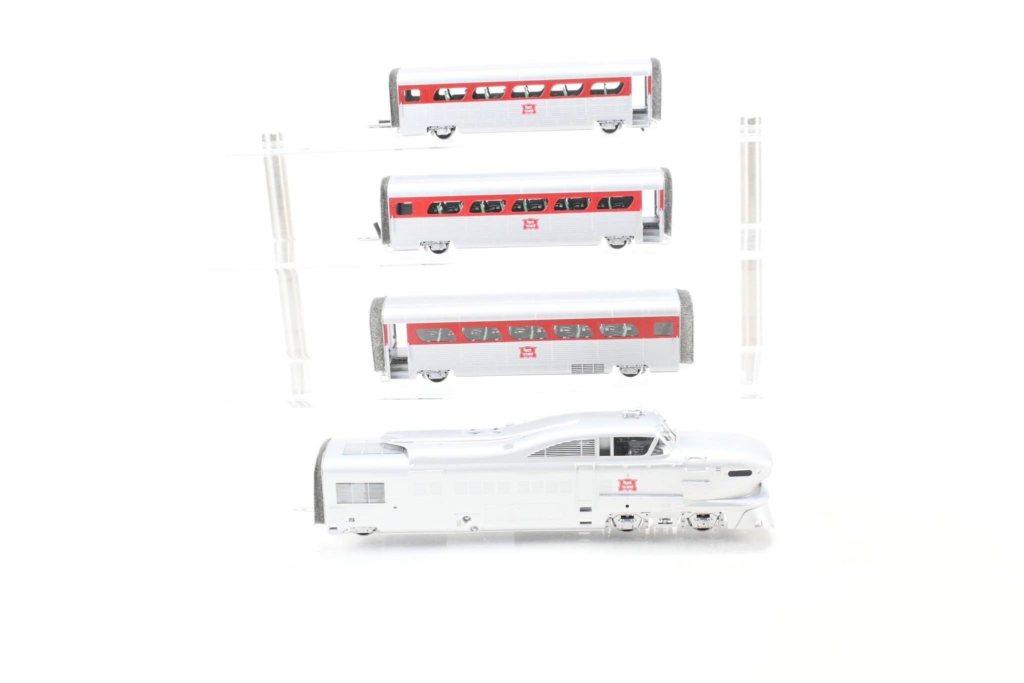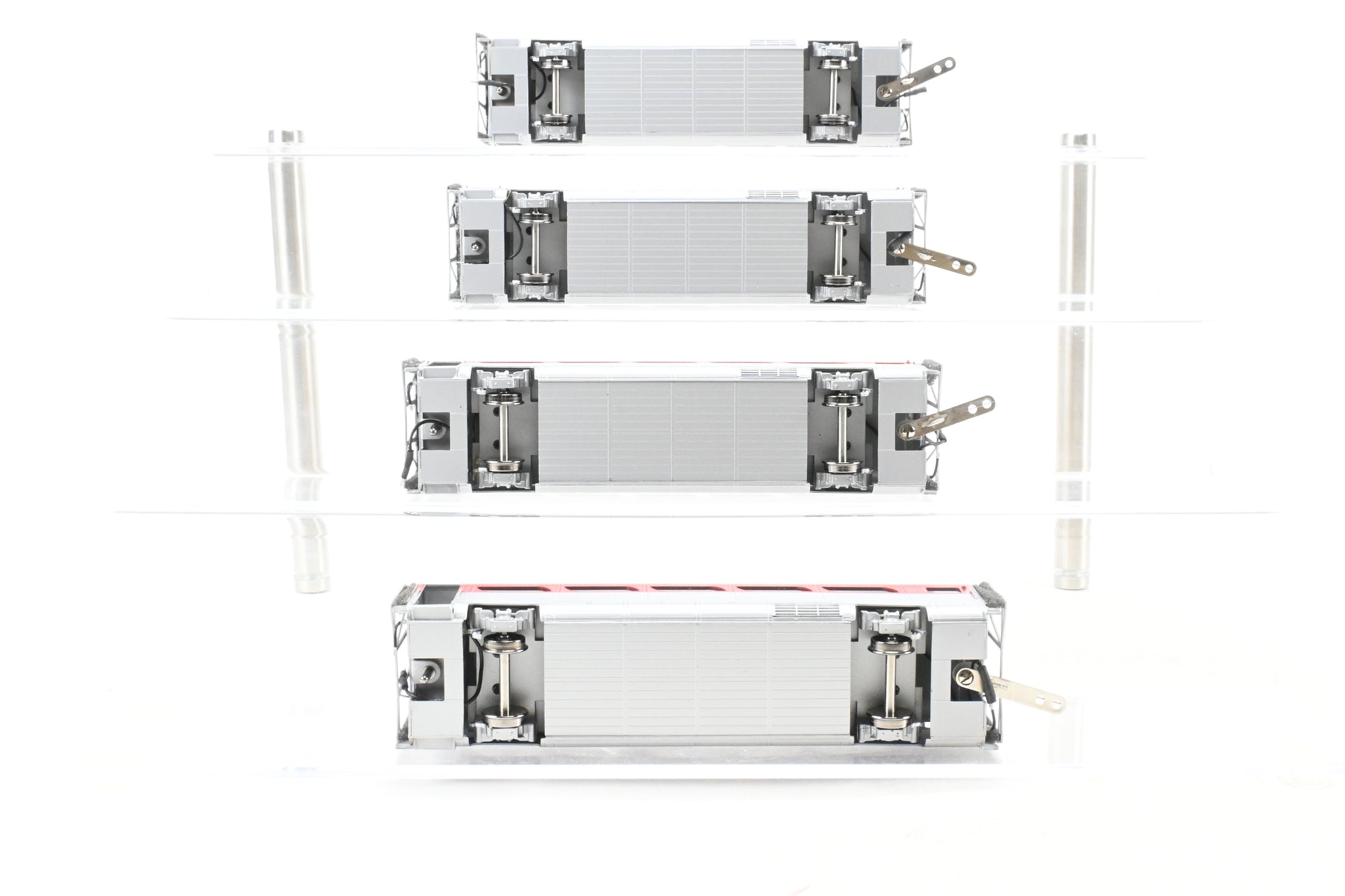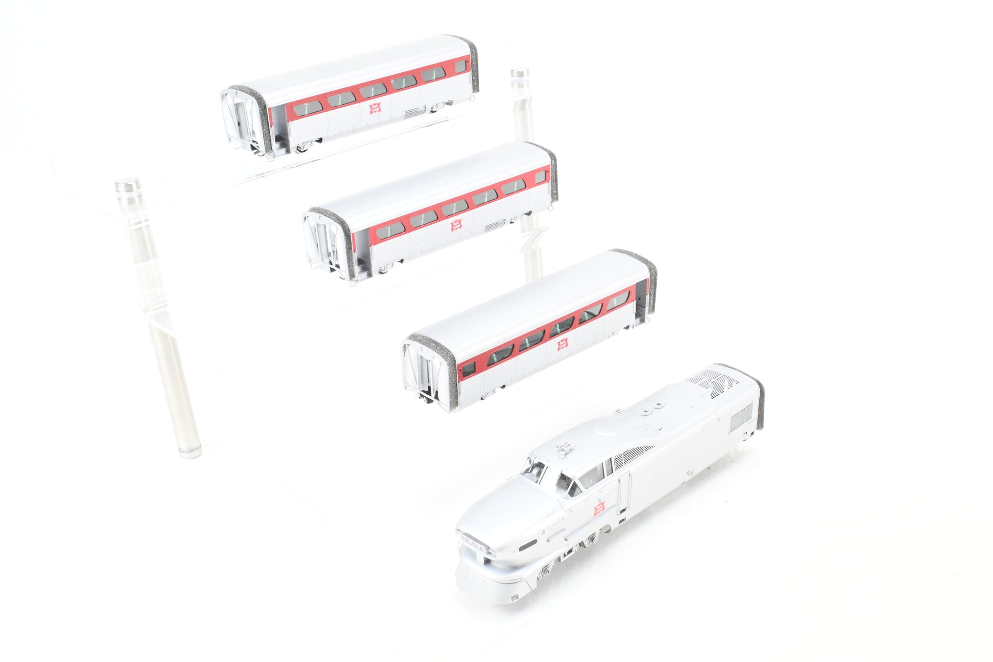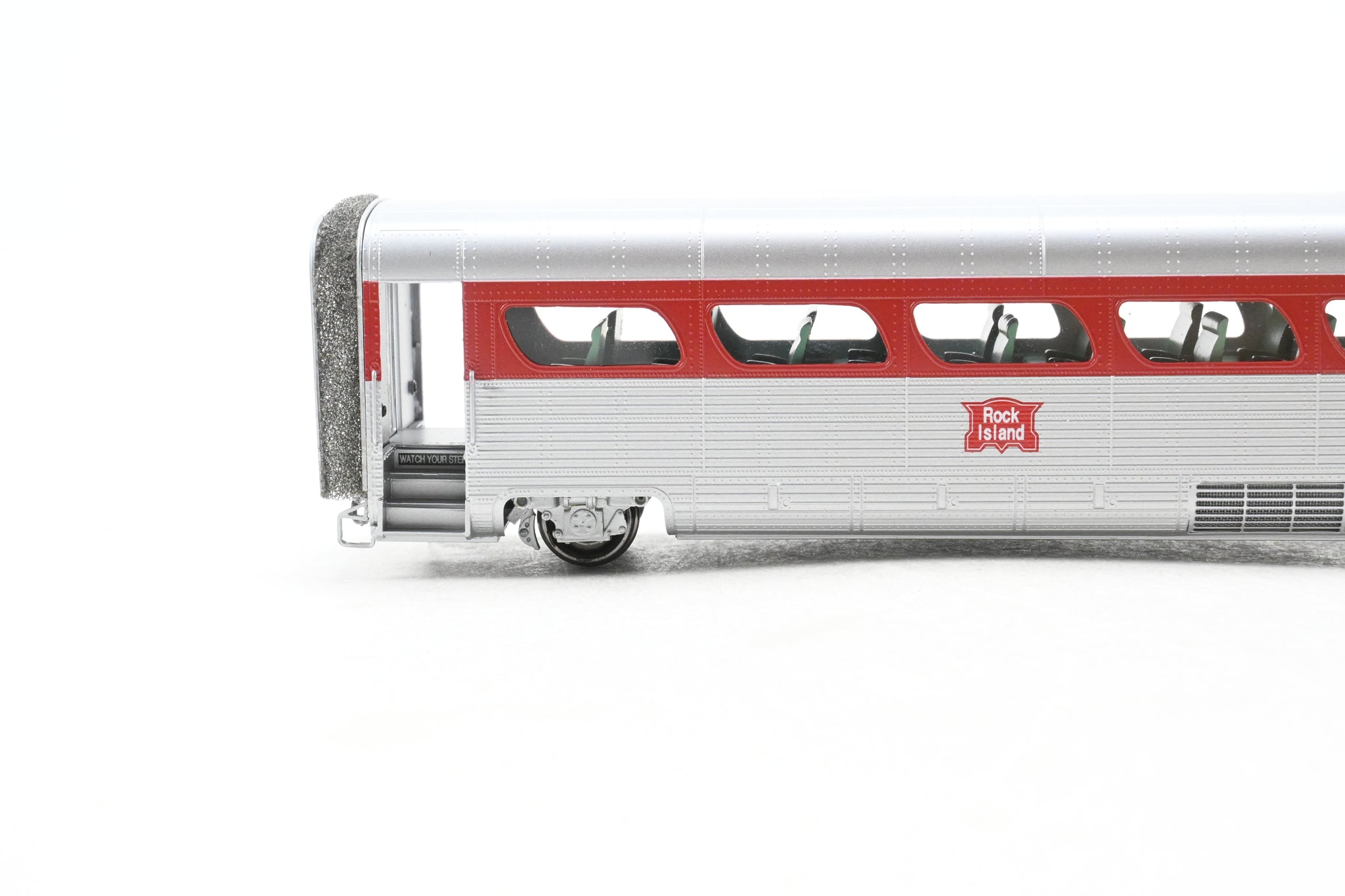 2001 run Railworks imported models built by Boo-Rim in Korea. Boxes shows almost no shelf wear. Spare parts included in all boxes. Set L2859P consists of the LWT-12 power unit and three Aerotrain coaches. There is in addition of four Aerotrain coaches to make a full seven car consist. All coaches have foam full width diaphragms installed. NOTE: There is the observation tail section in the box so that a modeler can convert one of the coaches to an observation - see photos. All models are beautifully factory painted and lettered and have full glazing installed. Model has been test ran and lubed. This set is the Rock Island's "Jet Rocket". This set was used in Chicago commuter service in the 50's and 60's. The prototype LWT-12 set survives at the National Transportation Museum in Kirkwood (St. Louis) Missouri. Note: Lighting in three coaches in boxes set is inoperative.