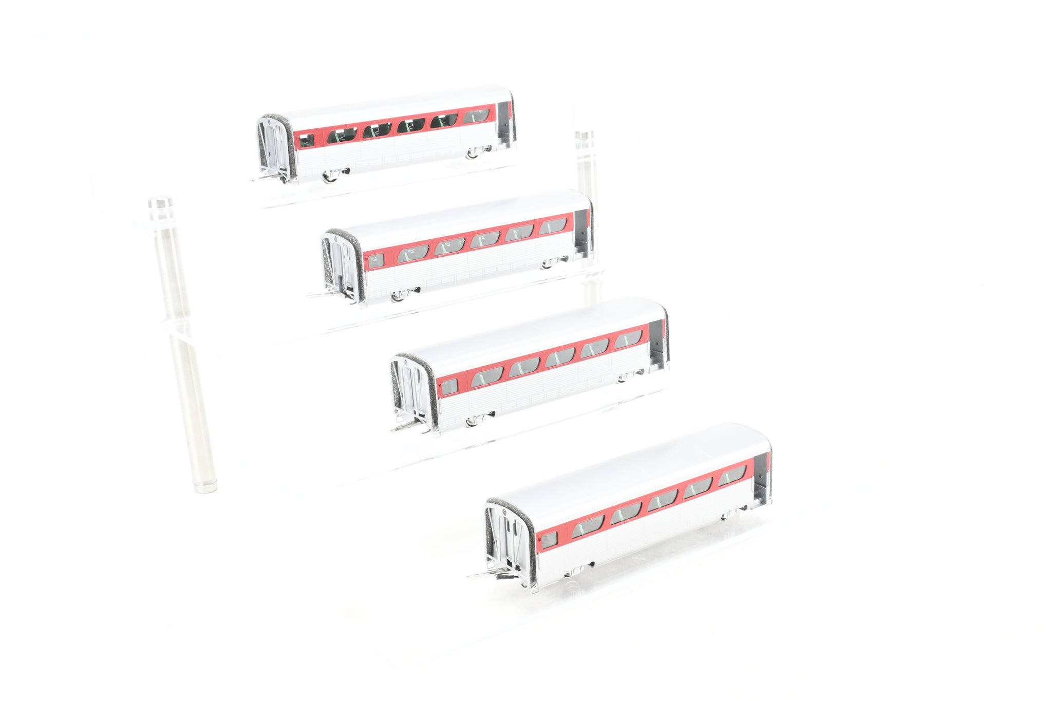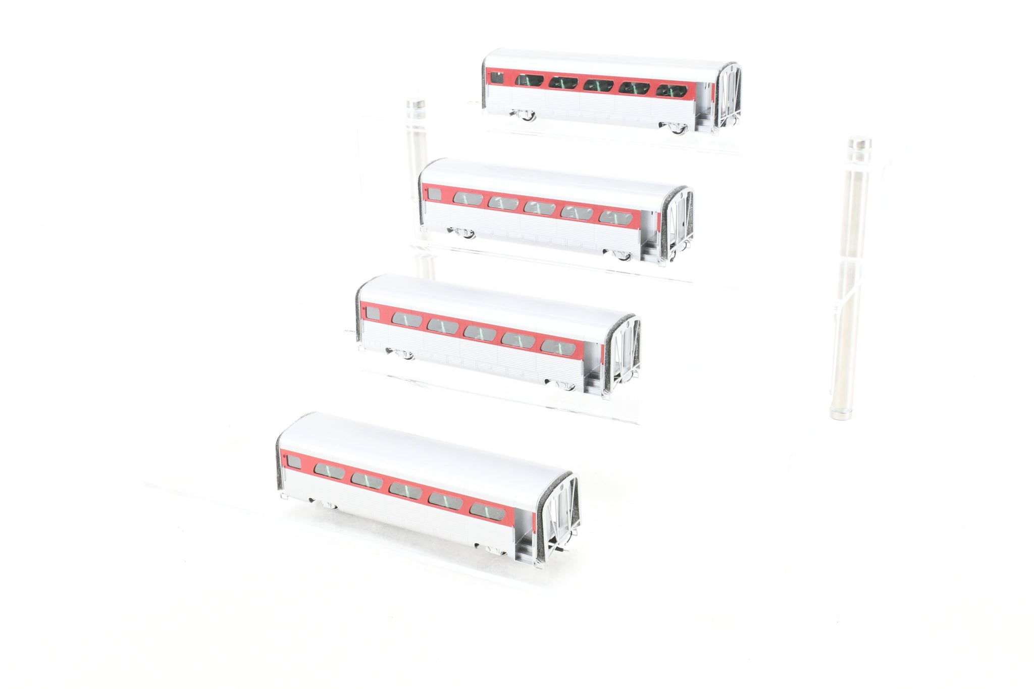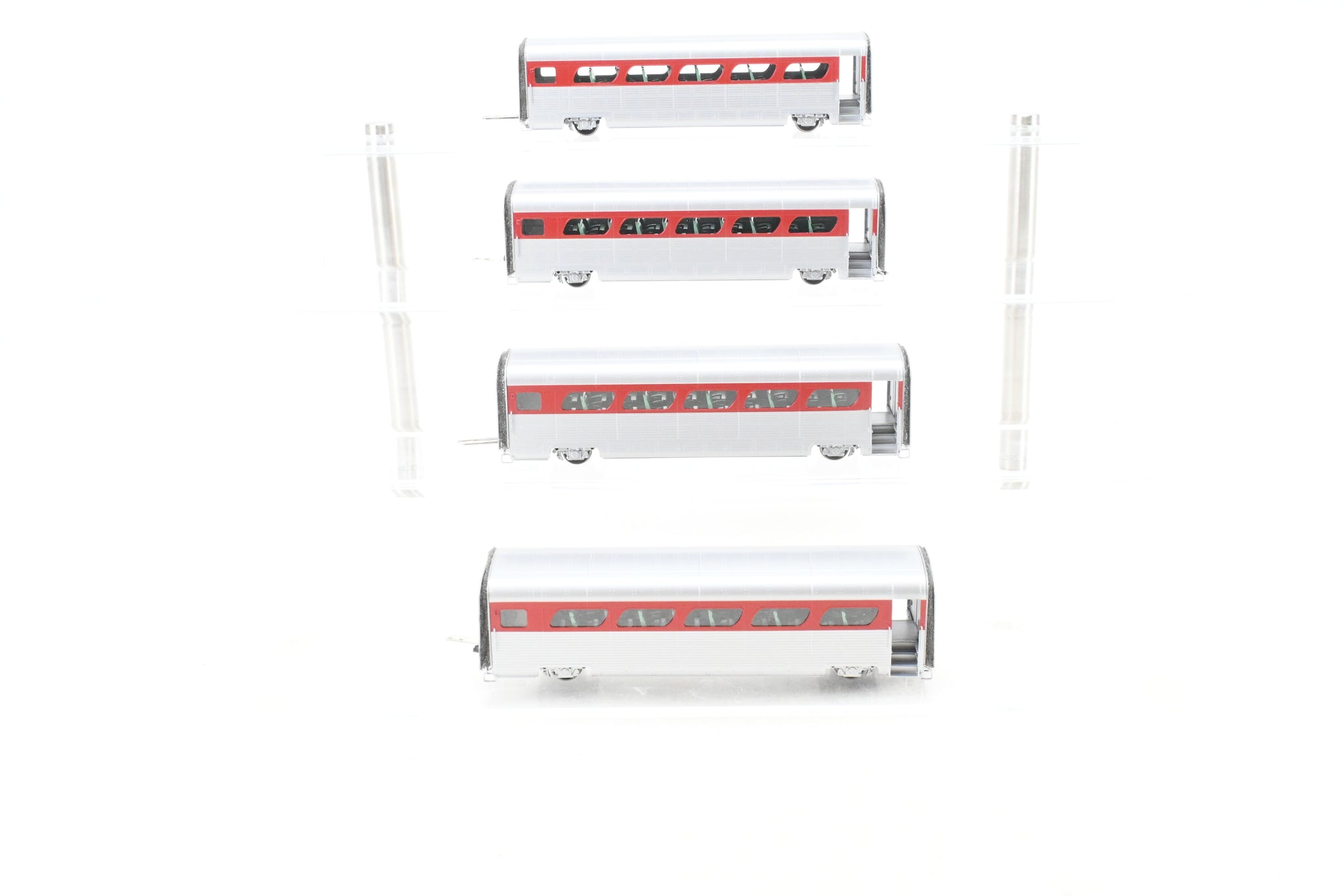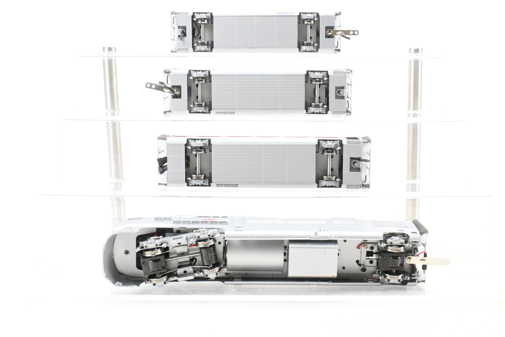 2001 run Railworks imported models built by Boo-Rim in Korea. Boxes shows almost no shelf wear. Spare parts included in all boxes. Set L2859P consists of the LWT-12 power unit and three Aerotrain coaches. There is in addition of four Aerotrain coaches to make a full seven car consist. All coaches have foam full width diaphragms installed. NOTE: There is the observation tail section in the box so that a modeler can convert one of the coaches to an observation - see photos. All models are beautifully factory painted and lettered and have full glazing installed. Model has been test ran and lubed. This set is the Rock Island's "Jet Rocket". This set was used in Chicago commuter service in the 50's and 60's. The prototype LWT-12 set survives at the National Transportation Museum in Kirkwood (St. Louis) Missouri. Note: Lighting in three coaches in boxes set is inoperative.