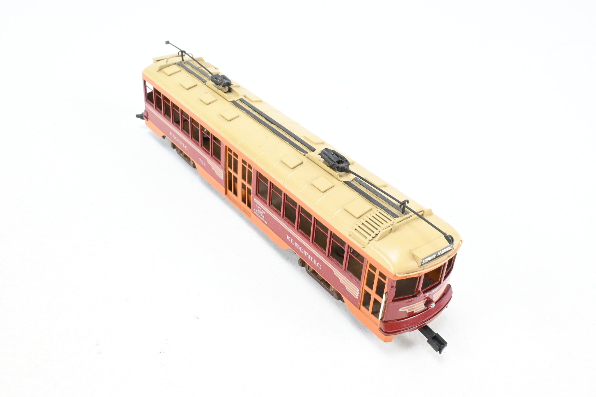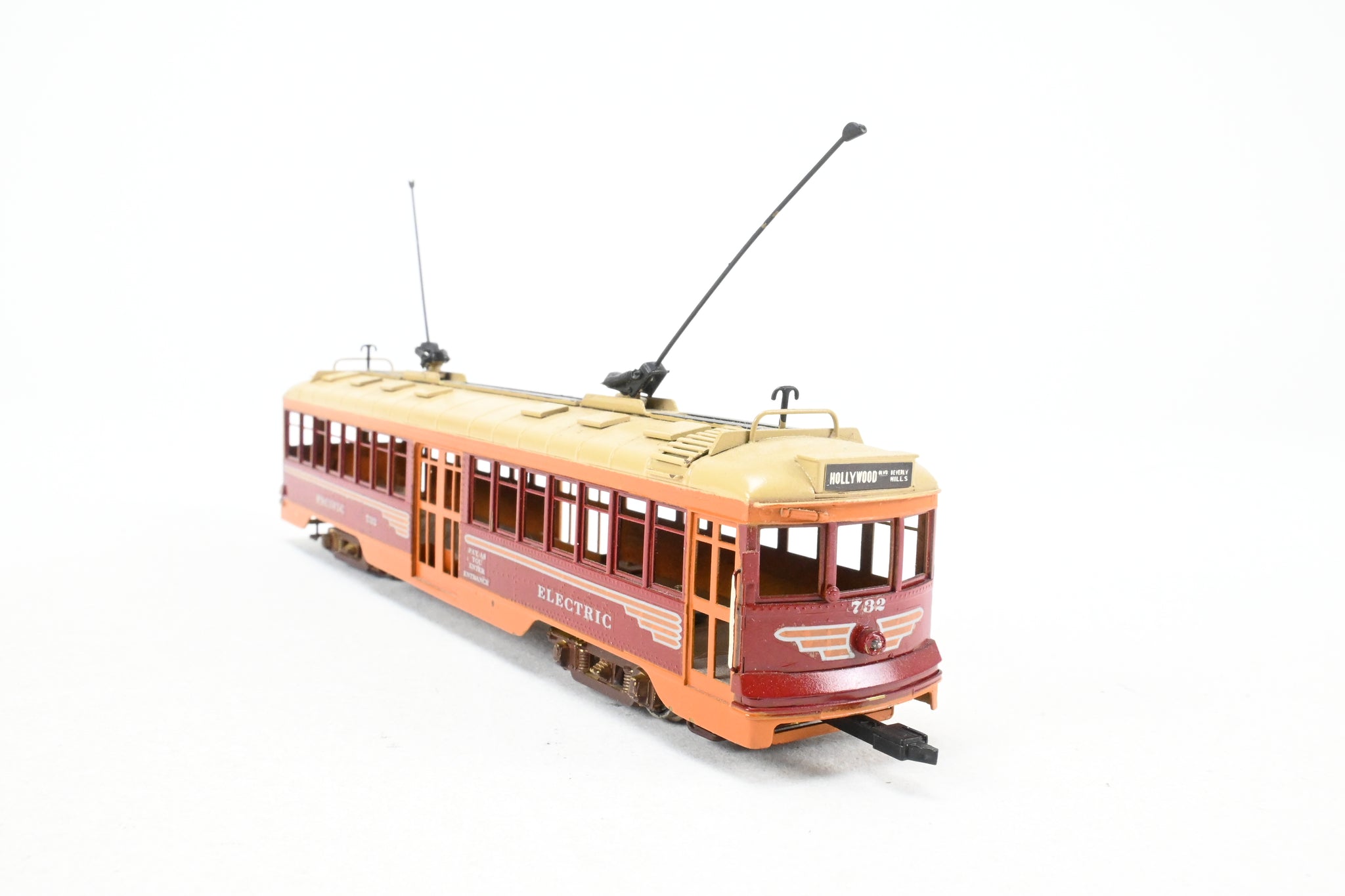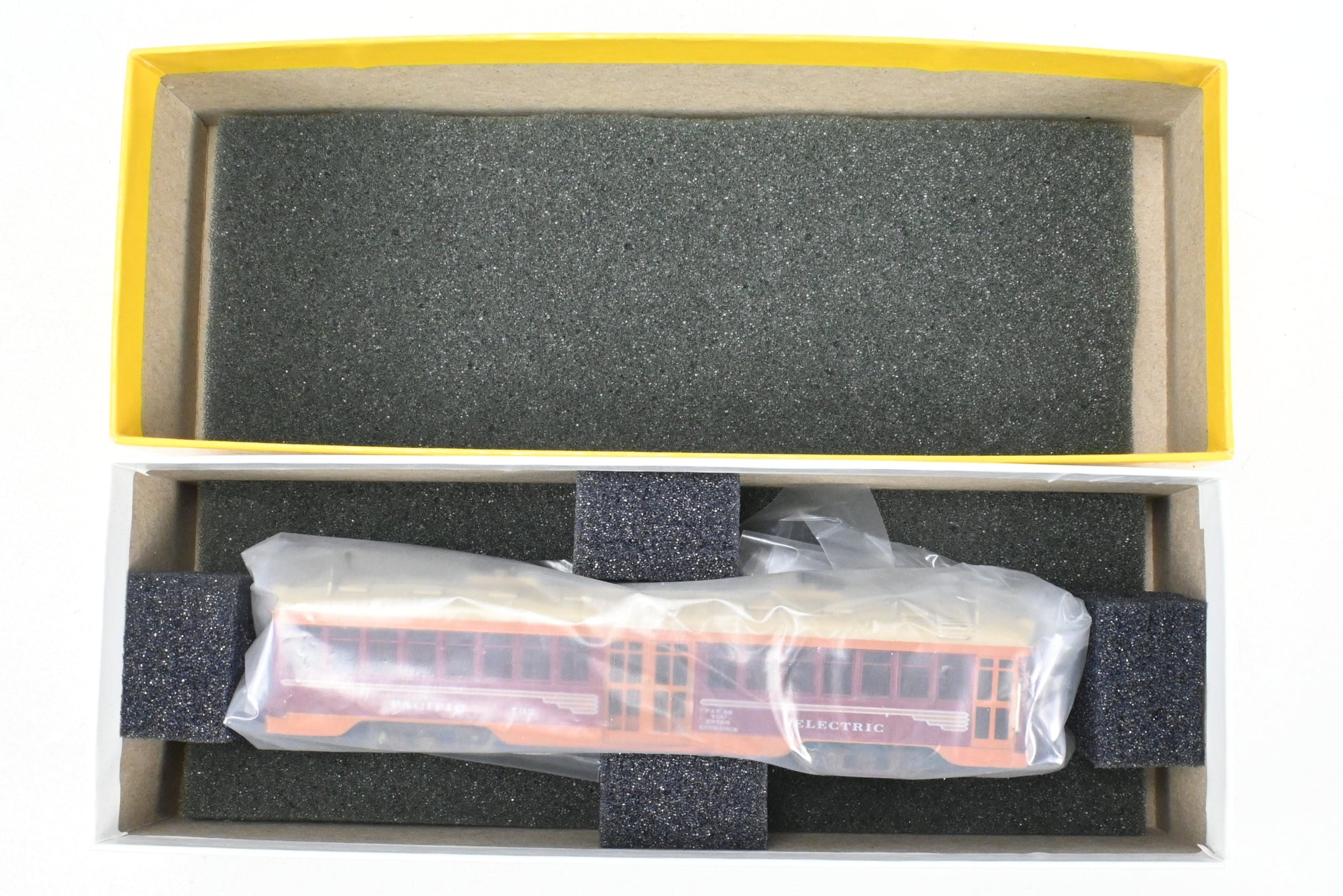 1966 run E. Suydam imported model built by GOM in Japan. REBOXX box shows virtually no shelf wear with owner cut foam. No spare parts included. Trolley poles included and installed. Custom paint work is very good but not quite professional. No window glazing installed. Note: This is an unpowered trailer.