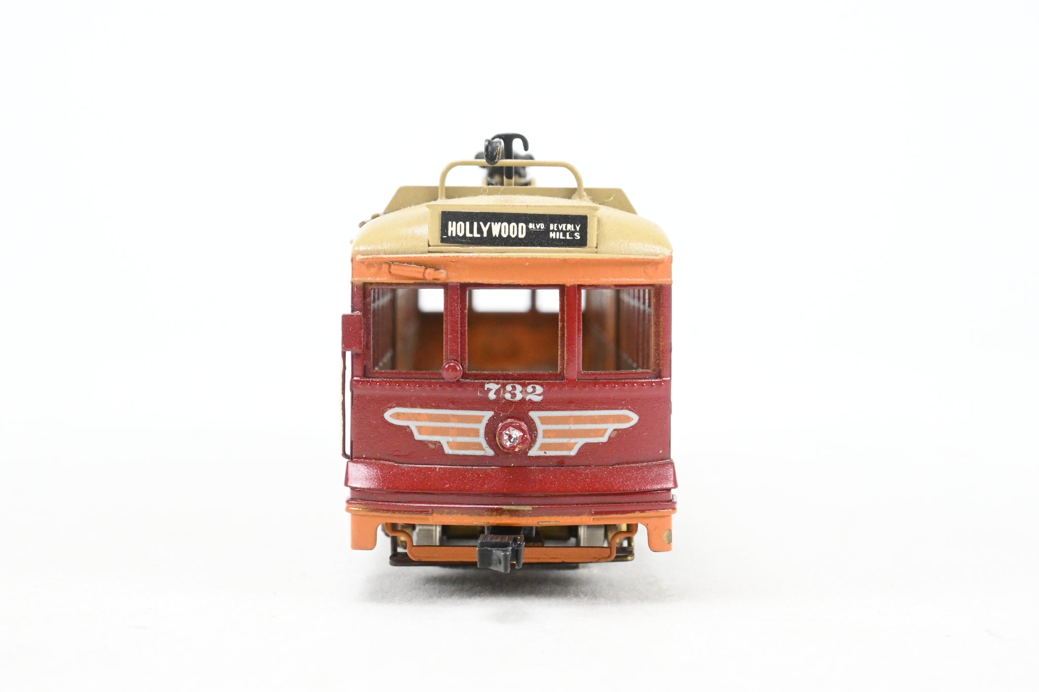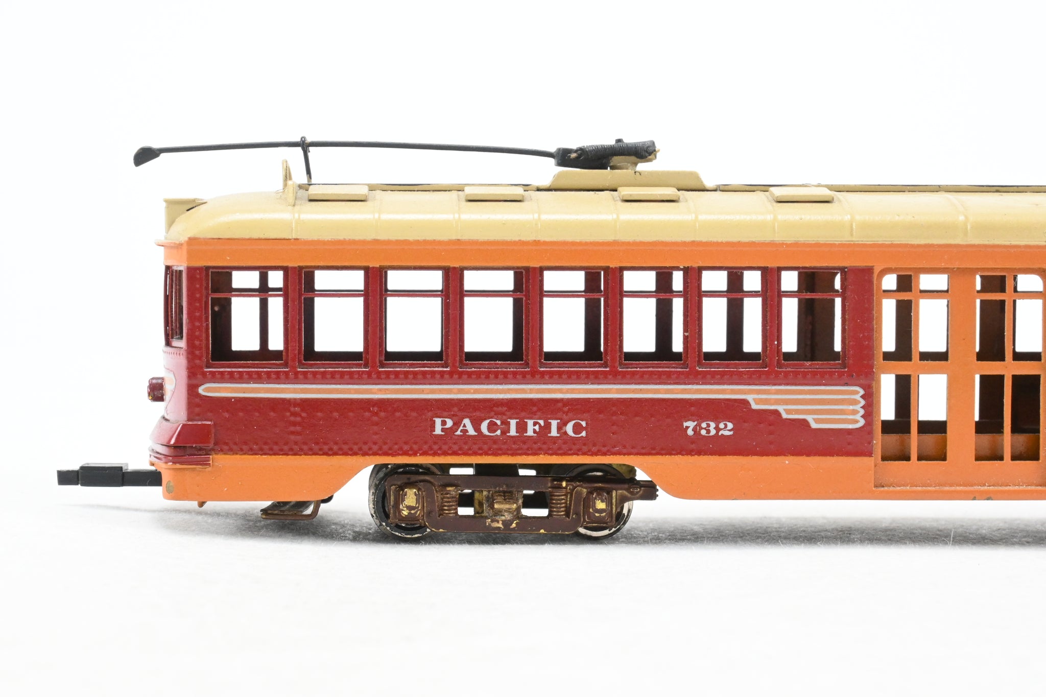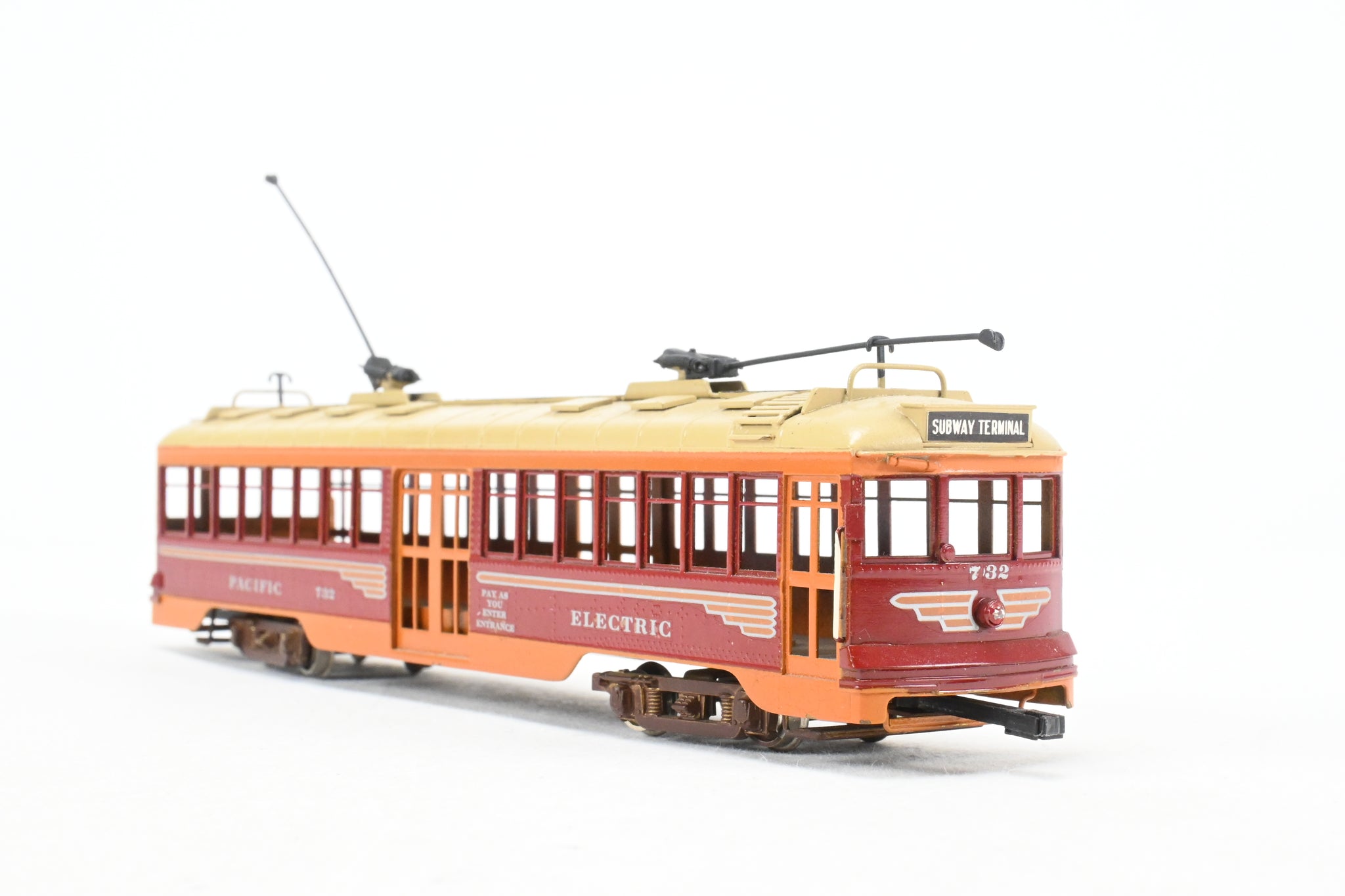 1966 run E. Suydam imported model built by GOM in Japan. REBOXX box shows virtually no shelf wear with owner cut foam. No spare parts included. Trolley poles included and installed. Custom paint work is very good but not quite professional. No window glazing installed. Note: This is an unpowered trailer.
