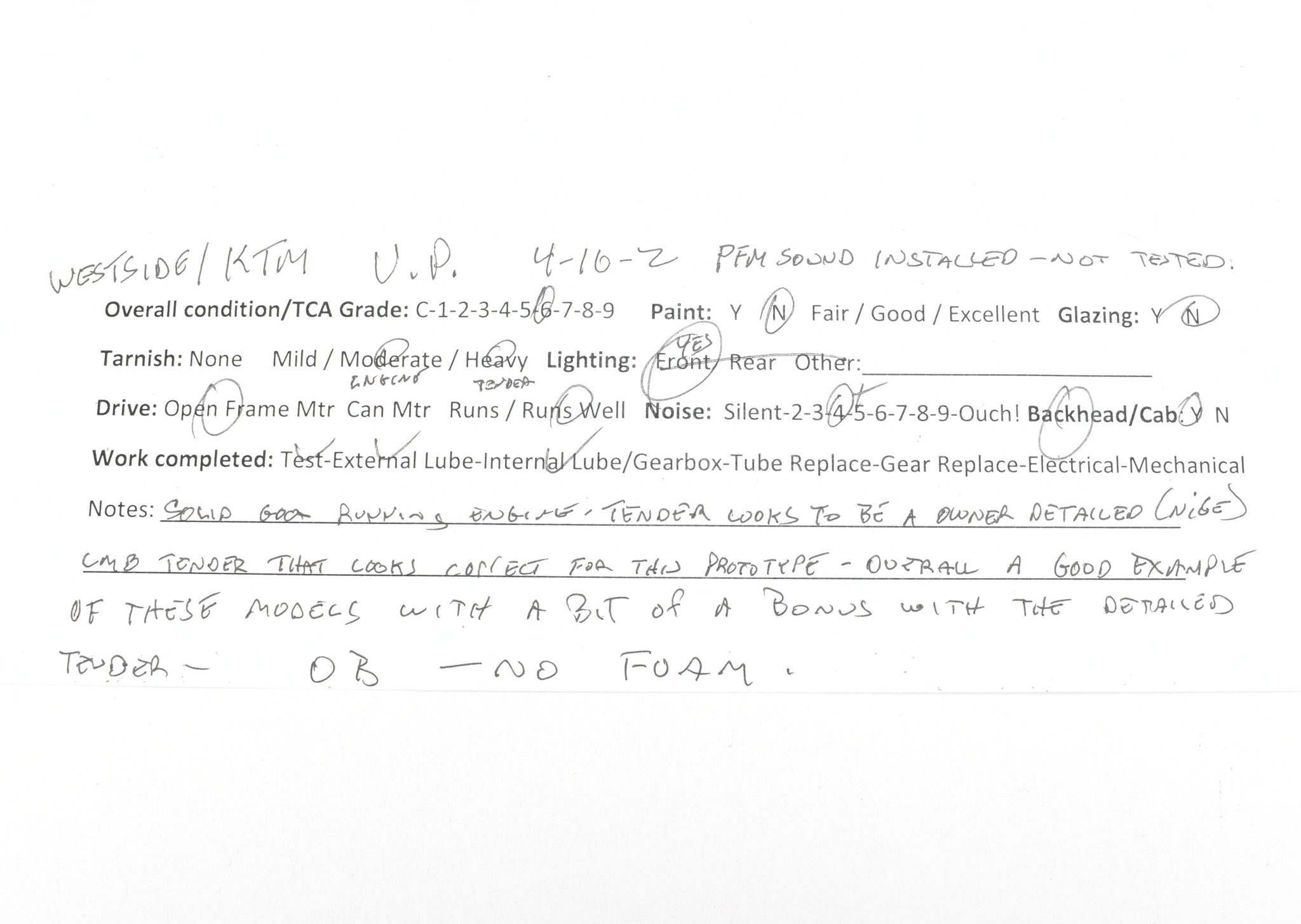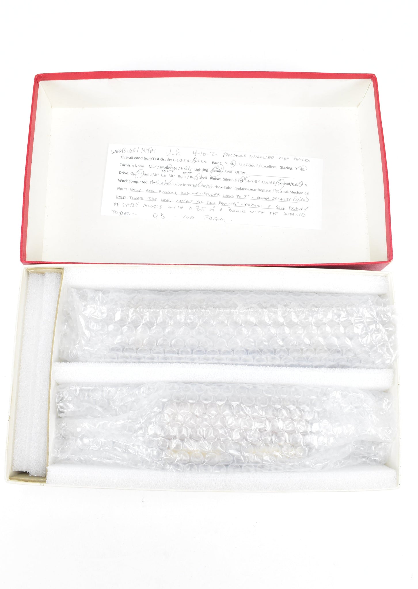 1971 run Westside Model Co. imported model built by Katsumi in Japan. Box shows minimal shelf wear. Original foam replaced with ReBoxx foam insert - $25 value! Spare parts not included. Tender is not original - Modified LMB tender which appears to be correct for this model. Tender custom detailed by previous owner. PFM Sound installed but not tested. See photos for accurate wire configuration between locomotive and tender.