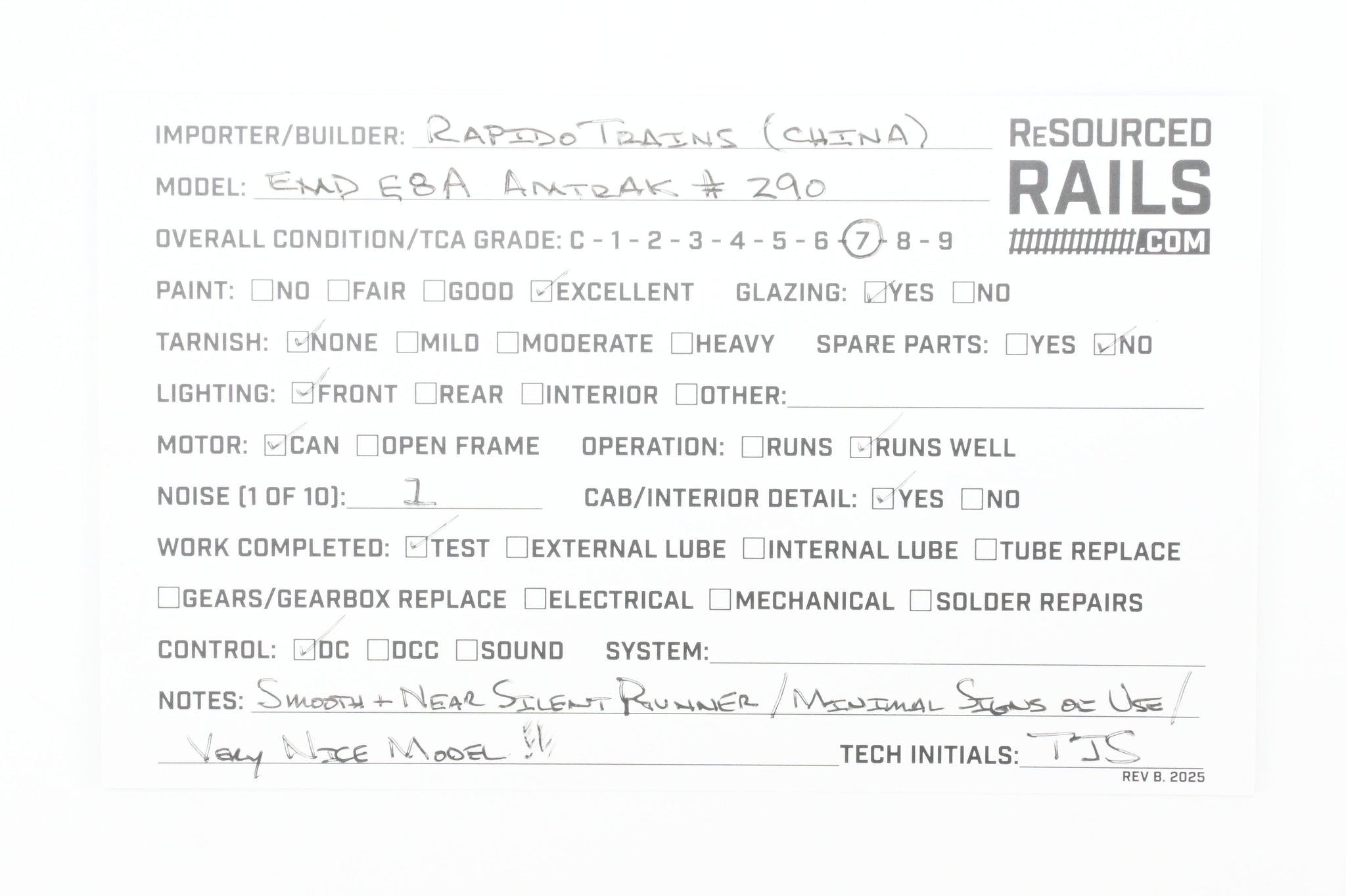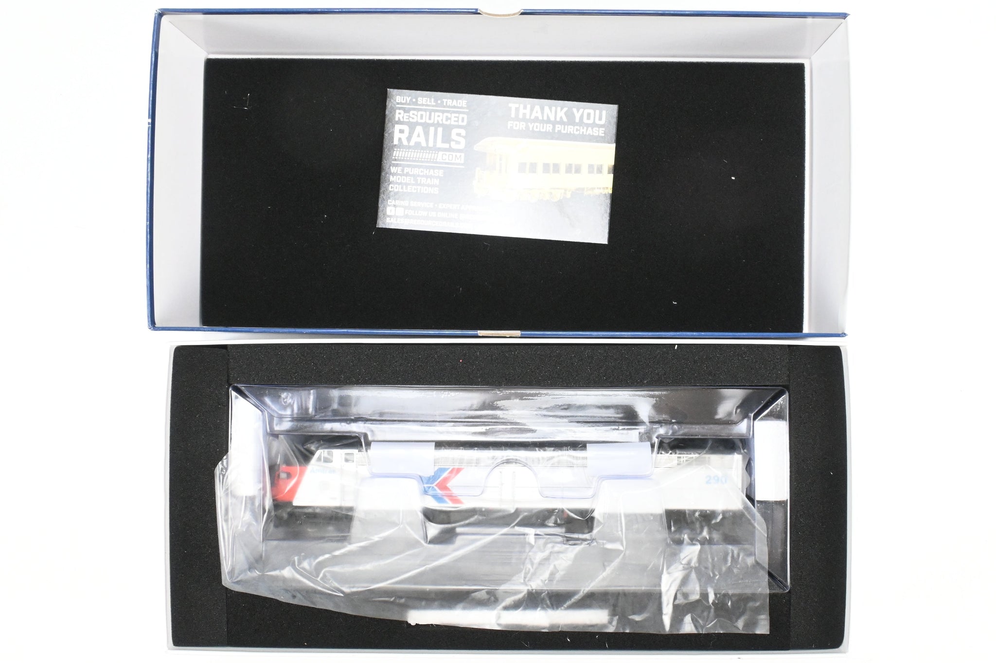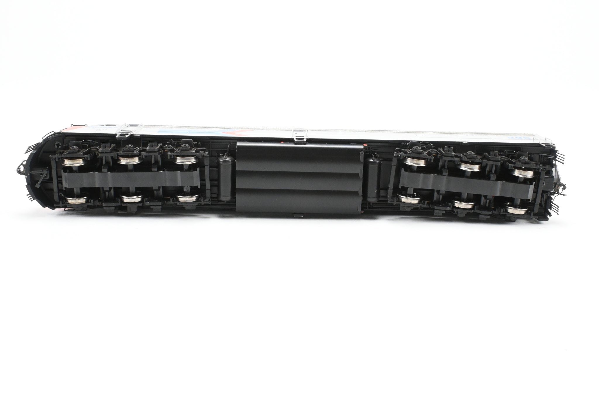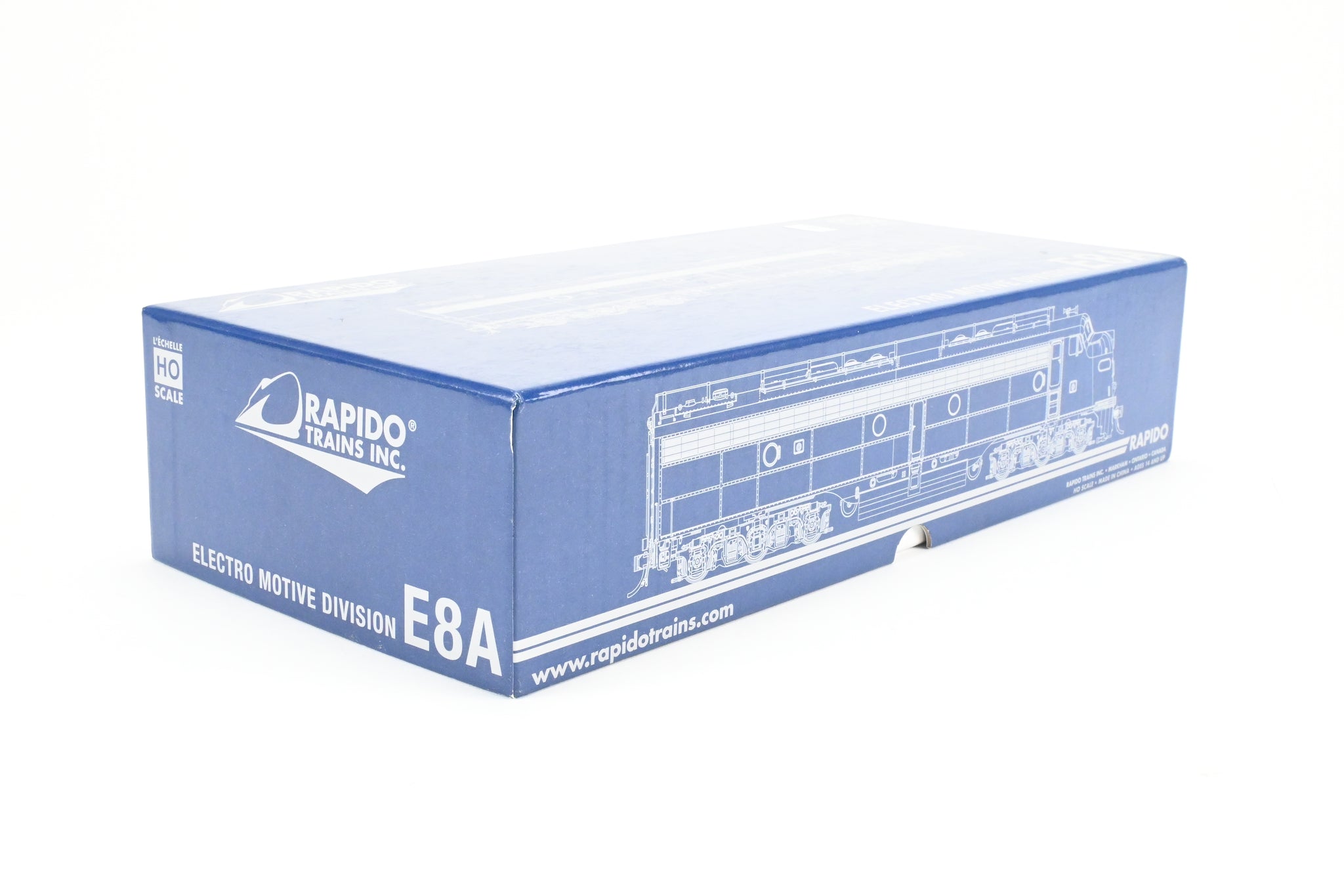 2024 run Rapido Trains, Inc. import built in China. Original box shows virtually no shelf wear. Spare parts, detail parts, and operators manual included. A smooth and nearly silent running engine. This model represents a typical E8 used by Amtrak painted in the Phase I scheme. A nice model! Note: This is the DC NO SOUND version but is DCC ready with a 21PNEM socket.