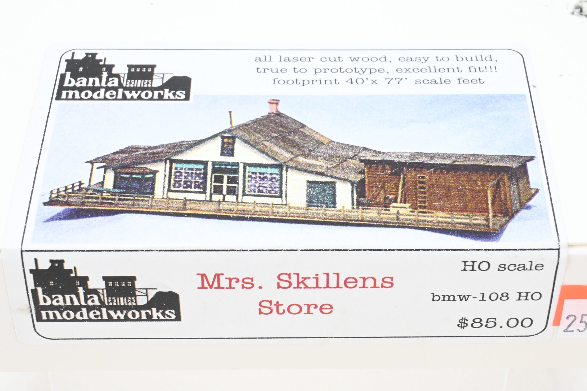 Narrow gauge Banta Model Works kit of Mrs. Skillens Store found in Ophir, CO. Box has light wear. This is a multi media kit comprising of cut wood strips, cast metal parts, and detailed instructions. Limited and long out of production kit. Note: This is a craftsman laser cut style kit and will require a fair amount of time, skill, and patience to complete.