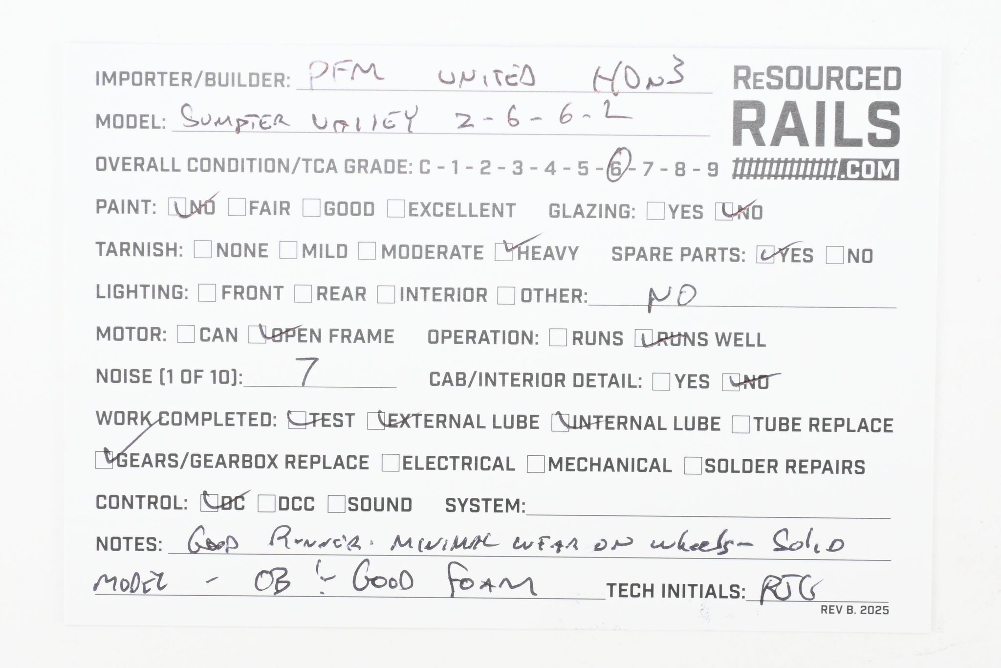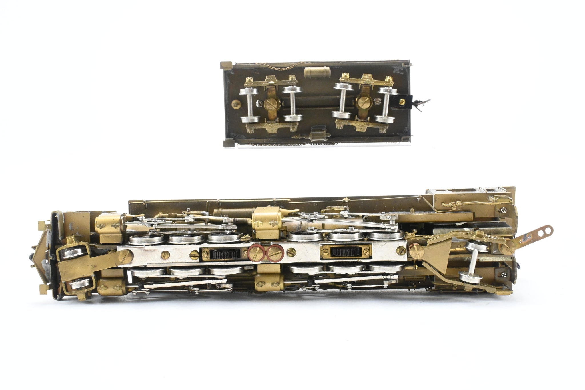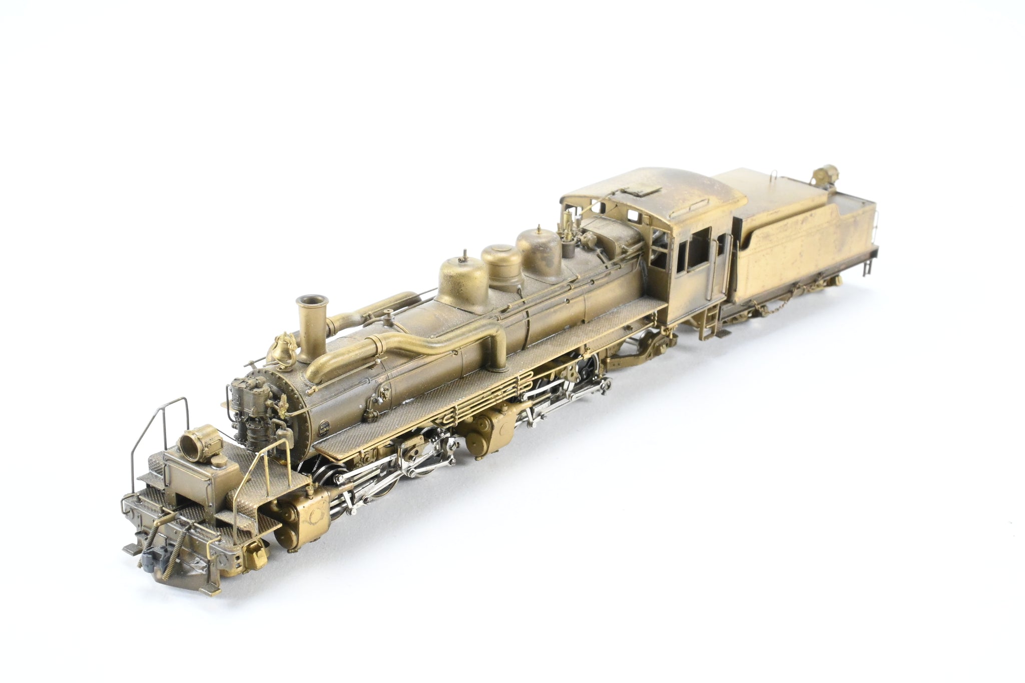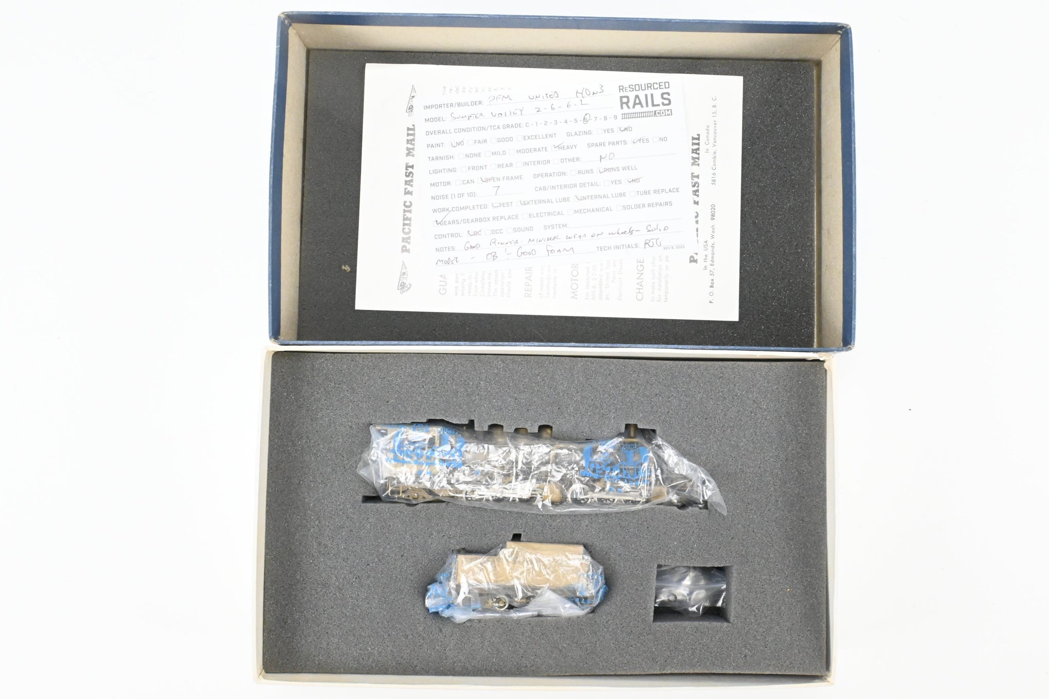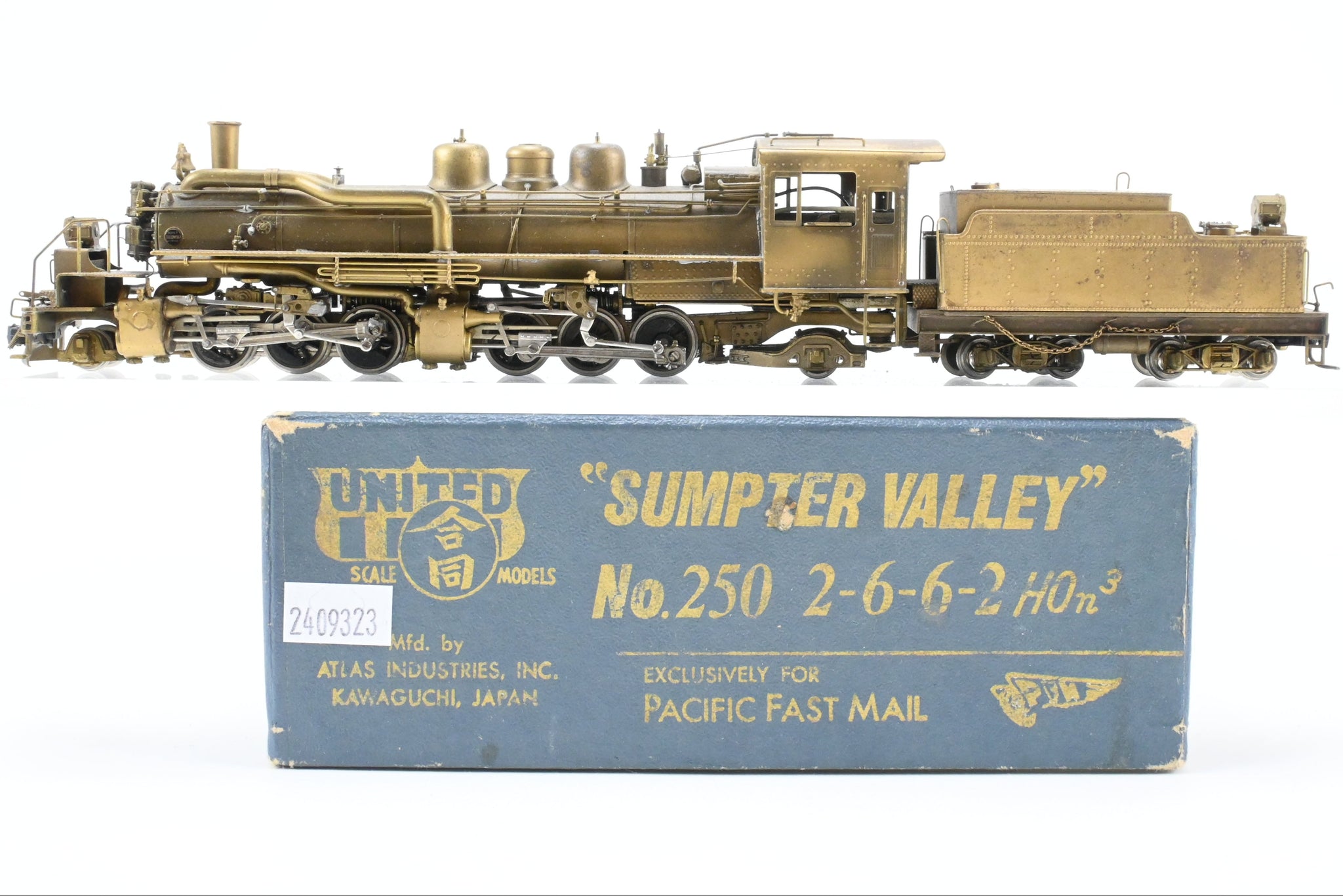 1968 run Pacific Fast Mail imported model built by Atlas Industries in Japan. Box shows minor shelf wear with some scuffing along the edges and in the corners. Spare parts included. This model represents the former Uintah Railway 2-6-6-2T's which were sold to sumpter Valley Railroad in 1939. Converted from a tank mallet to a conventional mallet with tender. Cracked idler gear has been replaced with a new NWSL part. A smooth, if somewhat noisy runner (typical of these models), it demonstrates little evidence of use.