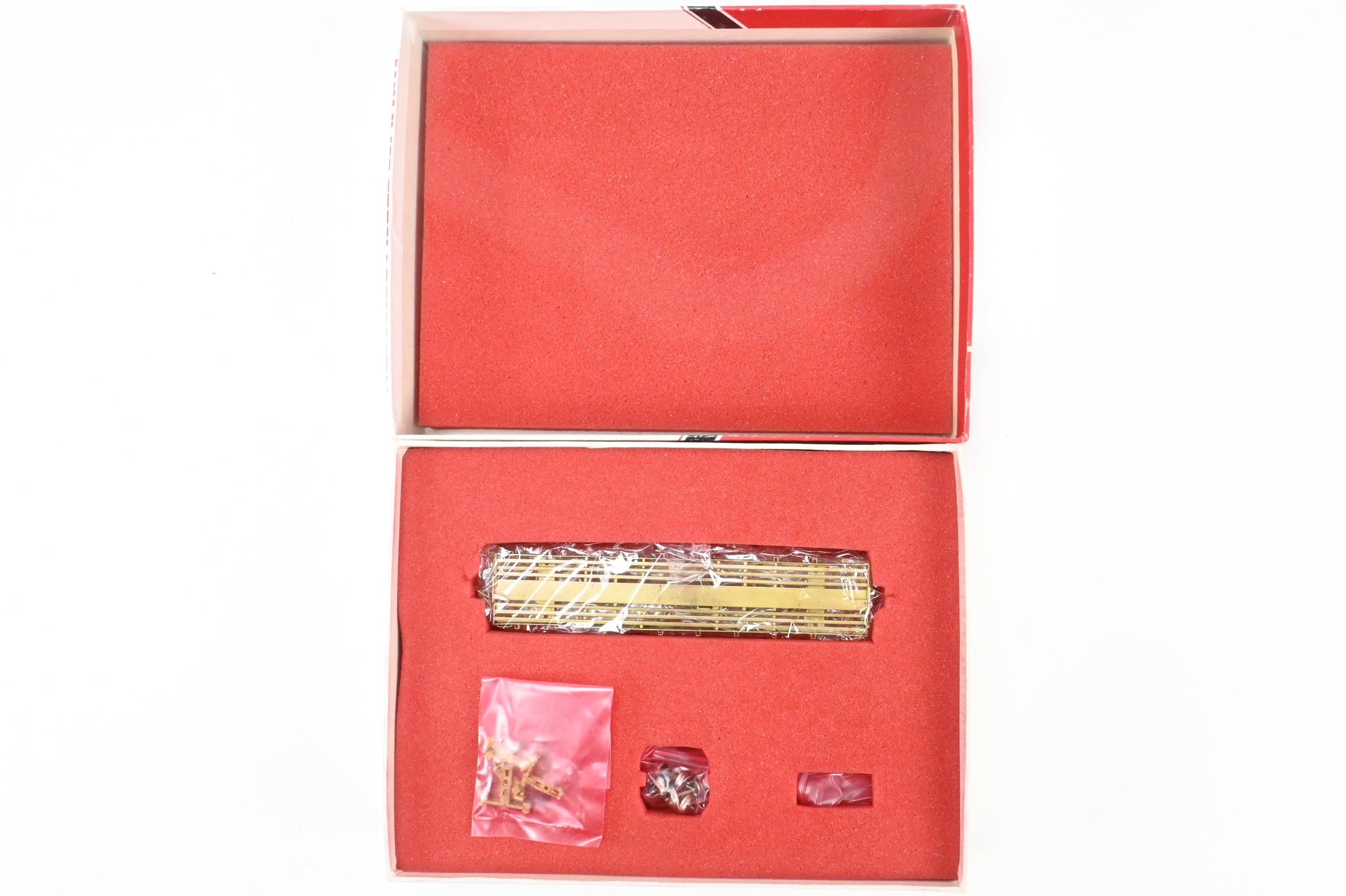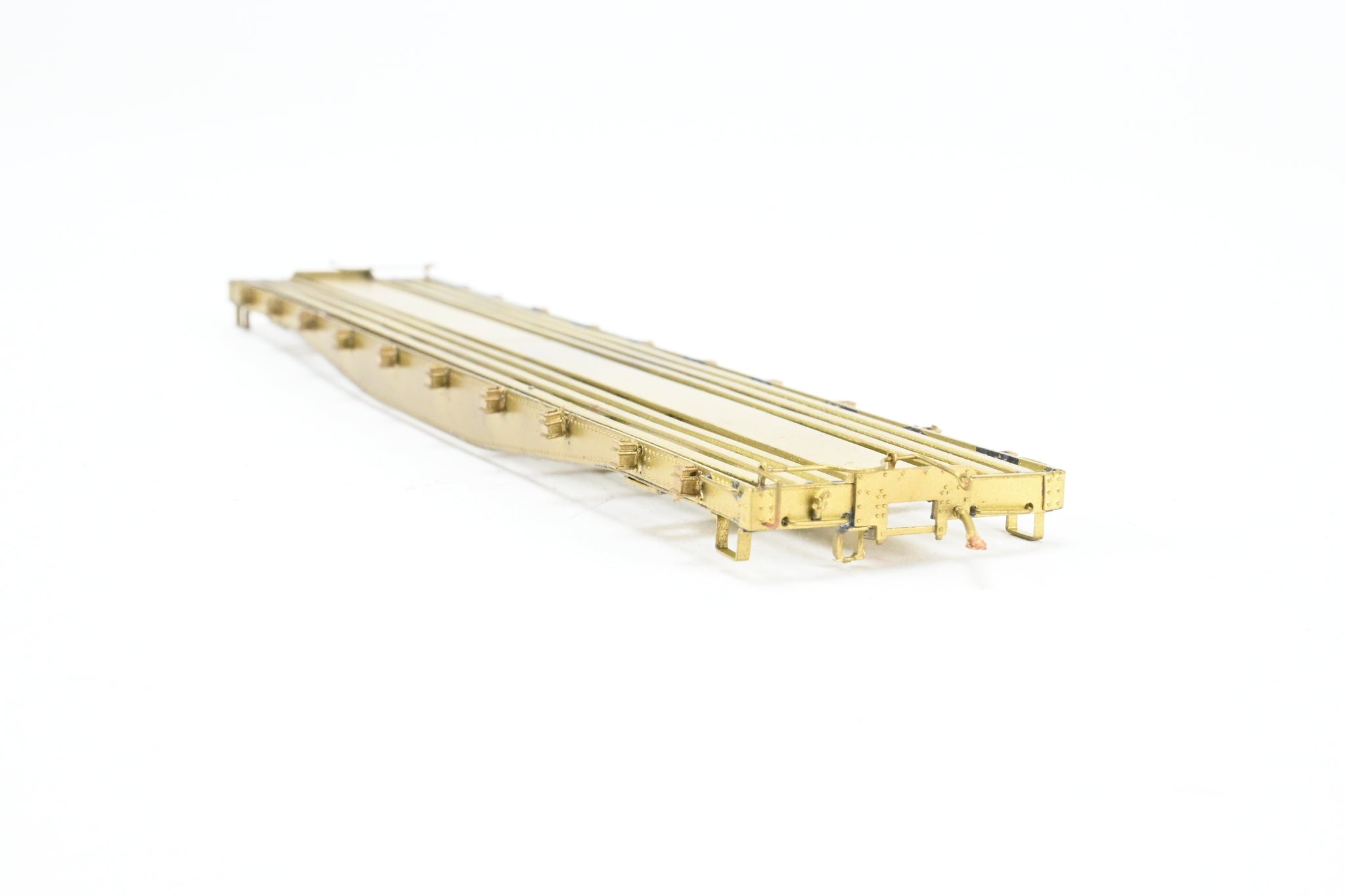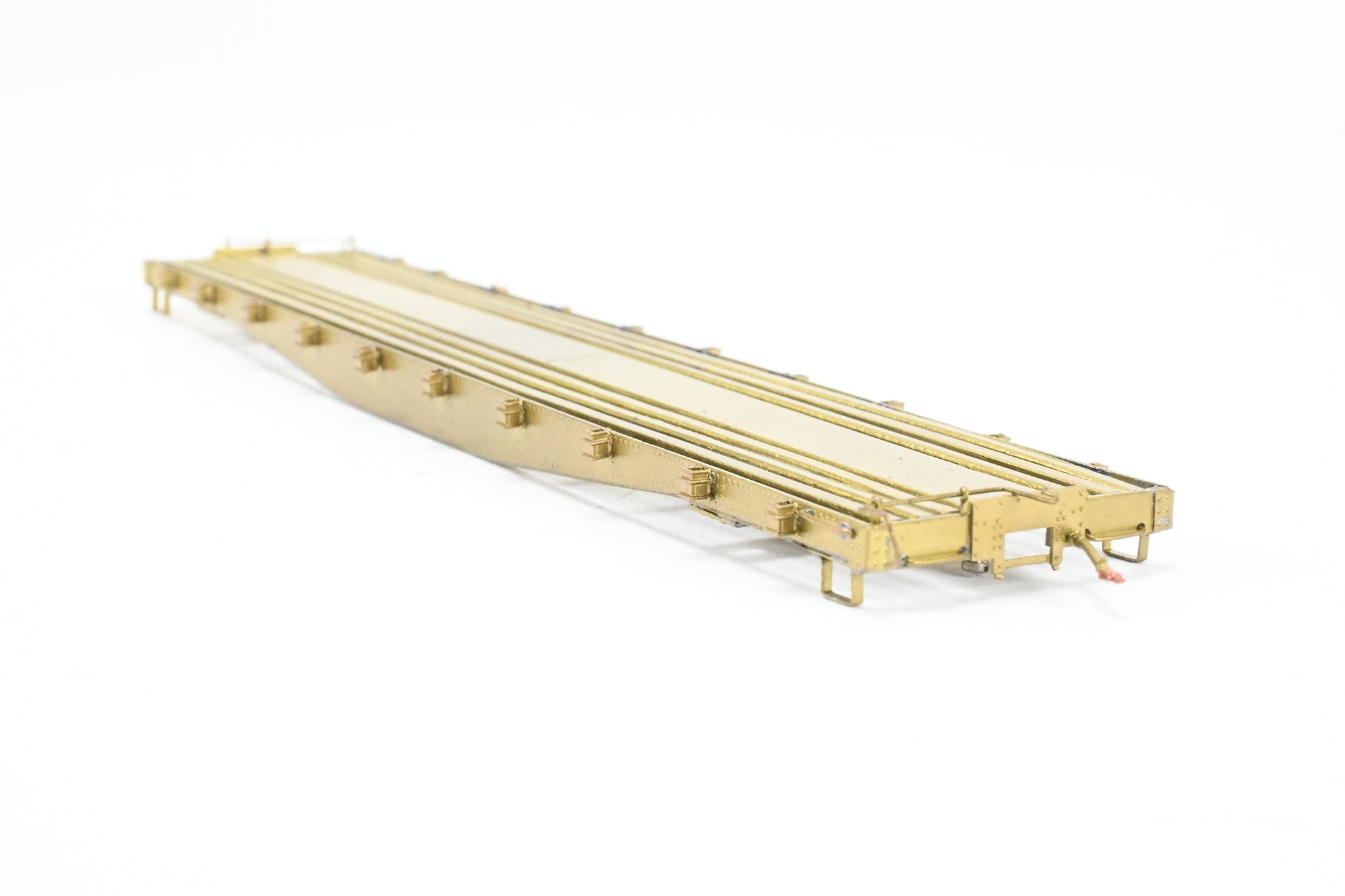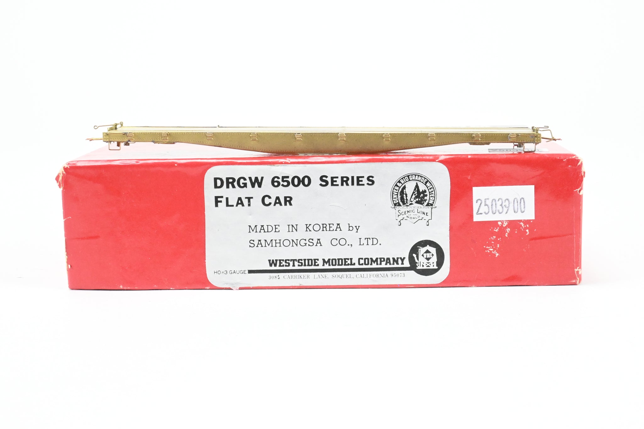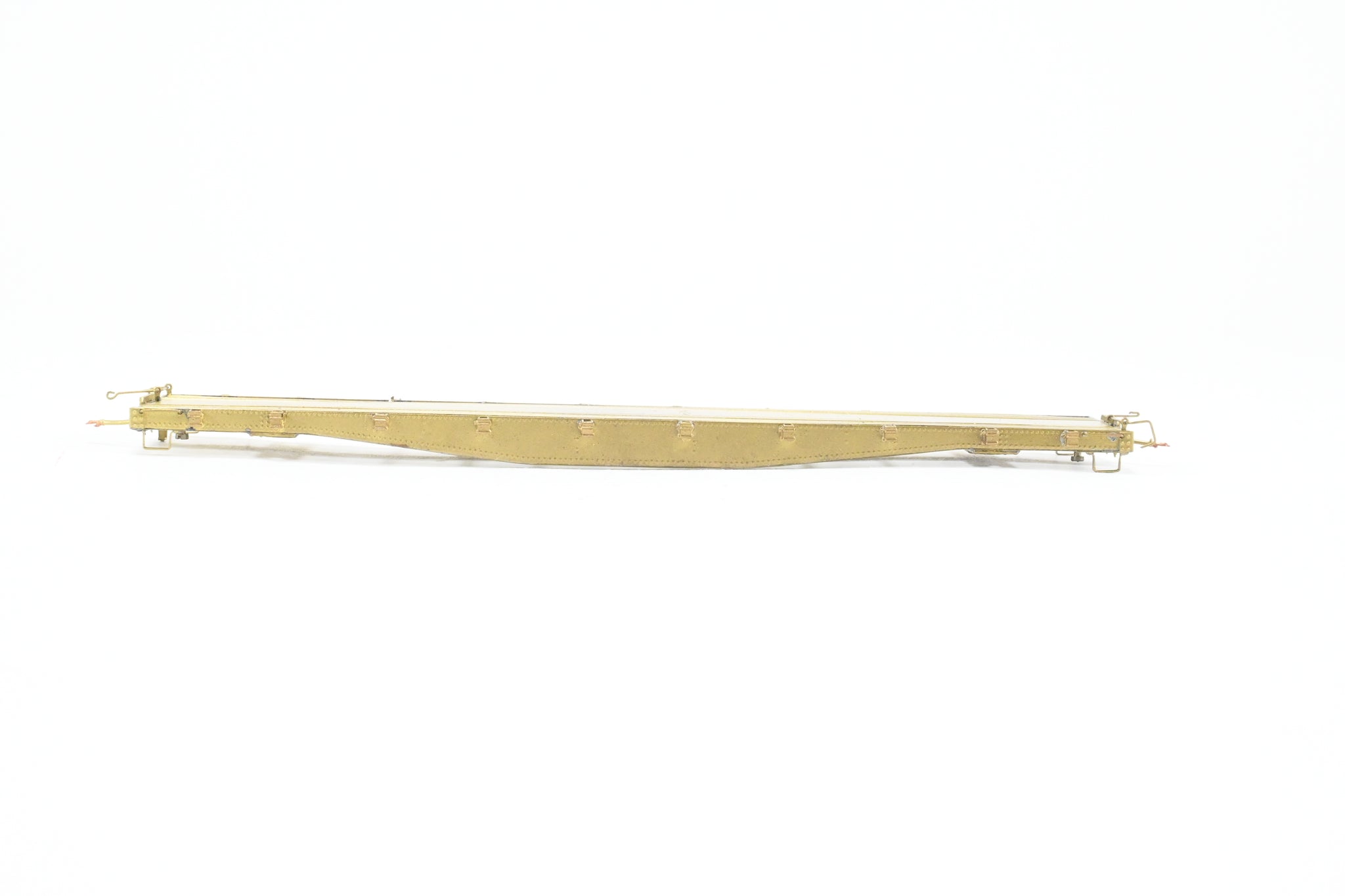 1978 run Westside Model Co. imported model built by Samhongsa in Korea. Box shows some shelf wear with some scuffing on the edges and the corners. Extra detail parts included - see photos. Trucks and deck included but unassembled. Starting in 1939, 45 of these 41' 6" fish belly underframe flat cars were rebuilt from 28000 series standard gauge flat cars. They were car numbers 6500 - 6544. Rated for 40 tons, they were often adapted for various uses. A like new model that shows very minor tarnish and obviously no use. WMC G-File No. 108 (not included).