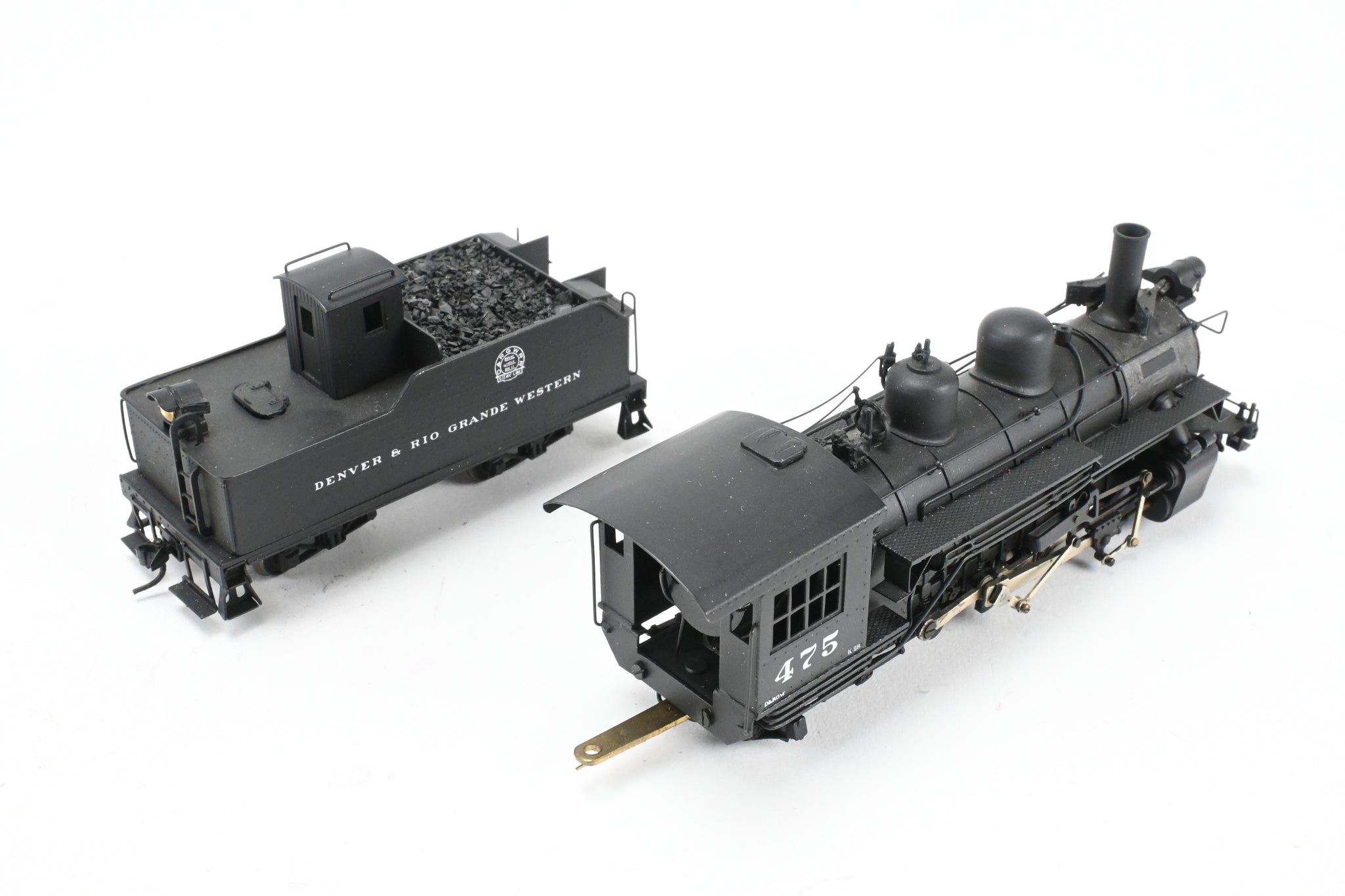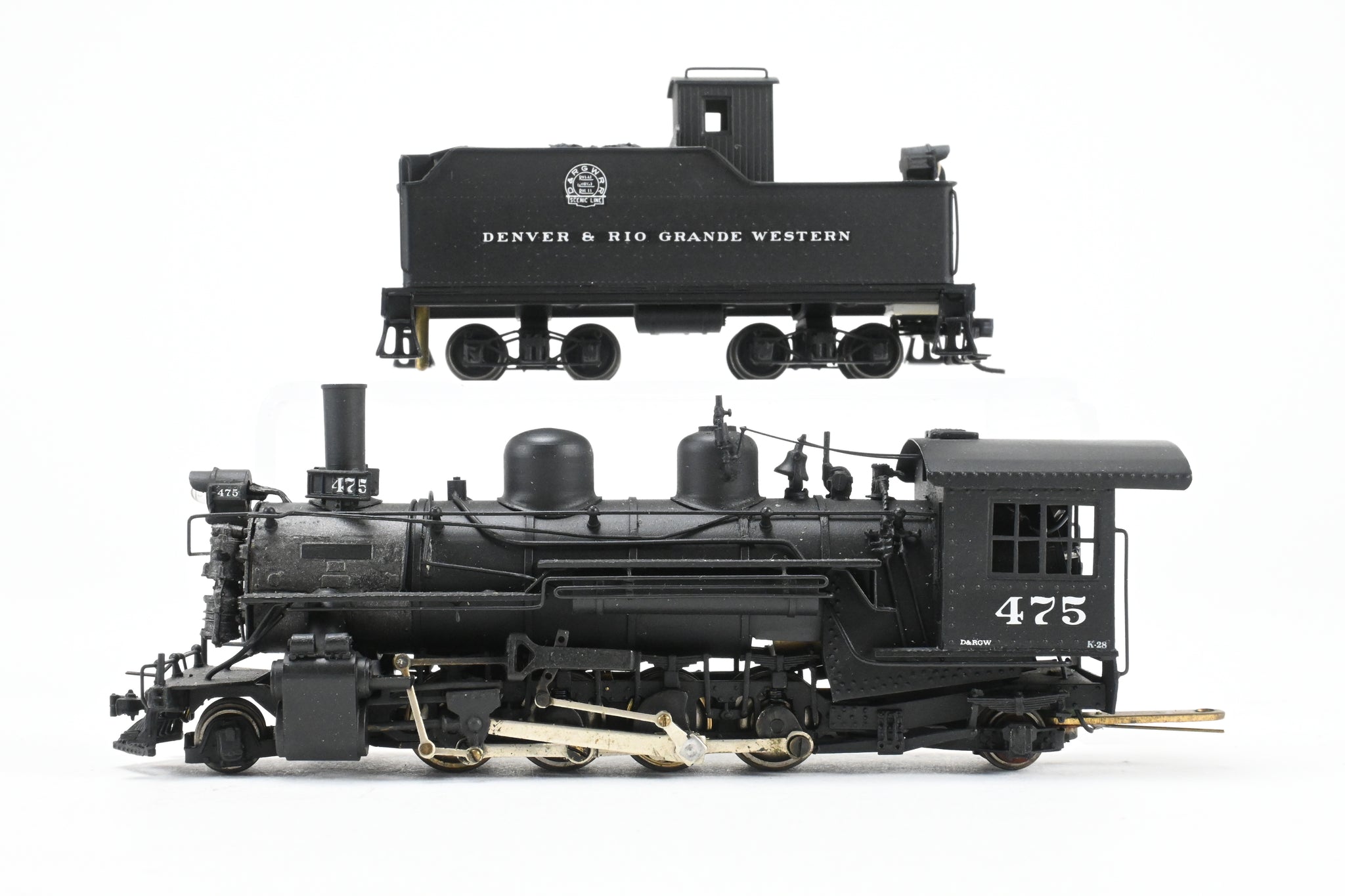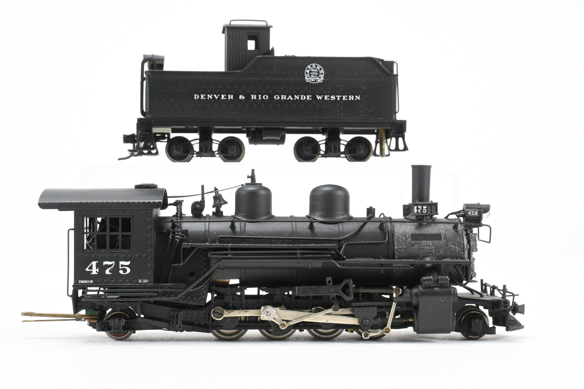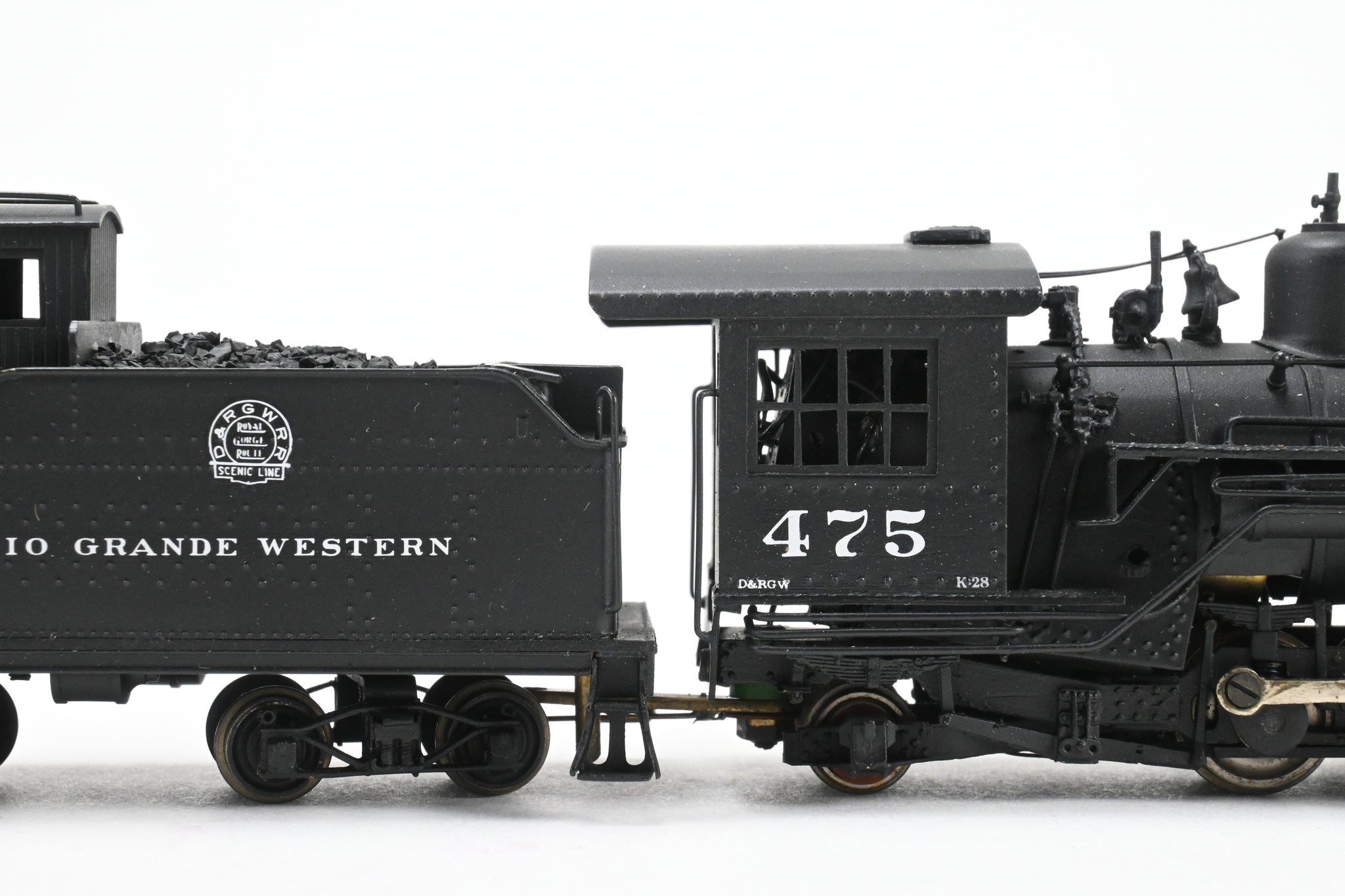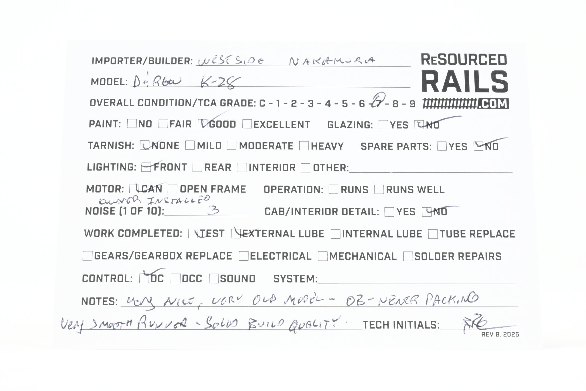 1964 early run Westside Model Co. imported model built by Tetsudo in Japan. Original box shows very little shelf wear, especially considering its age The foam, however, has been replaced with bubblewrap. No spare parts included. A "doghouse" tender with a coal load installed. A smooth and quiet runner, with signs of moderate usage. A nice example of an older, early run D&RGW K-28. WMC G-File No. 2 (not included)