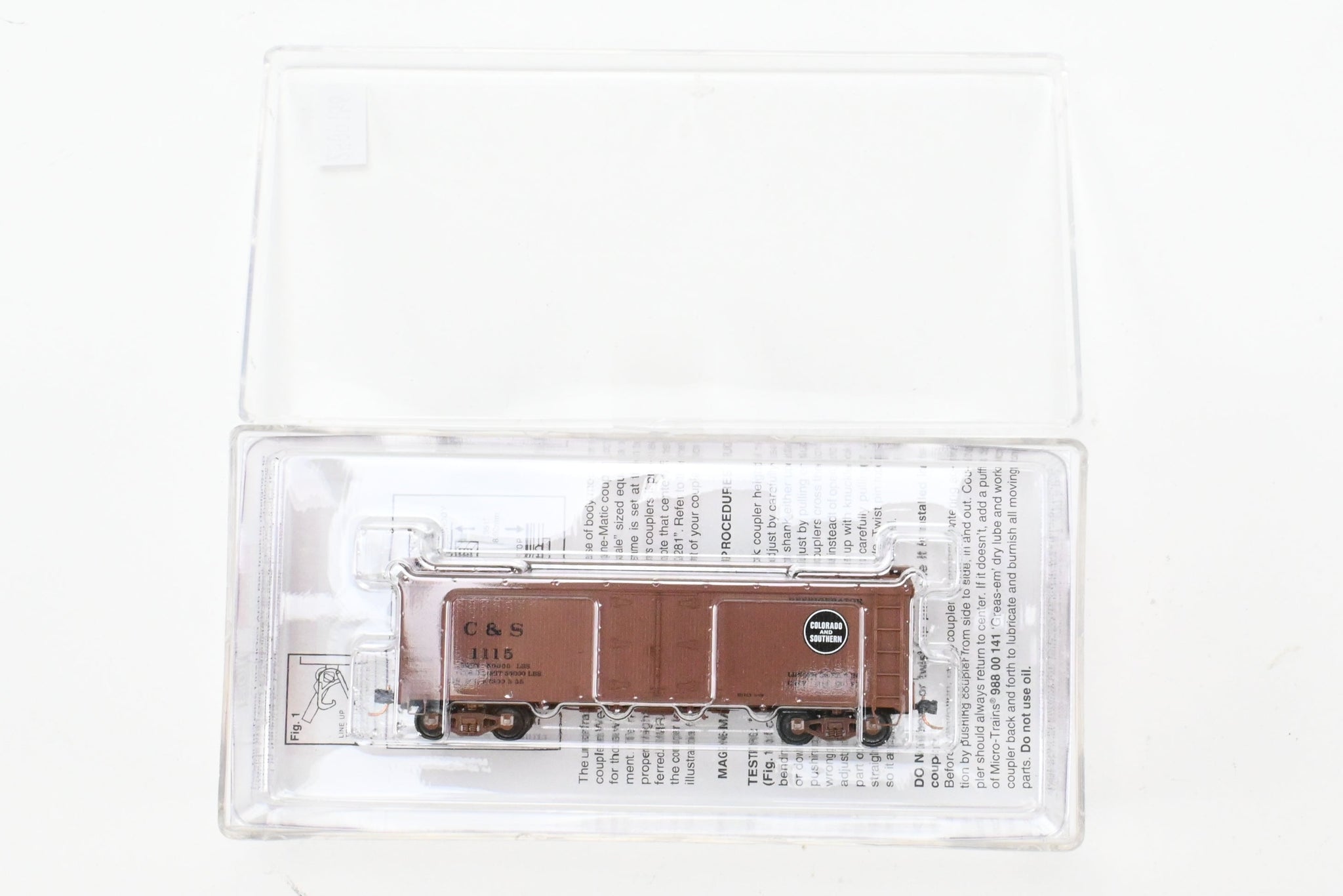 MicoMicro Trains line from Kadee. Plastic box shows no shelf wear. No spare parts included. Represents a 30' composite underframe Refrigerator Car. Factory painted and lettered for Colorado and Southern, numbered 1115. A nice model of a composite reefer car.