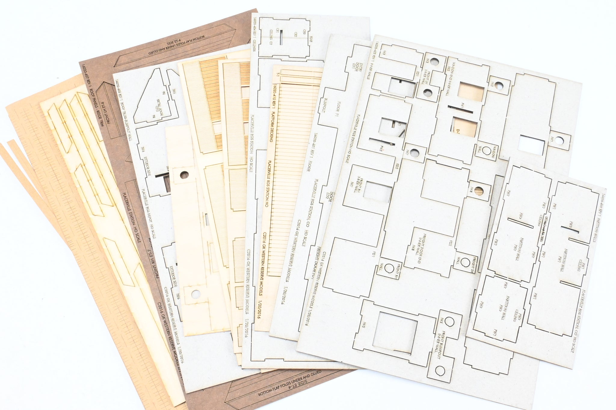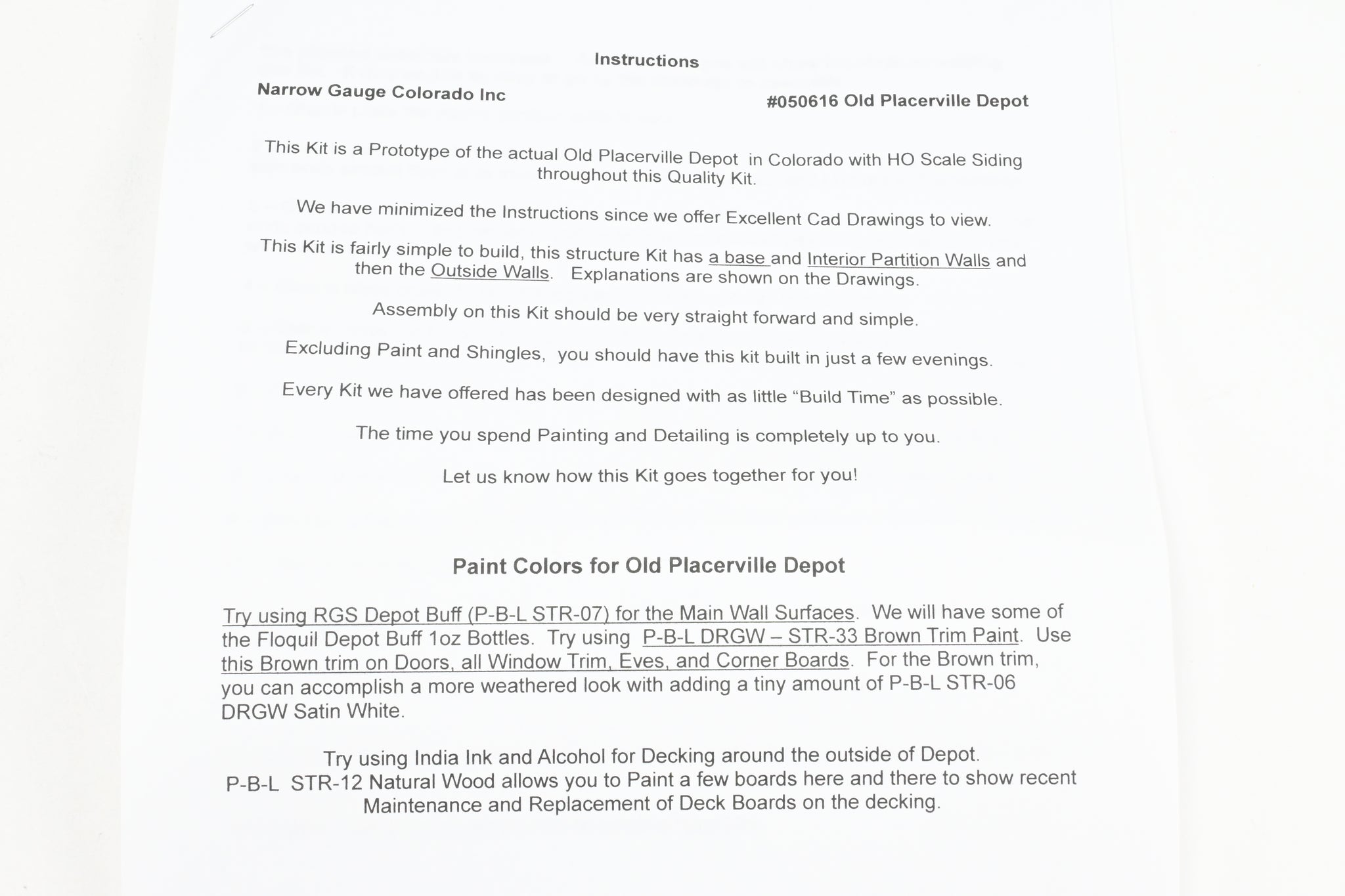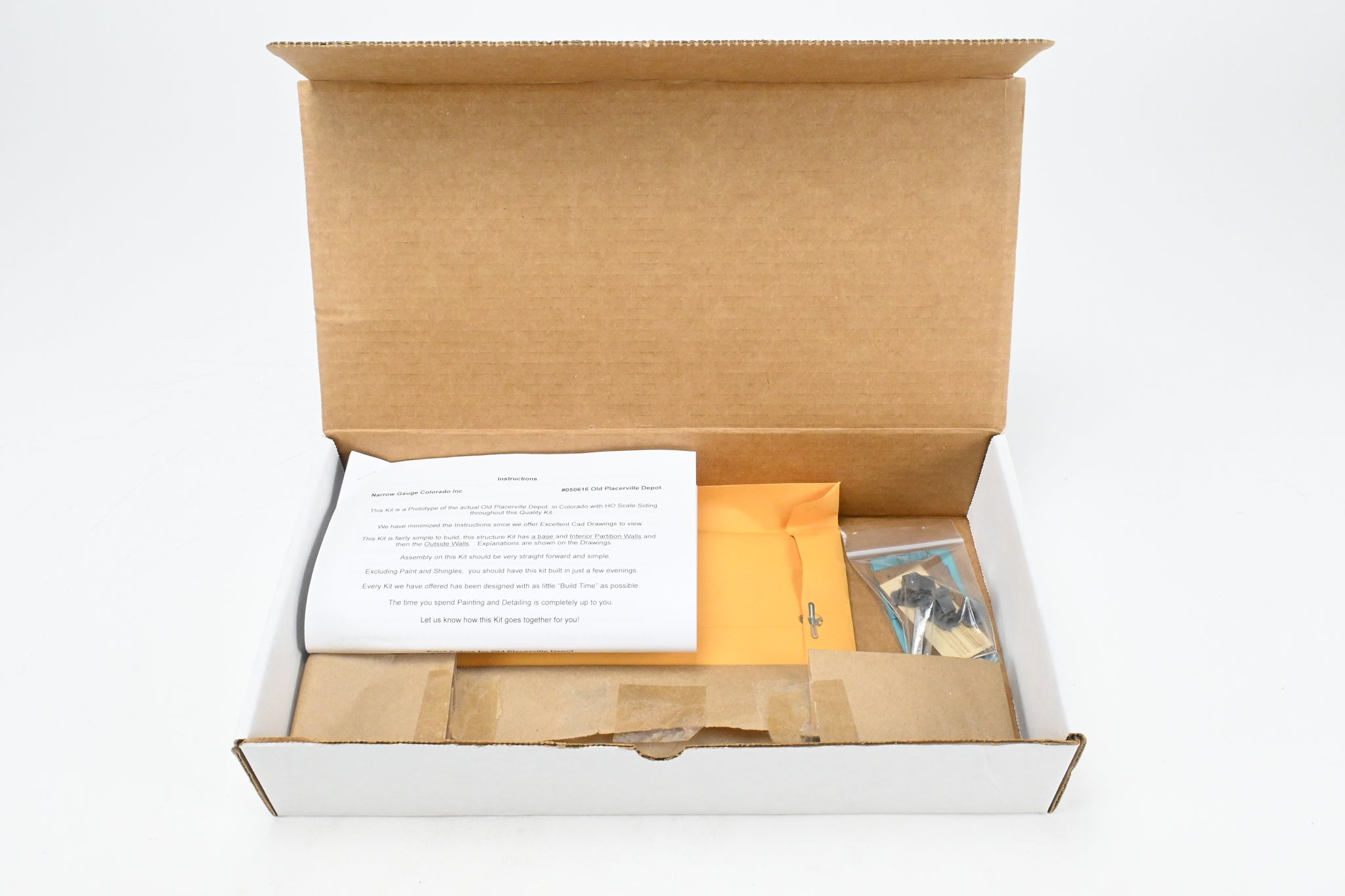 Narrow gauge Colorado kit of the Rio Grande Southern Placerville, Colorado Station Depot. Box has light wear. This is a multi media kit comprising of cut wood strips, cast metal parts, and detailed instructions. Limited and long out of production kit. Note: This is a craftsman style kit and will require a fair amount of time, skill, and patience to complete.