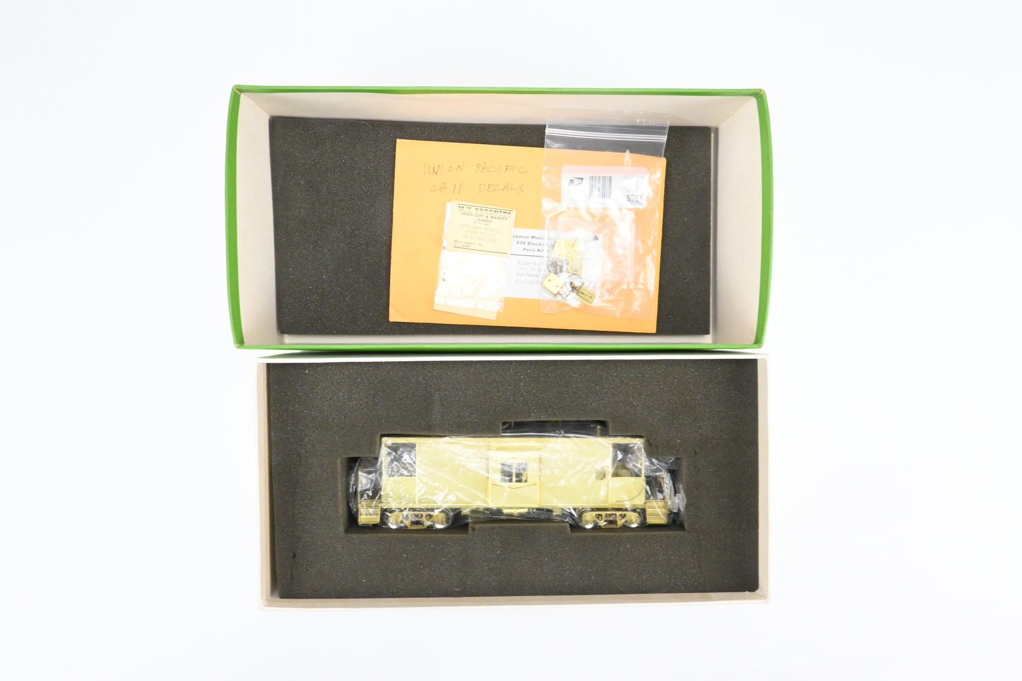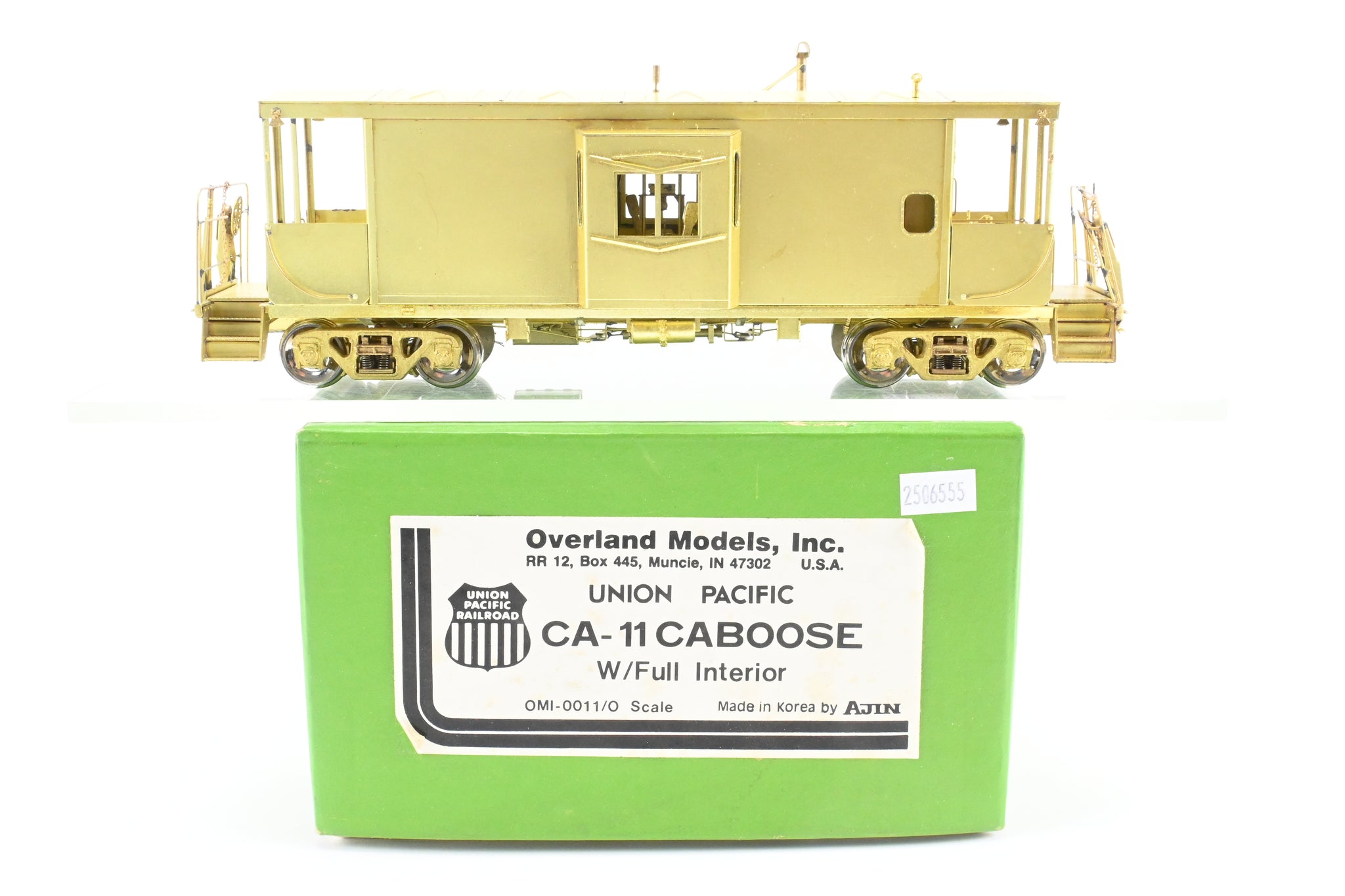1981 run Overland Models, Inc. imported model built by Ajin Precision Mfg. in Korea. Box shows minimal shelf wear. Spare parts and MV lenses included. Model has full detailed interior. This model represents a UP CA-11 caboose. NOTE: O Scale CA-11 Decals are provided.