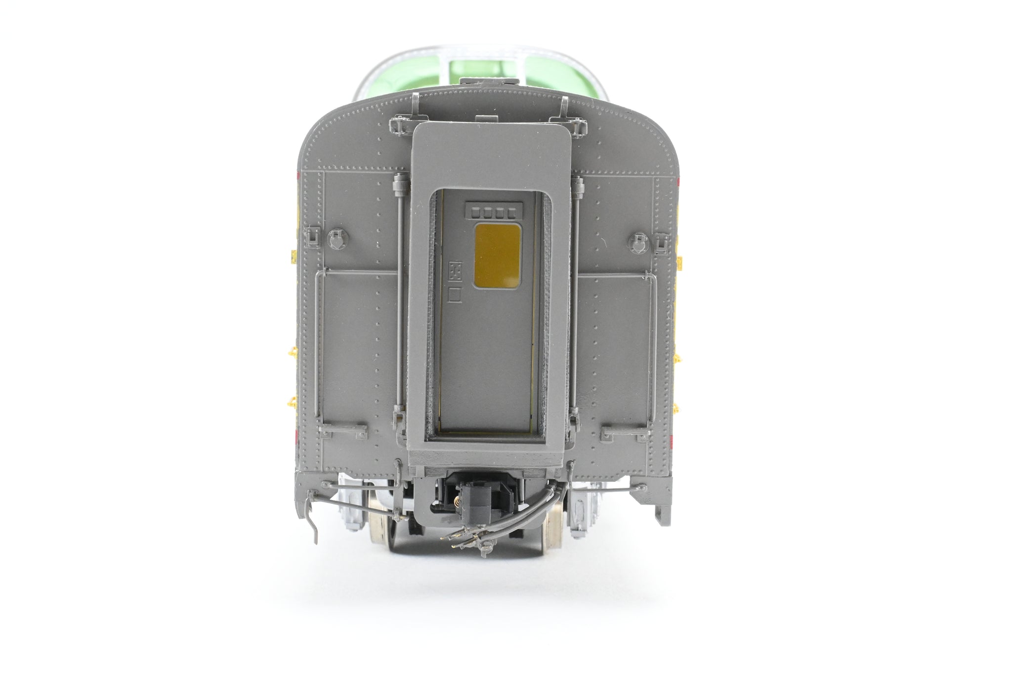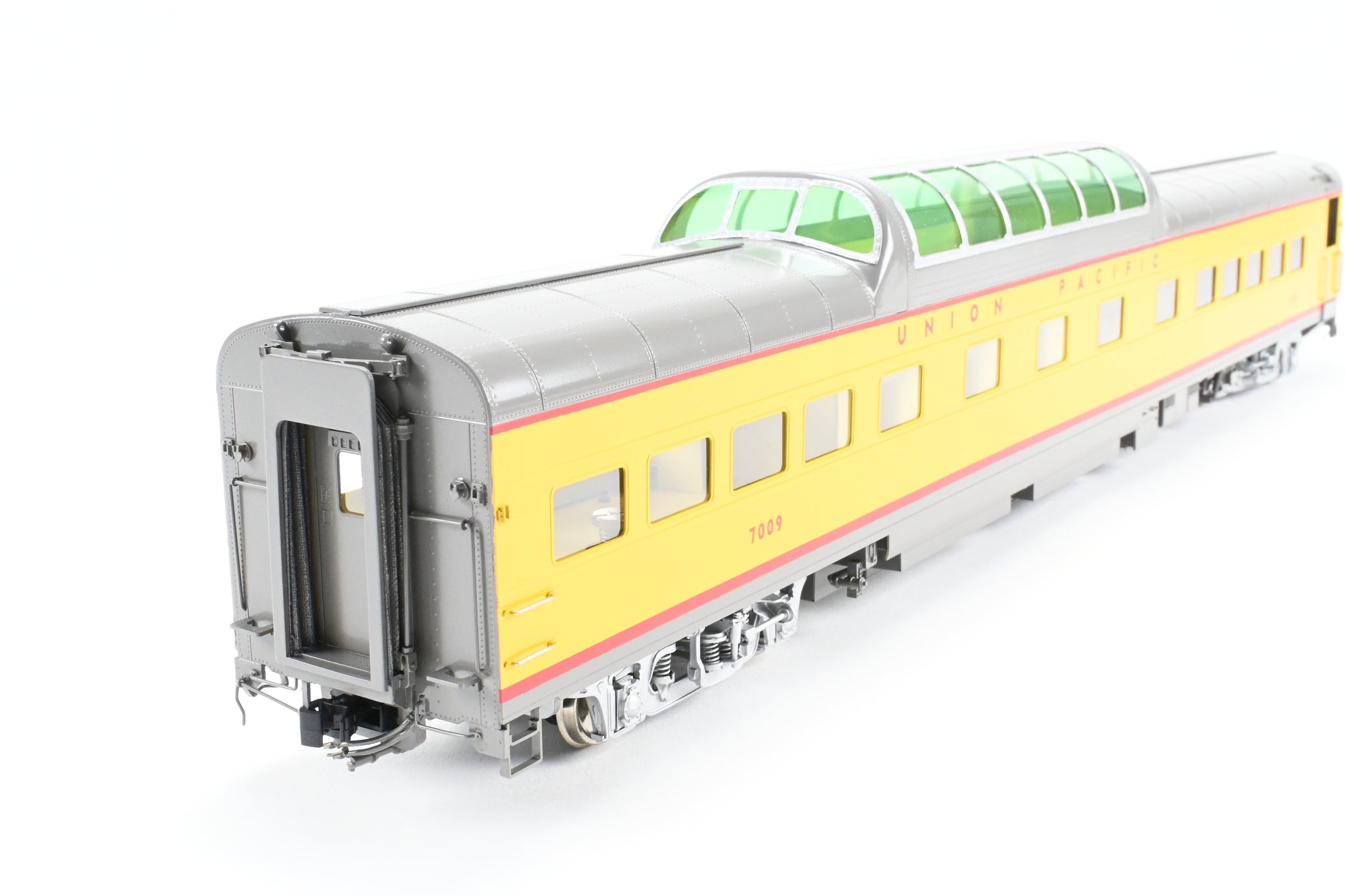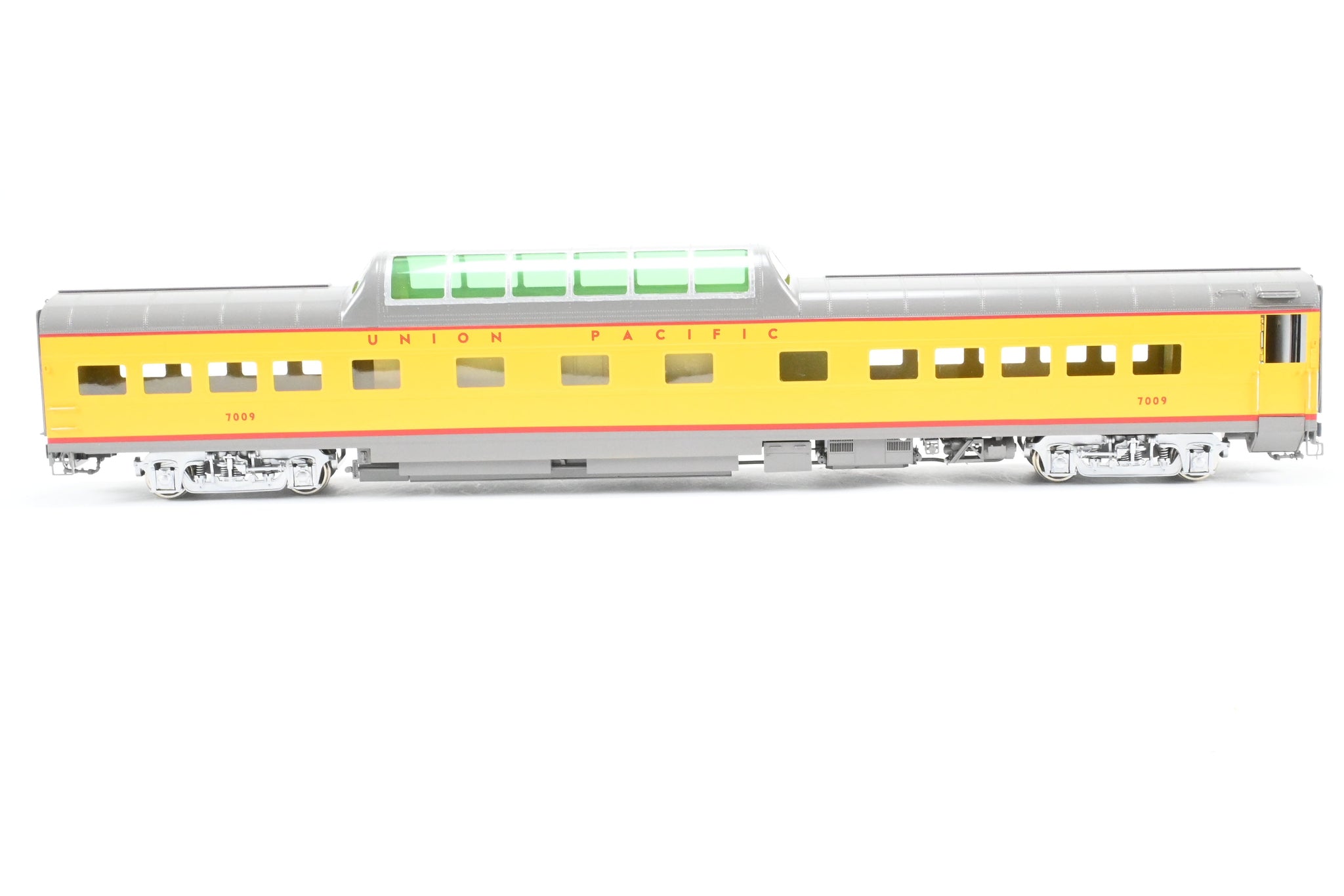 1993 run Wasatch Model Company imported model made by ACESPM in Korea. Box shows minimal shelf wear. No spare parts included. Glazing installed, including tinted glass in the dome.. All doors open: upper, lower, trap, and end doors. This car represents car Nos. 7000 - 7009. Finished as No. 7009. These dome coaches came to the U.P. in 1955 from AC&F and could seat 24 in the dome area as well as an additional 36 in the lower level. 7009 was initially assigned to the City of Portland. Later, it was used on the various Union Pacific intercontinental streamliners. It was sold to Auto Train 706 in June of 1972. A beautiful car that shows very little signs of use. A harder to find model, as only 72 of this version were imported and fewer were professionally painted.