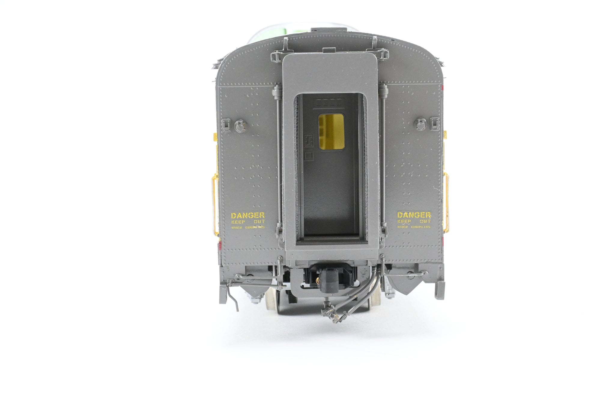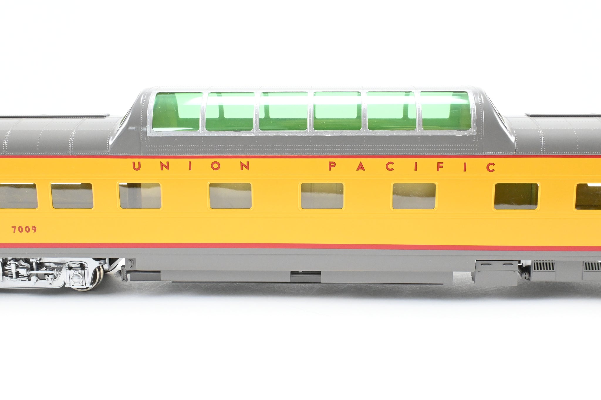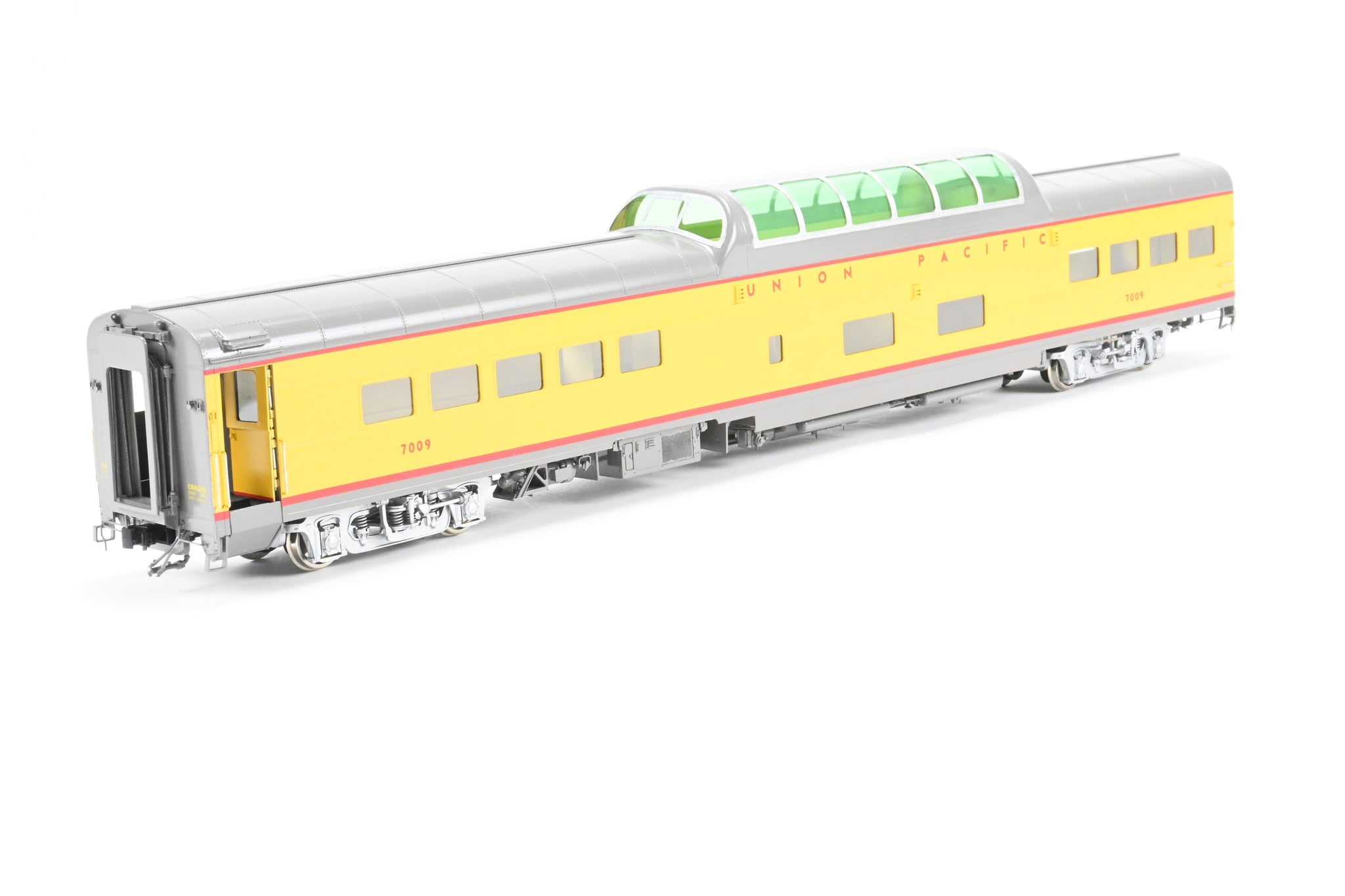 1993 run Wasatch Model Company imported model made by ACESPM in Korea. Box shows minimal shelf wear. No spare parts included. Glazing installed, including tinted glass in the dome.. All doors open: upper, lower, trap, and end doors. This car represents car Nos. 7000 - 7009. Finished as No. 7009. These dome coaches came to the U.P. in 1955 from AC&F and could seat 24 in the dome area as well as an additional 36 in the lower level. 7009 was initially assigned to the City of Portland. Later, it was used on the various Union Pacific intercontinental streamliners. It was sold to Auto Train 706 in June of 1972. A beautiful car that shows very little signs of use. A harder to find model, as only 72 of this version were imported and fewer were professionally painted.