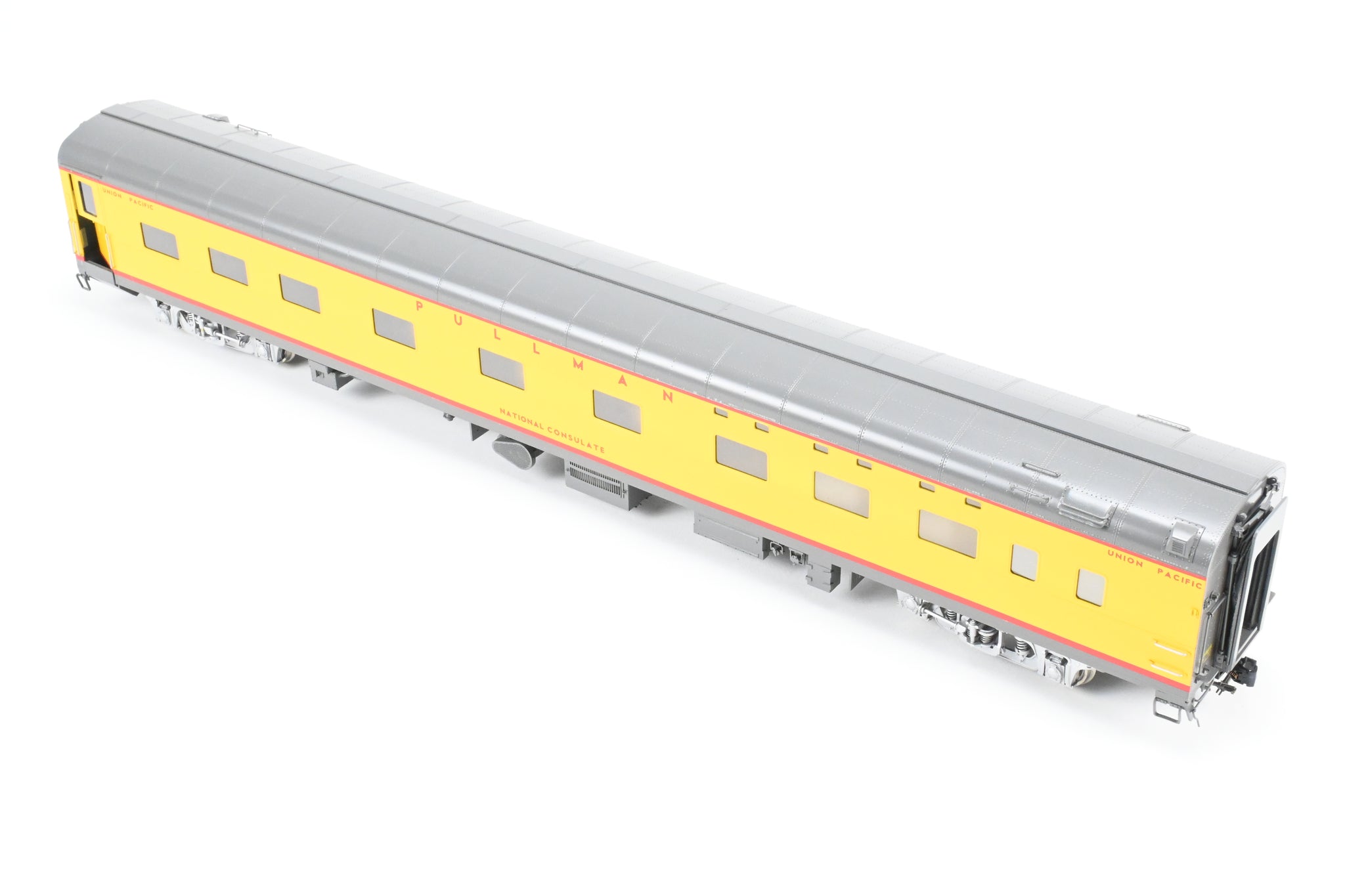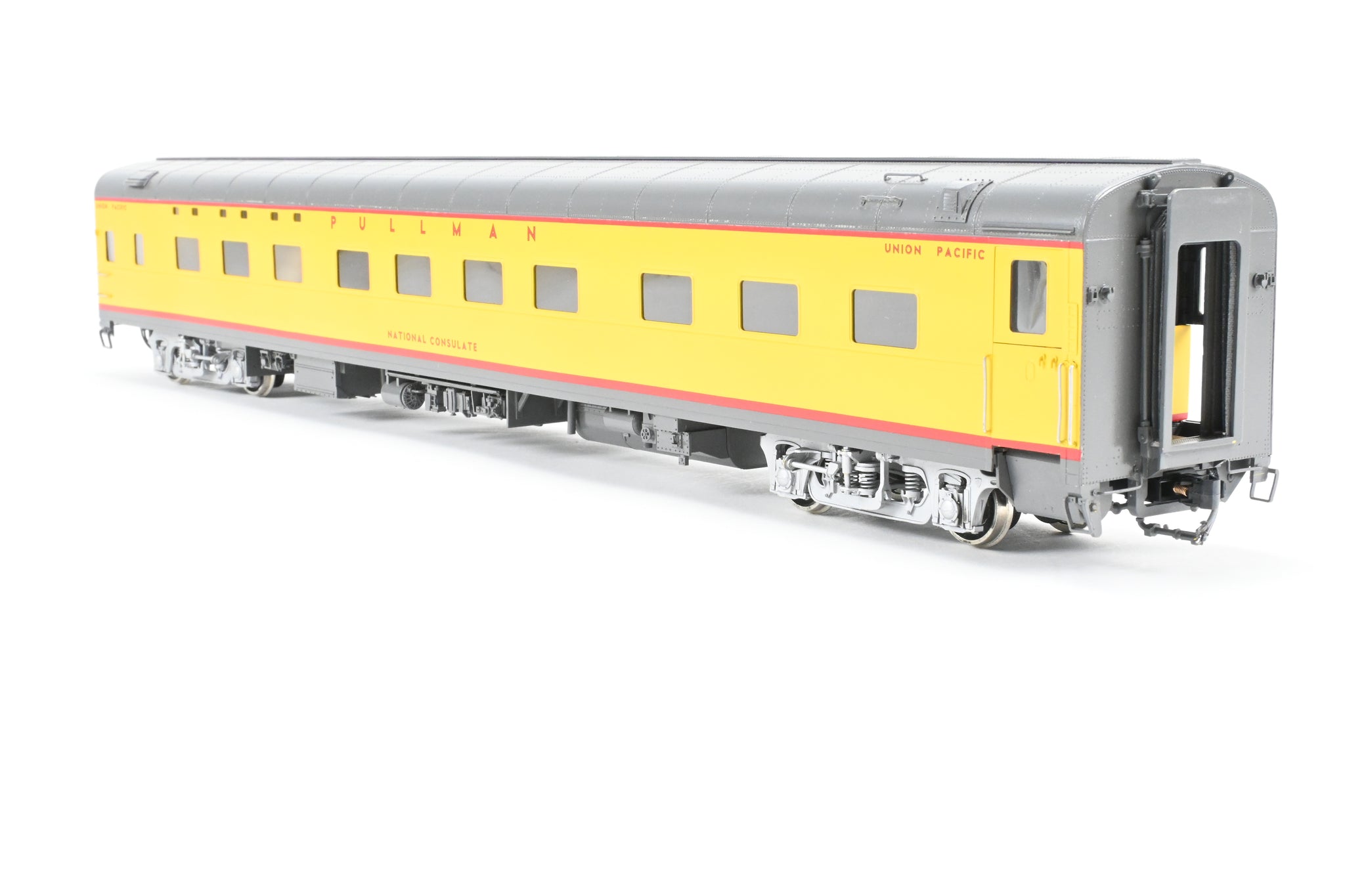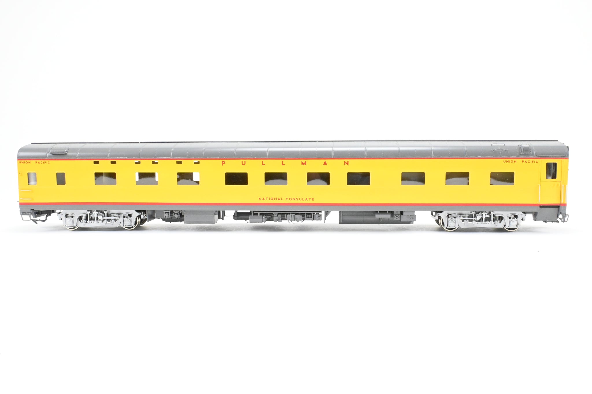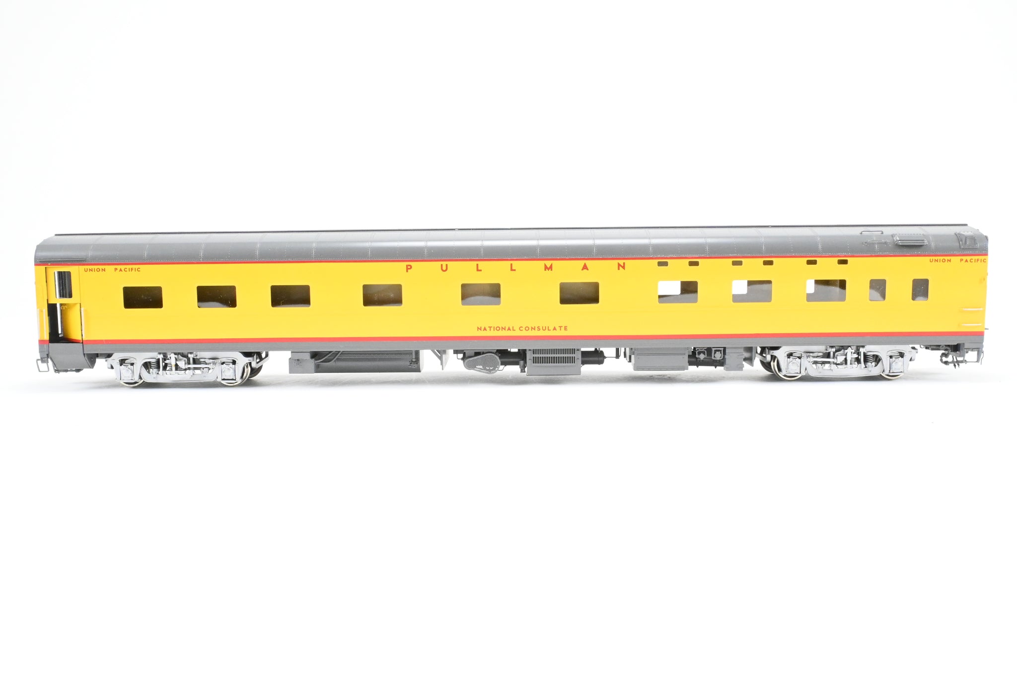 Decorated: Excellent professional paint in the Armour Yellow and Harbour Mist Grey scheme with silver painted trucks.. Road name "National Consulate".