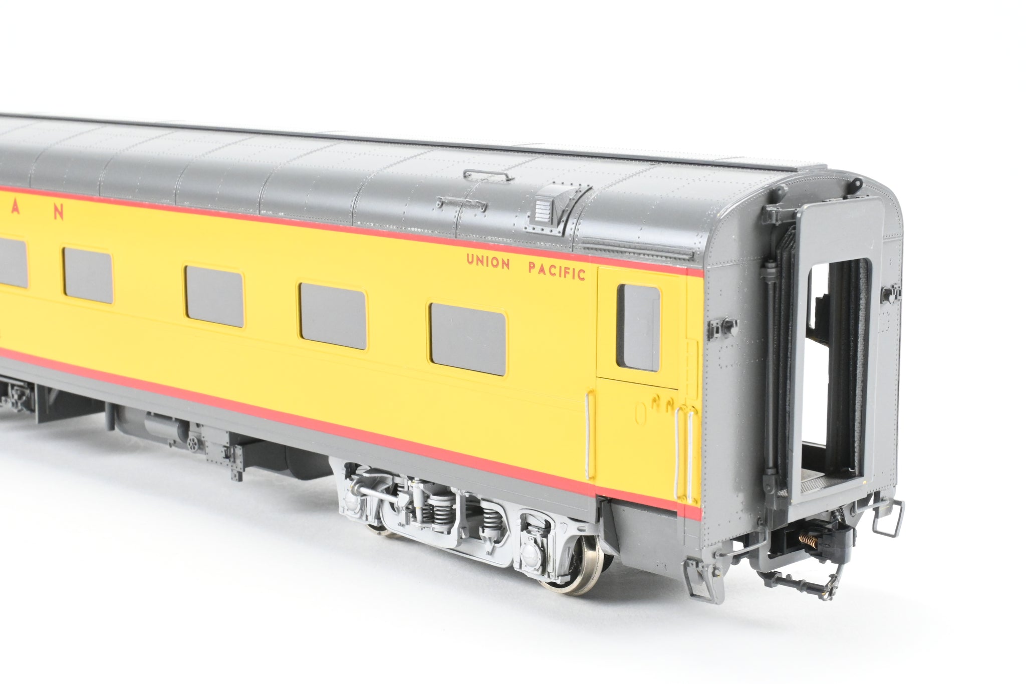 1992 run Wasatch Model Company imported model made by ACESPM in Korea. Box shows minimal shelf wear. Spare parts included. Glazing installed. All doors open: upper, lower, trap, and end doors. These National series sleepers came to the U.P. in 1956 from P-S. These were used on virtually all of the various Union Pacific intercontinental streamliners. A beautiful model that shows very little signs of use. A harder to find model, as only 54 of this version were imported and fewer were professionally painted.