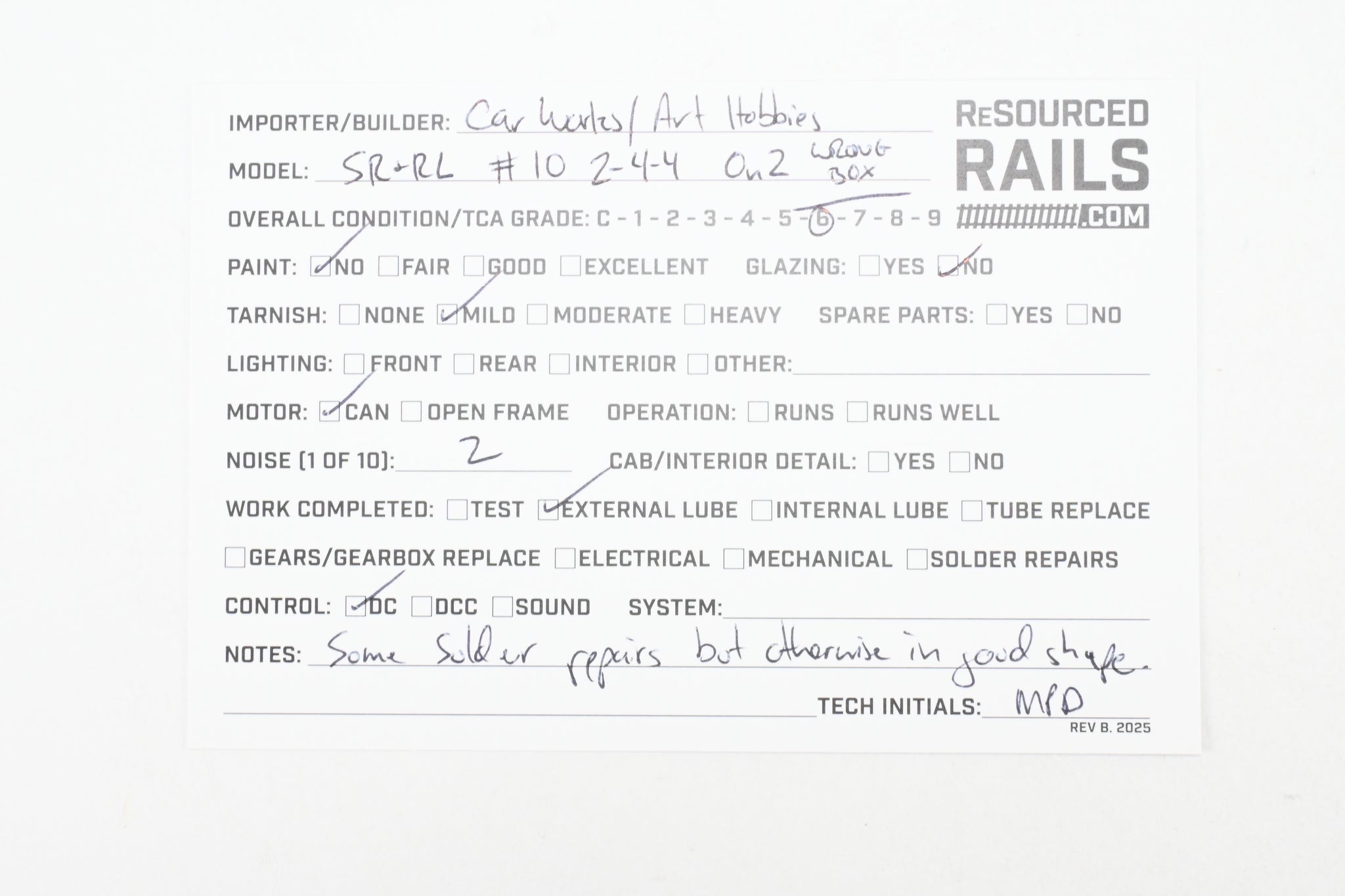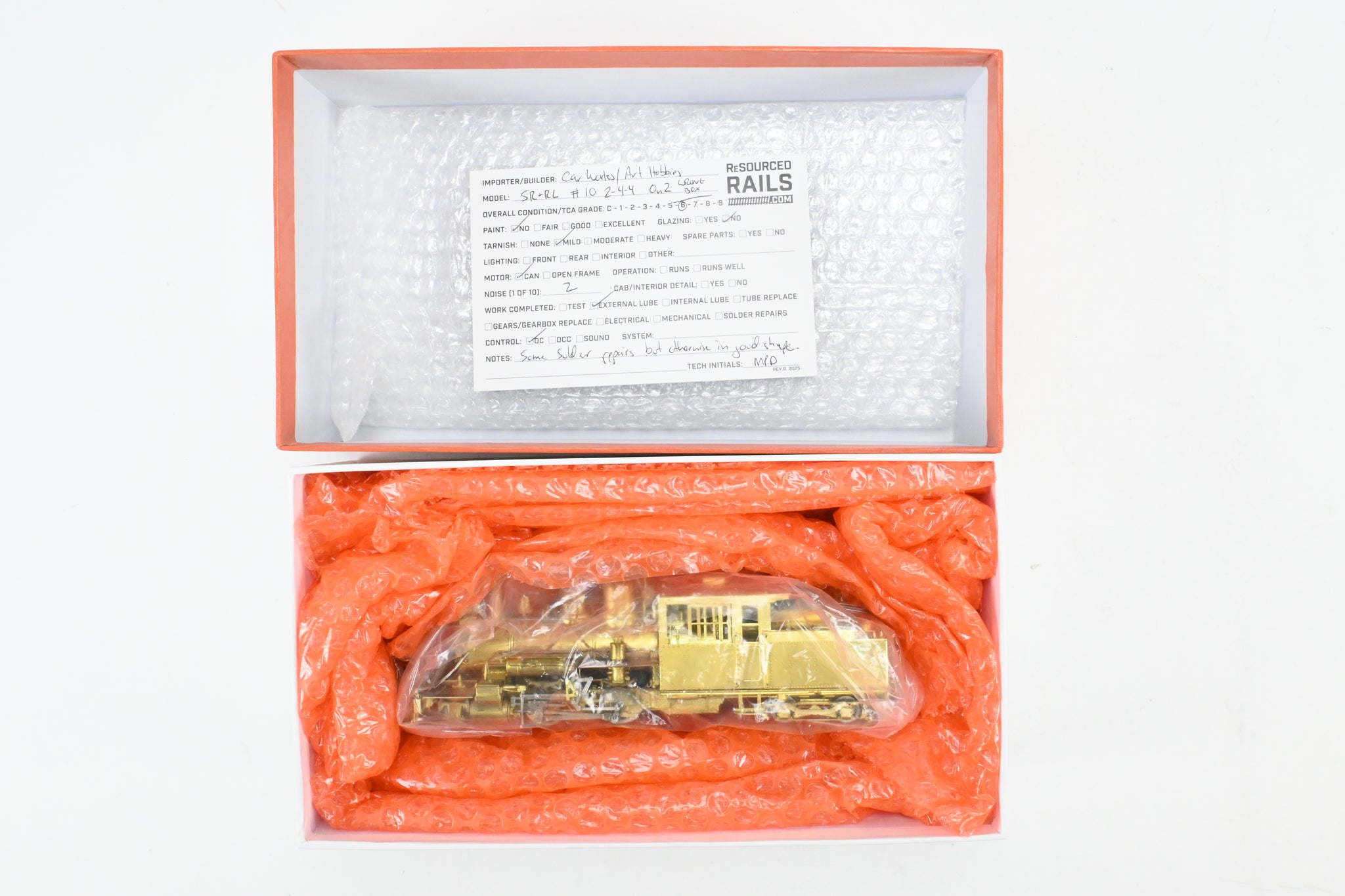 1991 run The Car Works imported model built by F. M. Models in Korea. Wrong box included but it shows very light shelf wear. Foam has been replaced with bubblewrap. No spare parts included. Model has minor tarnish. A nice model of a Forney 2-4-4T. A few minor solder repairs, but otherwise, in good shape. If you are into Maine Narrow Gauge, this model is for you!