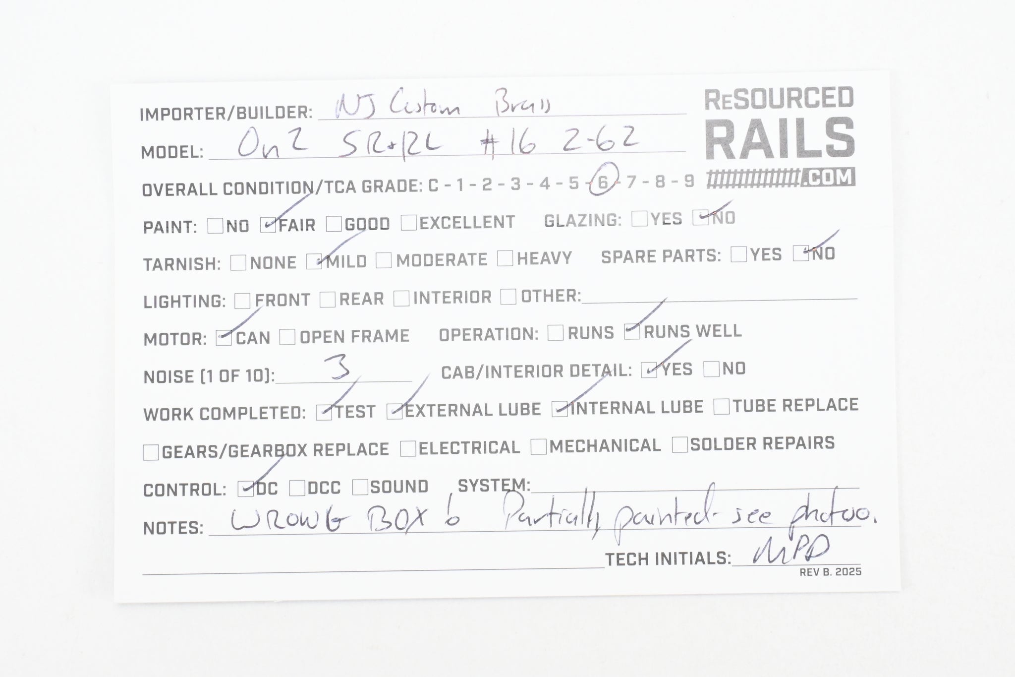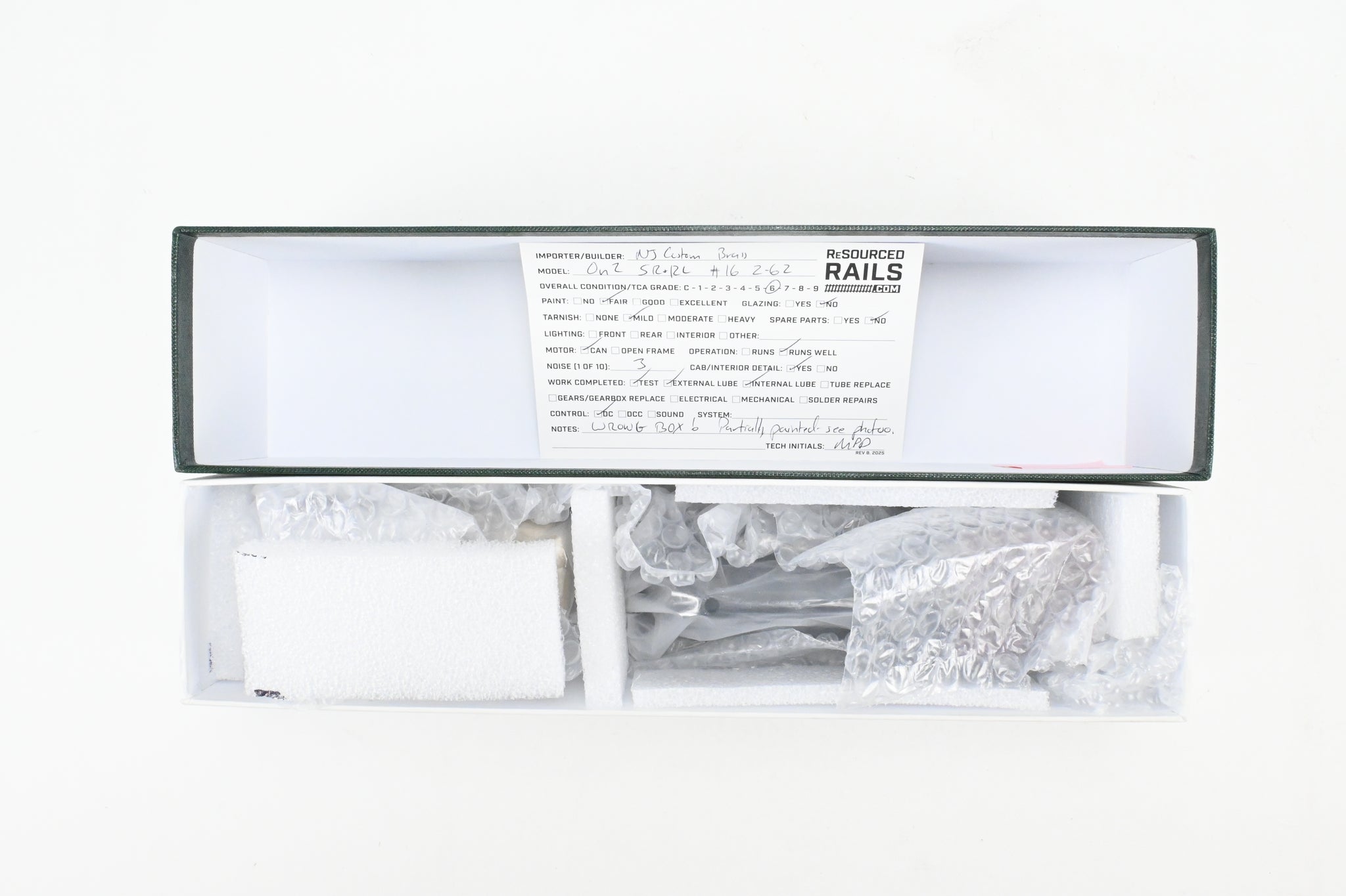 1979 run NJ Custom Brass imported model built by Dai Young in Korea. REBOXX box included but it shows very light shelf wear. Foam has been replaced with bubblewrap. No spare parts included. Recently serviced - old gearbox grease cleaned out and replaced. Paint work on the engine is fair to good with some wear. A nice model of a SR&RL Prairie. If you are into Maine Narrow Gauge, this model is for you!
