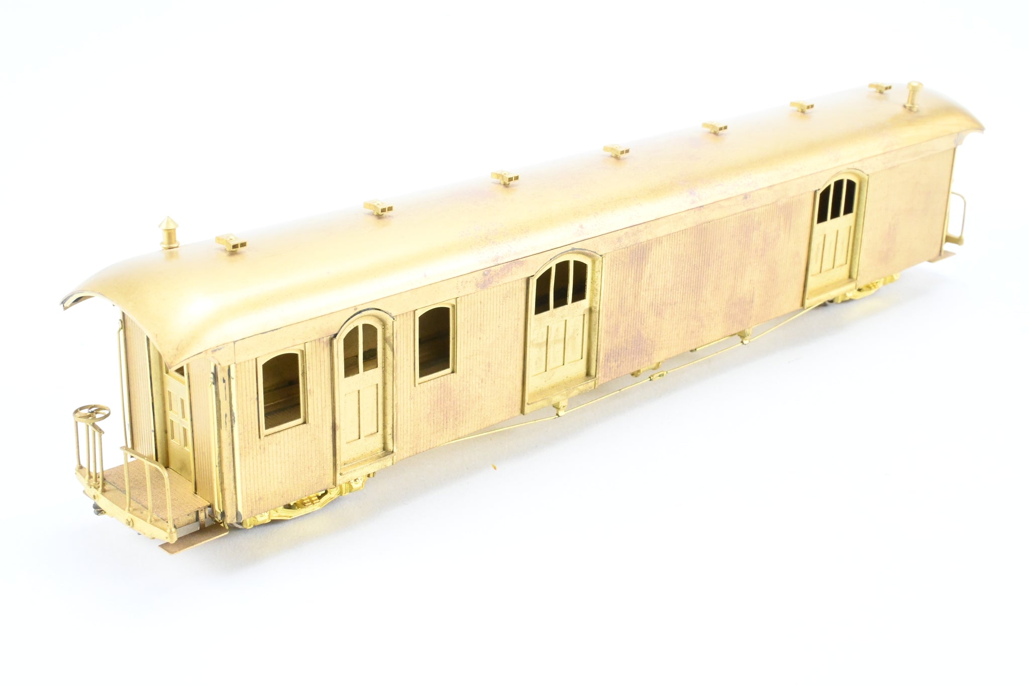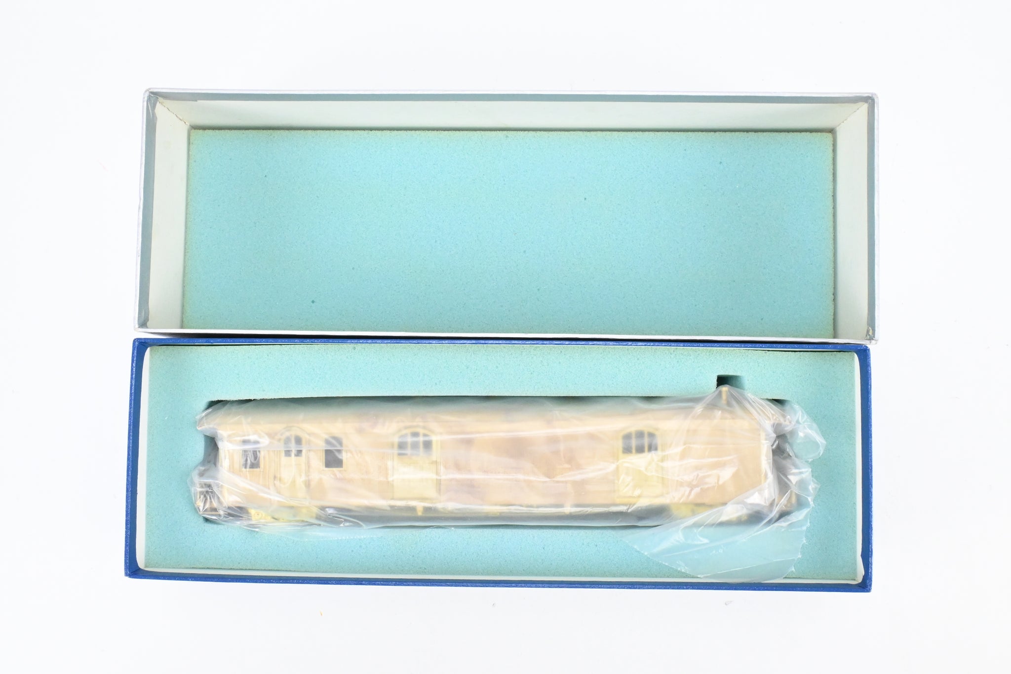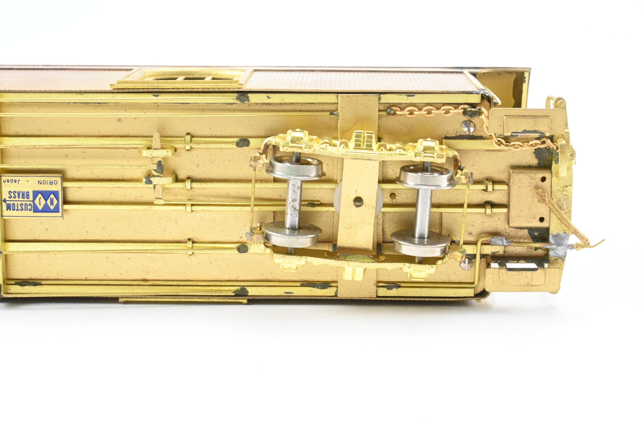 1975 run NJ custom Brass imported model made by Orion in Japan. Original box and foam show minimal shelf wear. No spare parts included. A nice model of a SR&RL baggage car. A must for any Maine "Two Footer".